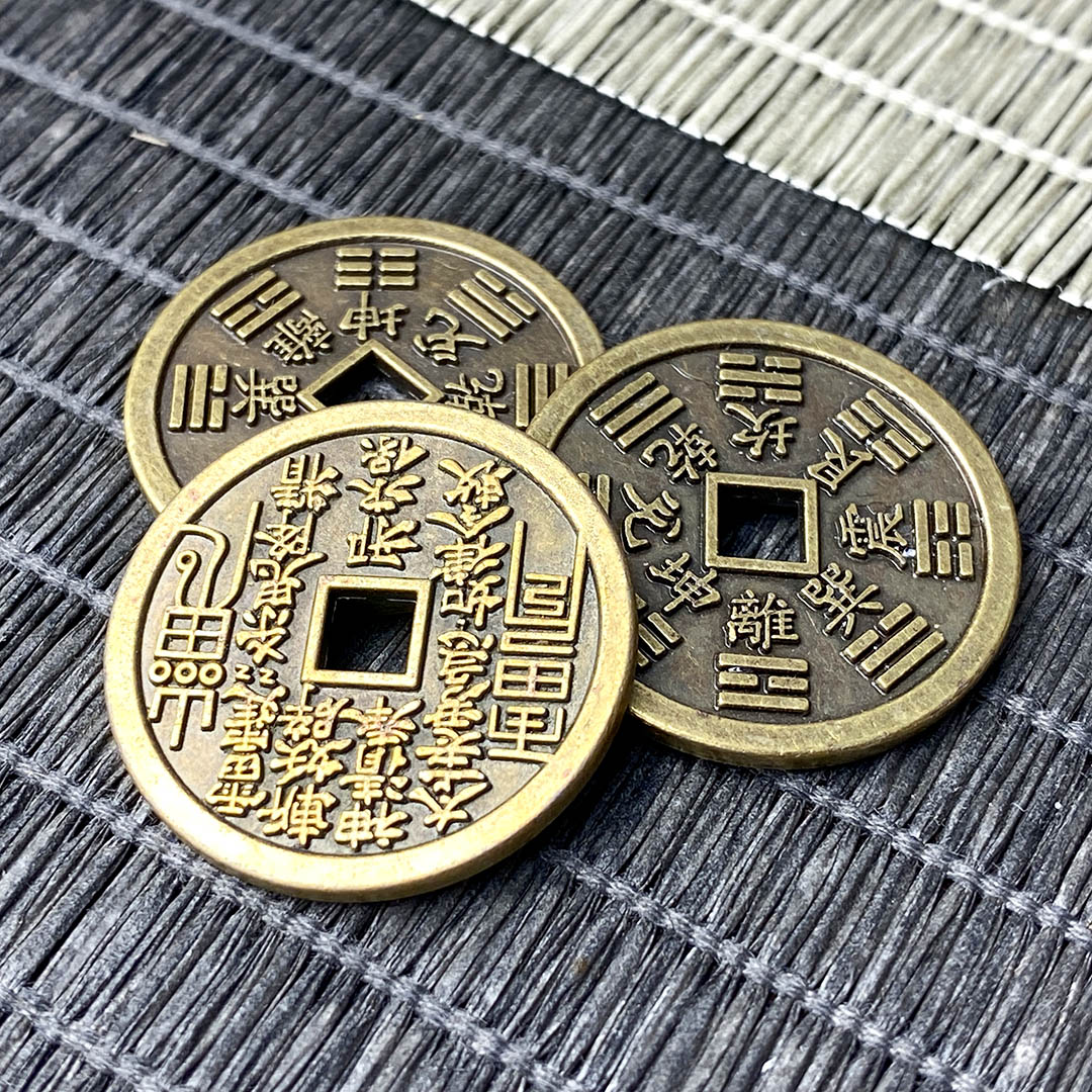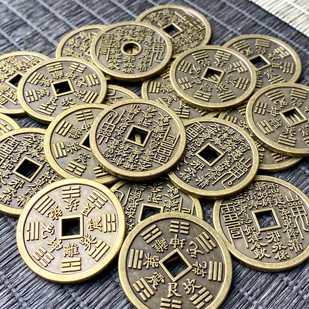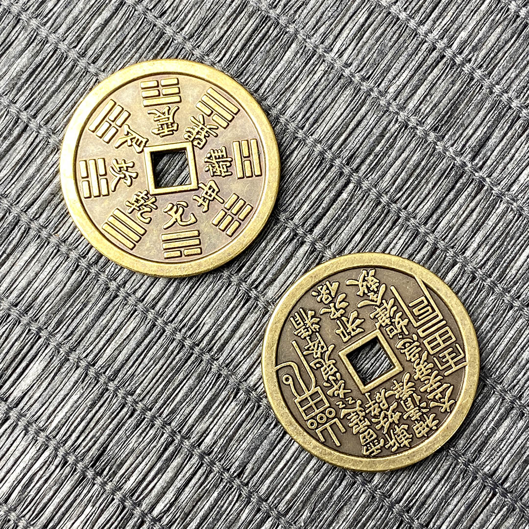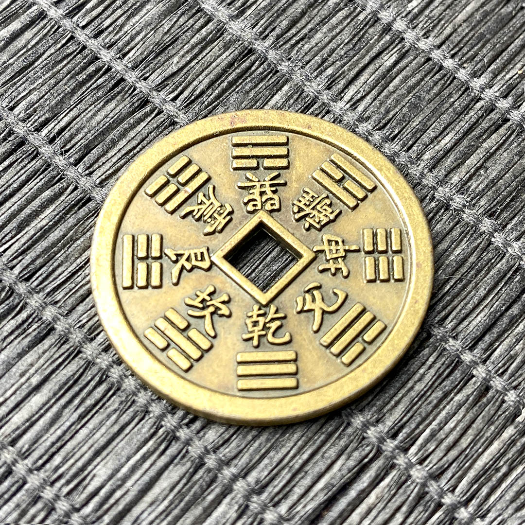 На одной стороне изображены триграммы из «Книги Перемен» (И Цзин). Каждая триграмма состоит из трёх линий — цельных (ян) или прерывистых (инь). Они символизируют природные силы и стихии.