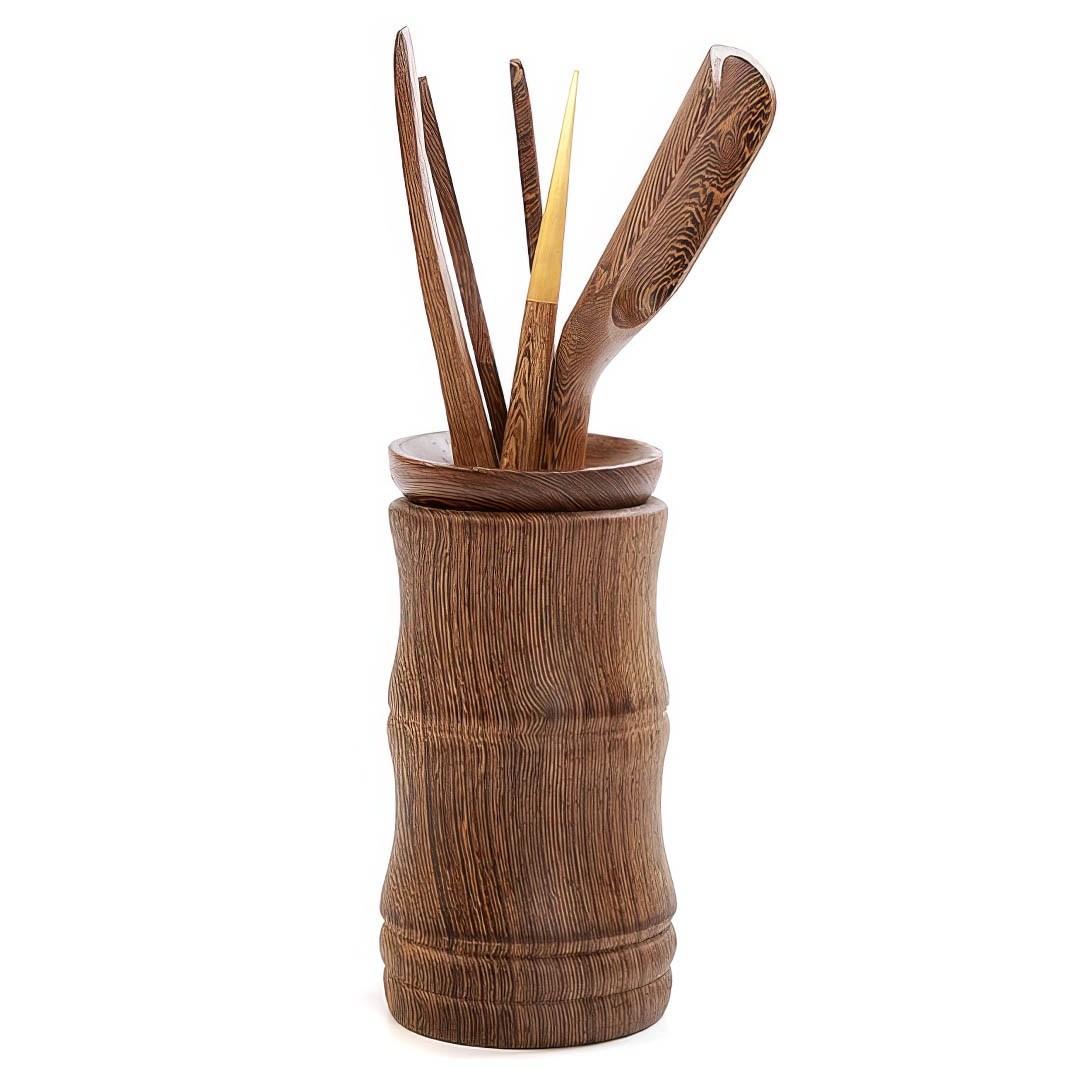 Набор инструментов для чайной церемонии с красивой текстурой темного дерева из пяти предметов, а именно: шило, пинцет, лопатка, ложка, воронка.
