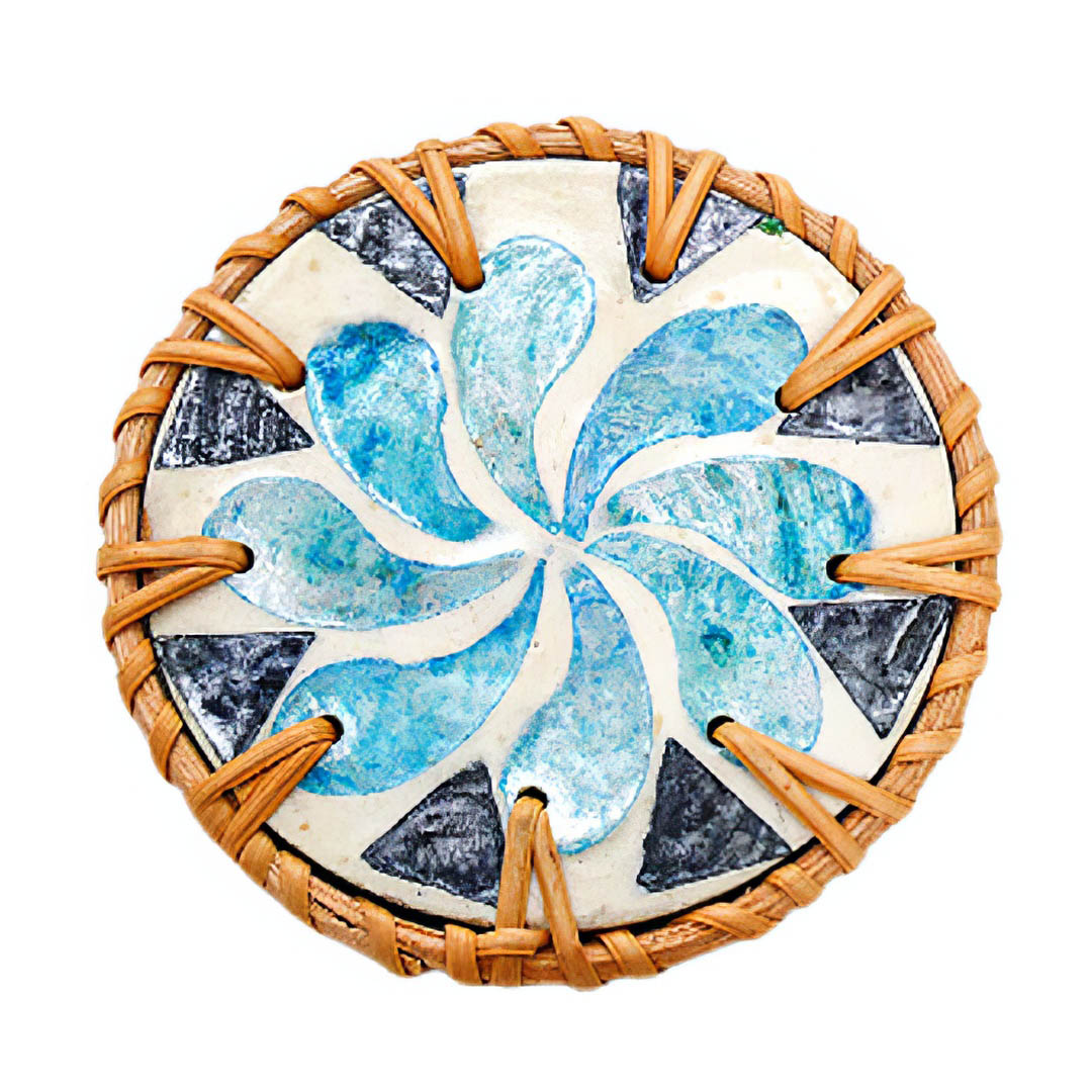 Керамическая подставка для пиал. Позволяет держать в чистоте и опрятности ваше чайное пространство. Основа — керамика, с мозаичным изображением цветка. По диаметру окружности плетение из ротанга, выглядит красиво и лаконично, защищает подставку и поверхность от царапин и потертостей.