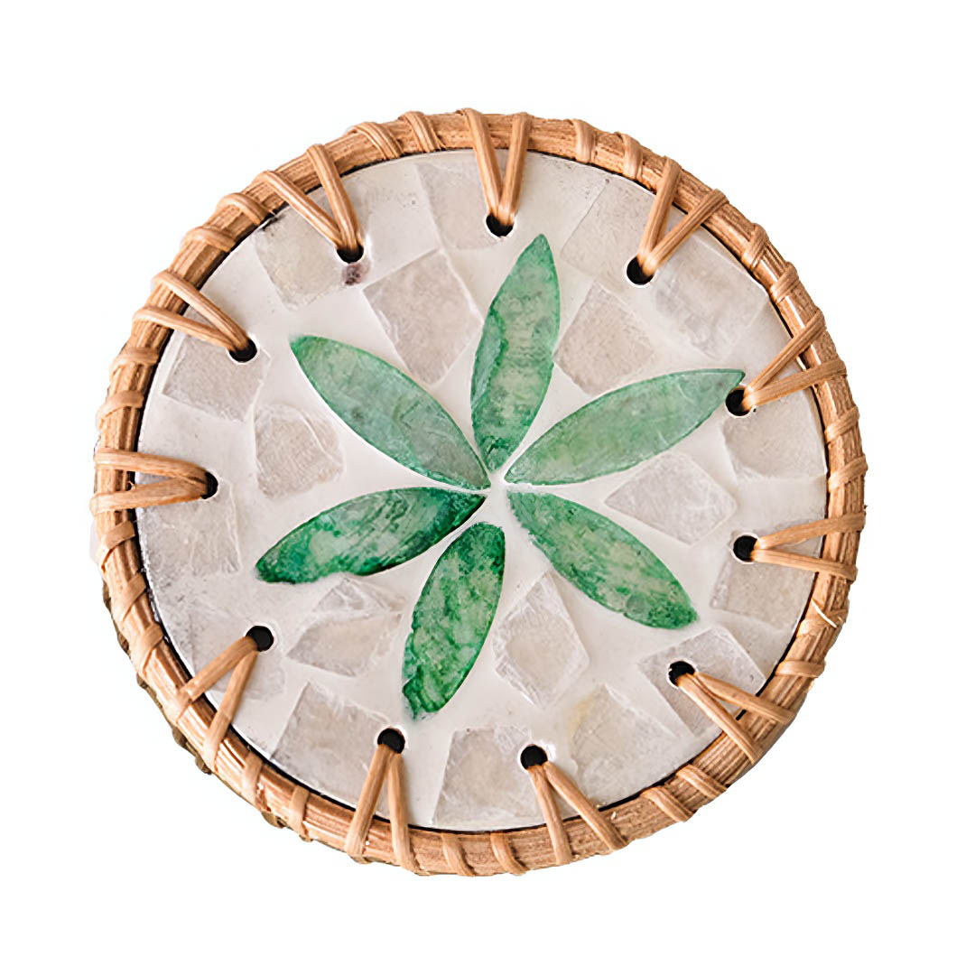 Керамическая подставка для пиал. Позволяет держать в чистоте и опрятности ваше чайное пространство. Основа — керамика, с мозаичным изображением цветка. По диаметру окружности плетение из ротанга, выглядит красиво и лаконично, защищает подставку и поверхность от царапин и потертостей.
