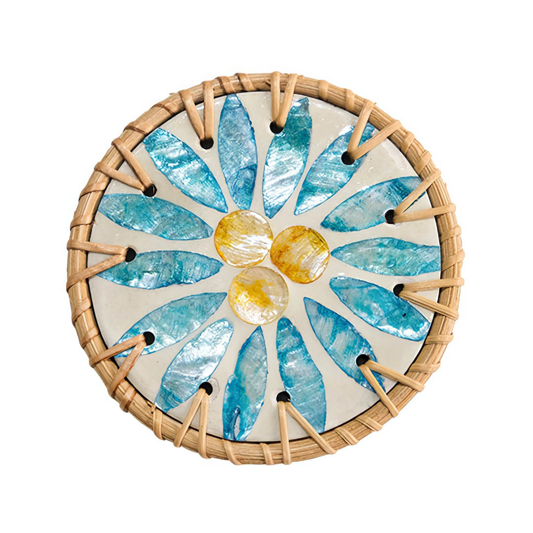Керамическая подставка для пиал. Позволяет держать в чистоте и опрятности ваше чайное пространство. Основа — керамика, с мозаичным изображением цветка. По диаметру окружности плетение из ротанга, выглядит красиво и лаконично, защищает подставку и поверхность от царапин и потертостей.