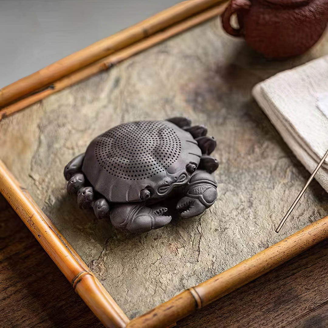 Сито из глины с подставкой для чайной церемонии.Краб в китайской символике олицетворяет устойчивость и защиту благодаря своему панцирю, а его способность двигаться боком ассоциируется с гибкостью. Он также символизирует богатство и гармонию из-за созвучия слов xiè (краб) и xié (гармония). В даосской традиции краб связывается с Луной и долголетием, так как, линяя, он будто обновляет свою жизнь.Материал: глина.Размеры: 9 х 8 х 3 см.Сито: 7,5 х 2,2 см.Приятного чаепития! Читать полностью