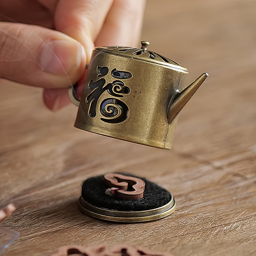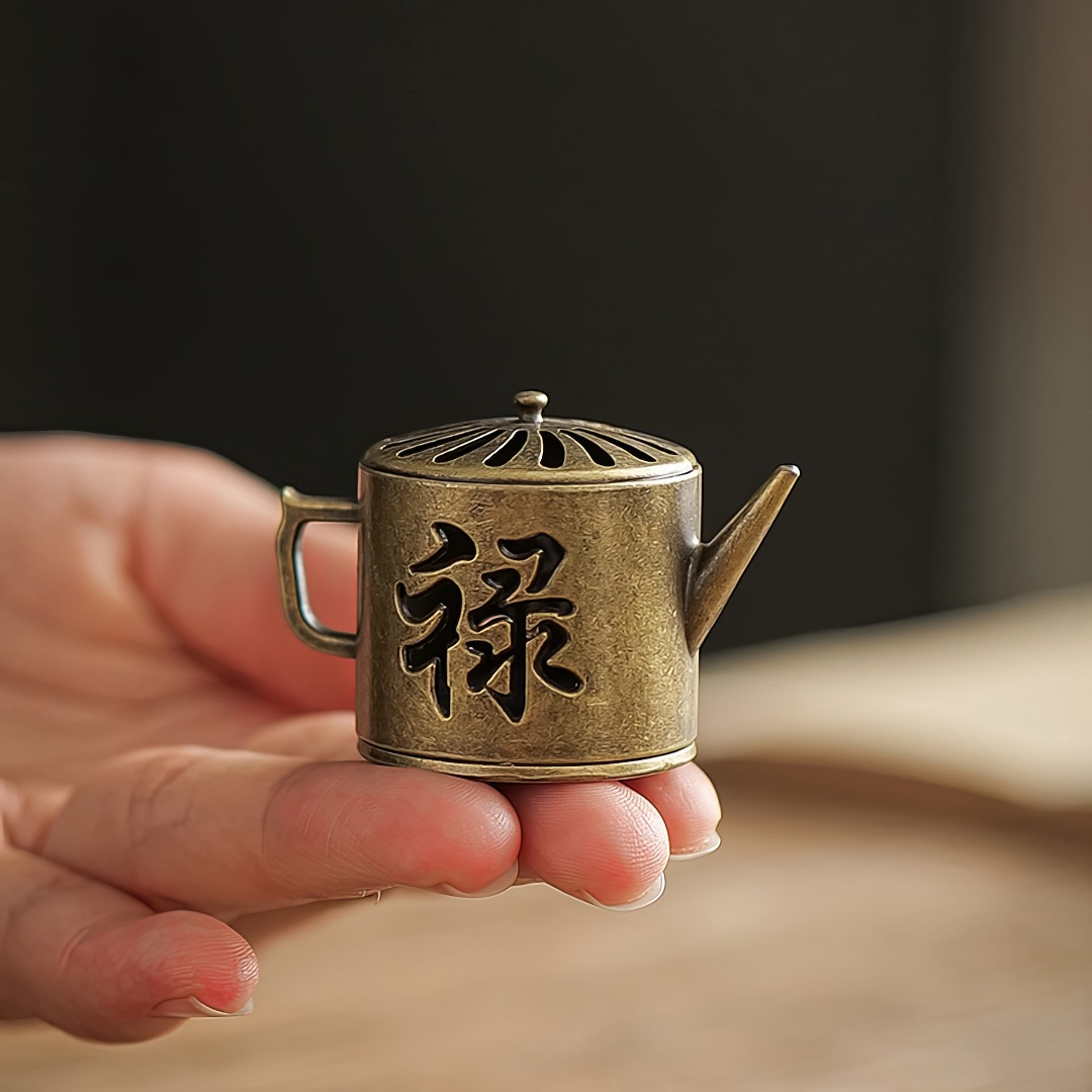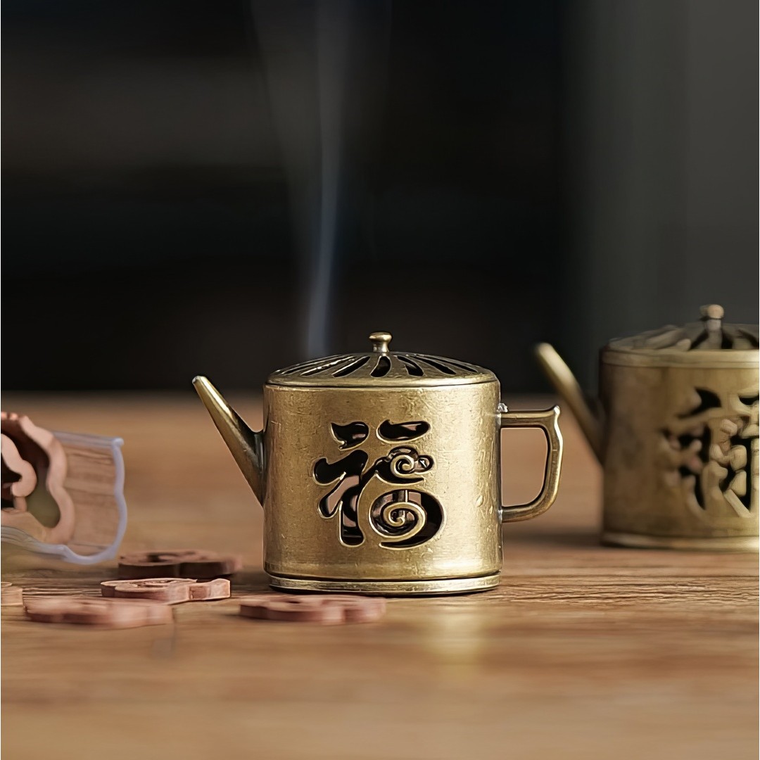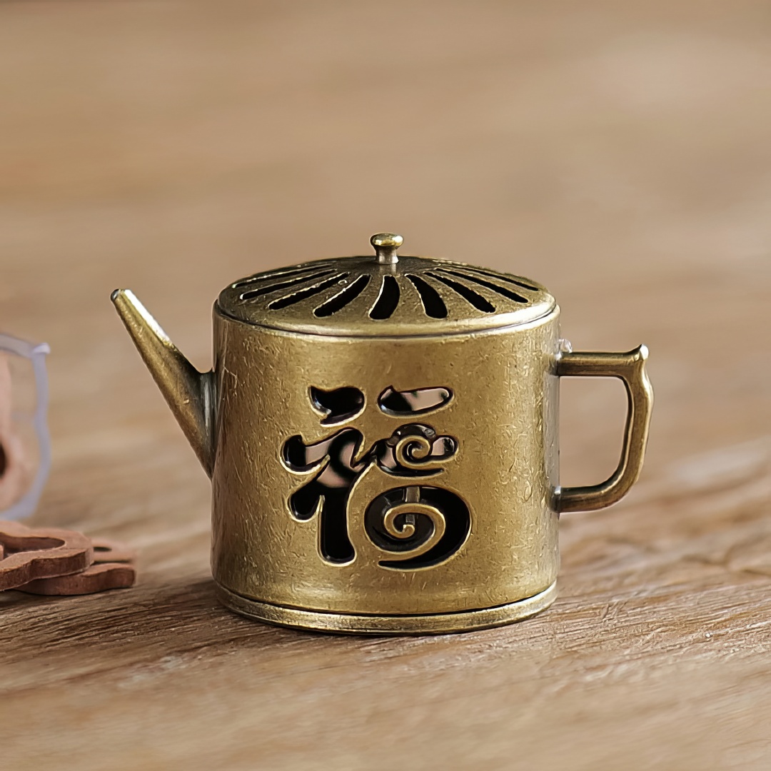 Металлическая курильница. Выполнена в виде чайника. Украшена иероглифом, который переводится как Счастье.