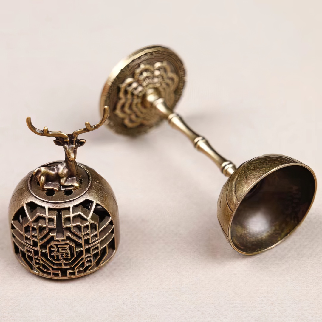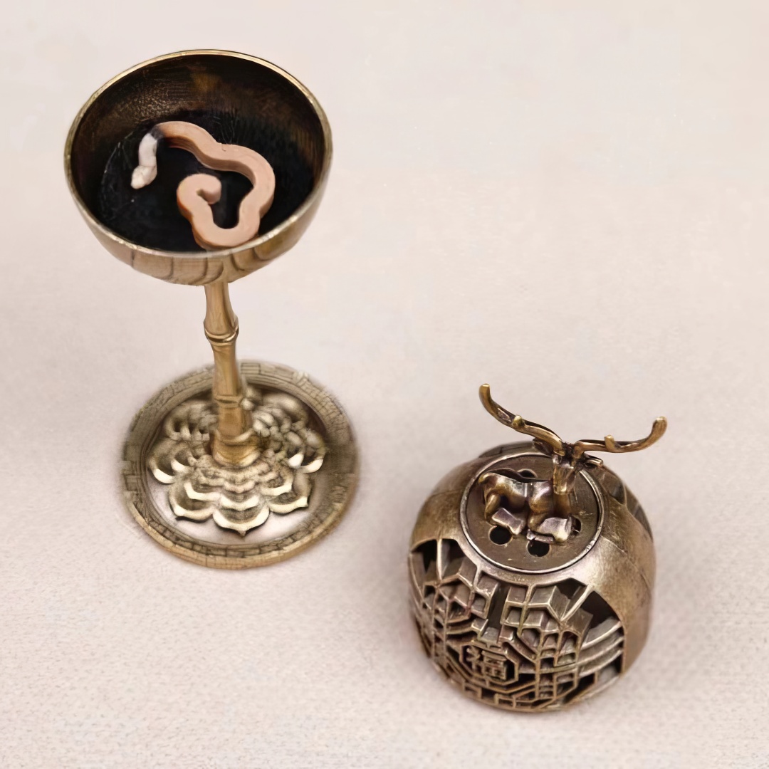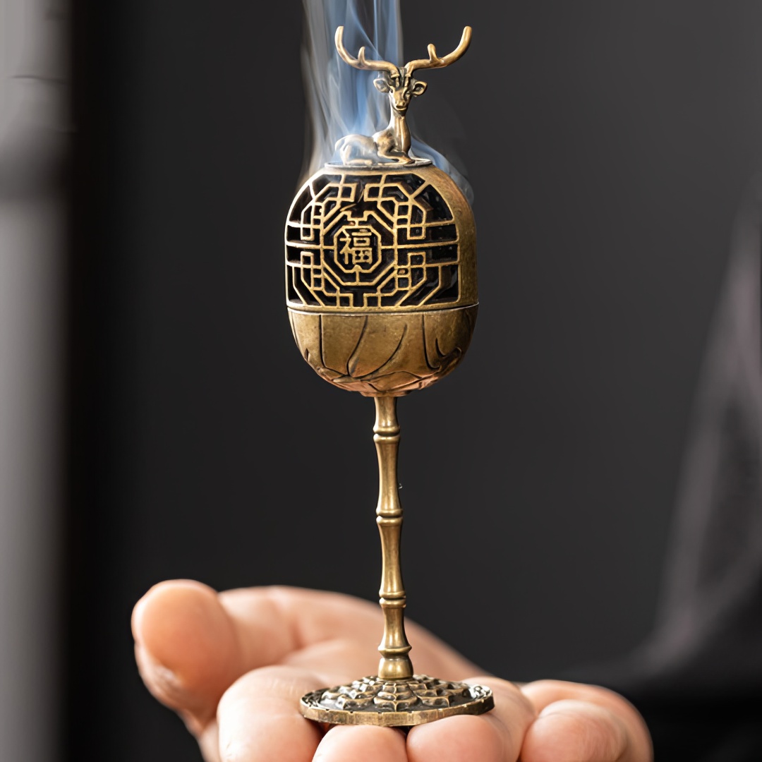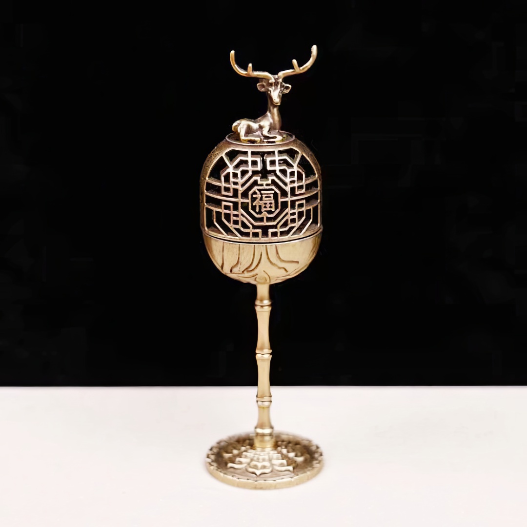 Металлическая курильница. Выполнена в виде Дворцового Фонаря, где на самом верху расположился Благородный Олень. В китайской культуре — символ долголетия, богатства и карьерного успеха. Почитается как благоприятное существо, несущее удачу и счастье.