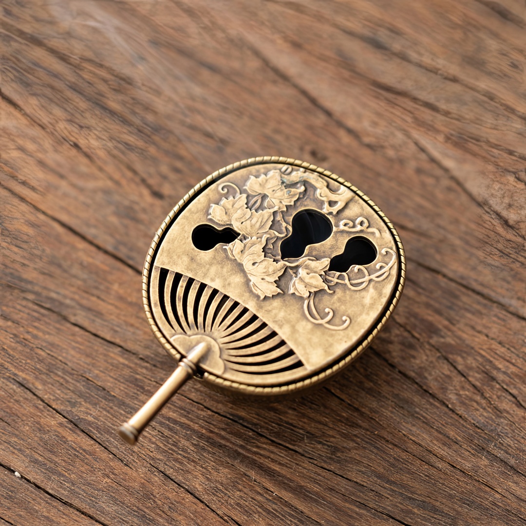 Металлическая курильница. Выполнена в виде веера, с изображением Тыквы горлянки. Она является символом хранилища спасительных для человека добрых жизненных сил.
