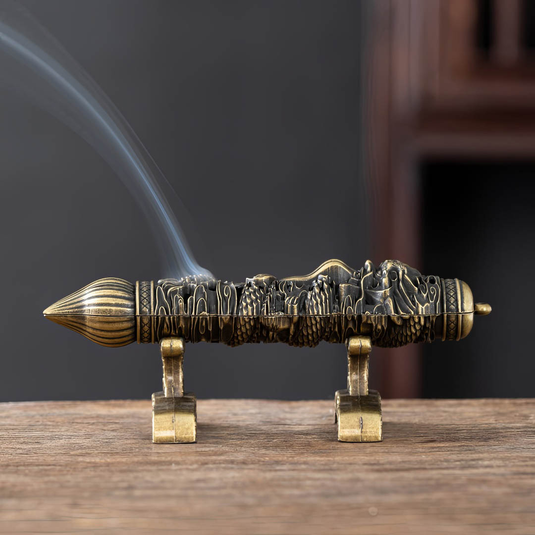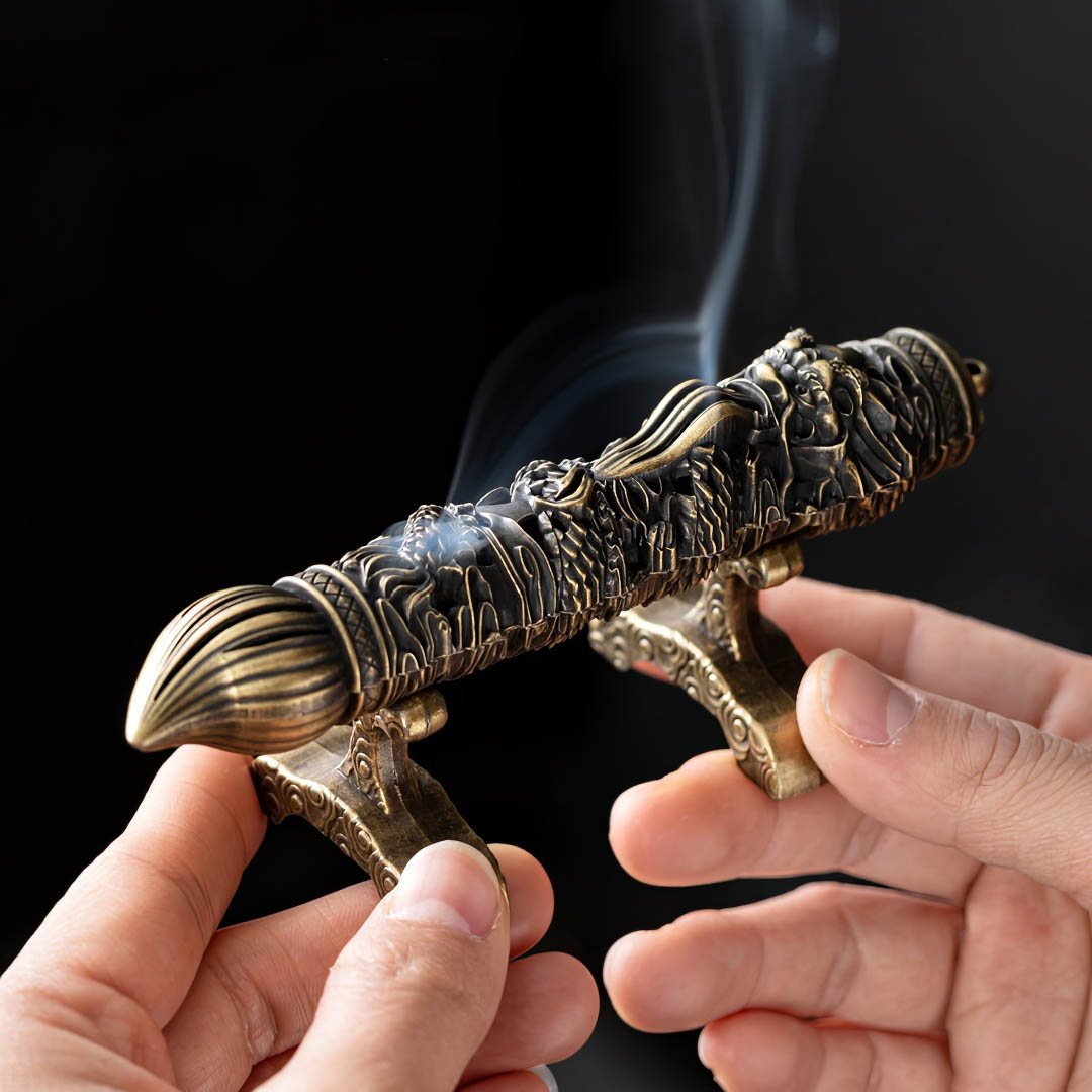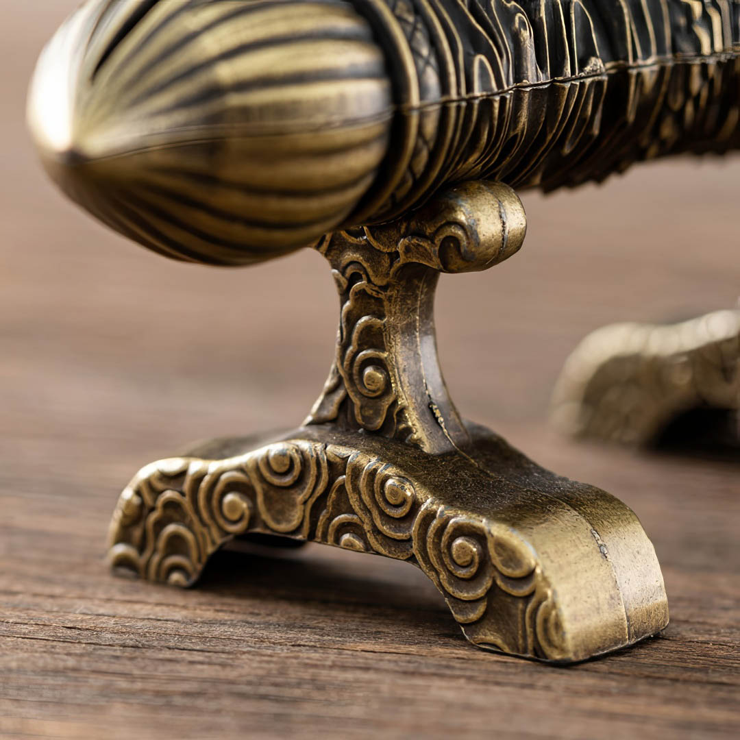 Металлическая курильница.Украшена изображением Дракона, летящего в облаках и извергающего пламя — это архетипическая картина достижения наивысшего успеха, могущества и реализации.В комплекте огнеупорная подушечка.Материал: металл.Размеры: 15 х 4,5 х 5,5 см.Желаем вам благополучия! Читать полностью