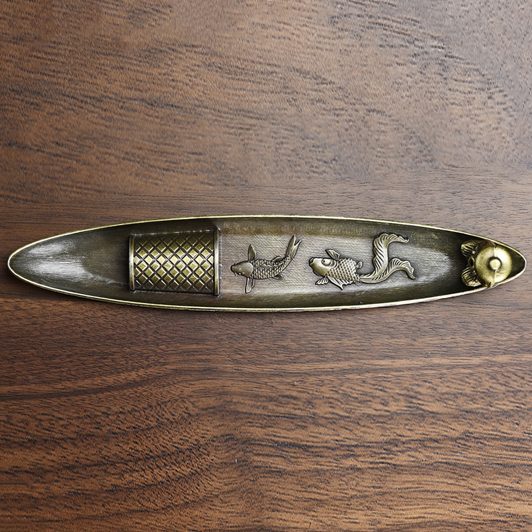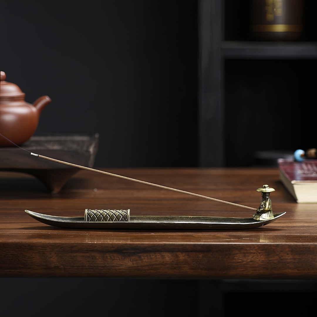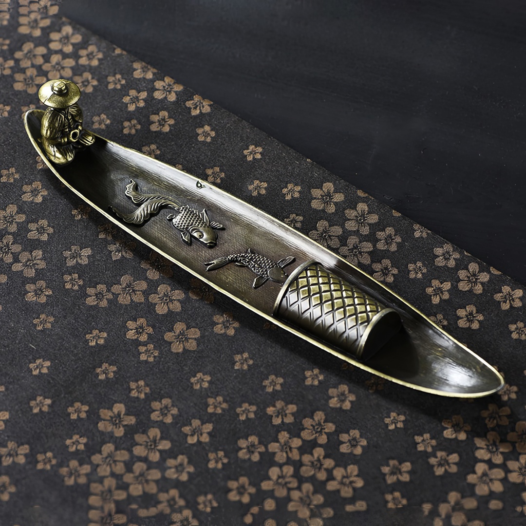 Металлическая подставка для аромапалочек. Выполнена в виде традиционной китайской лодки, на которой расположился Рыбак.