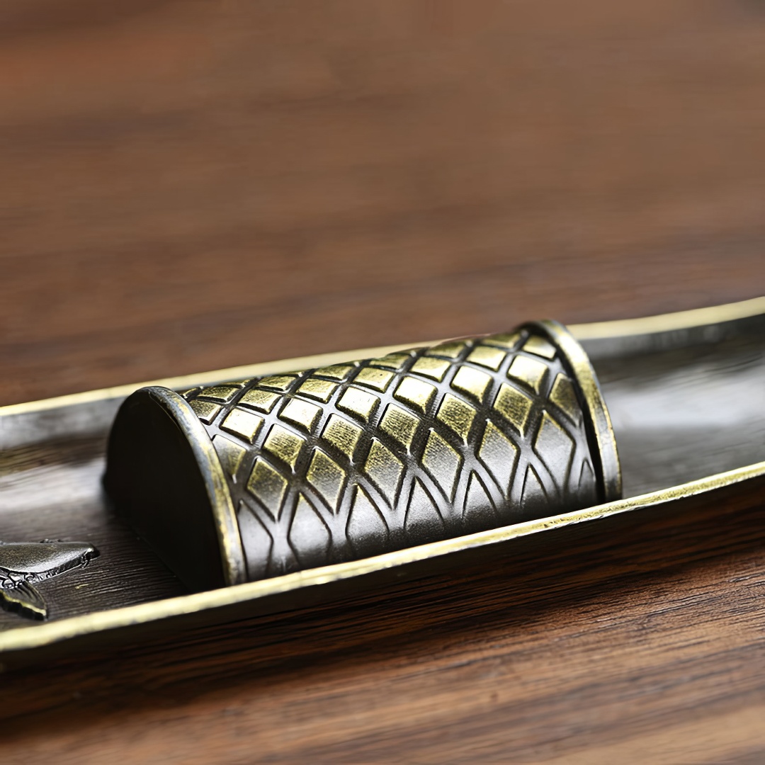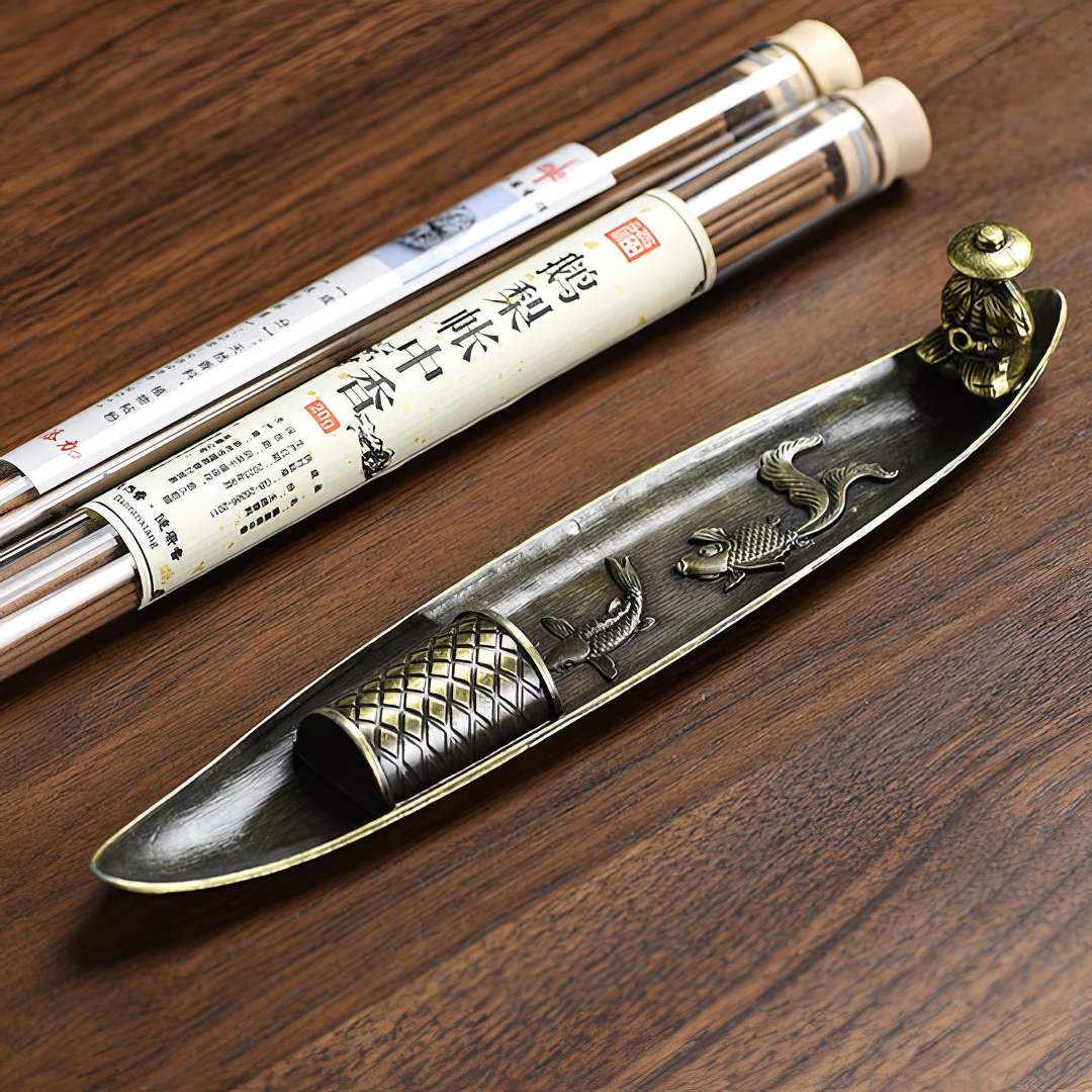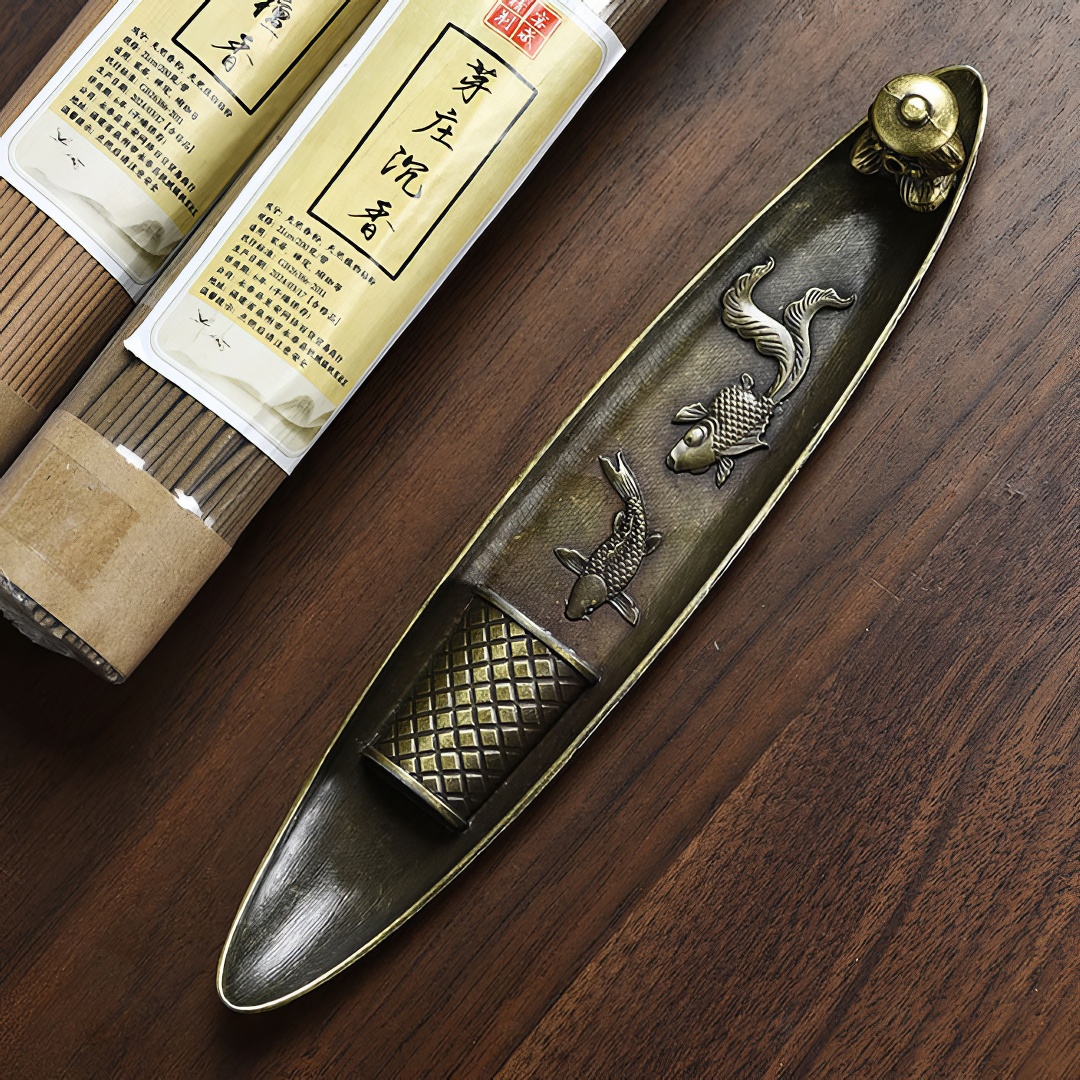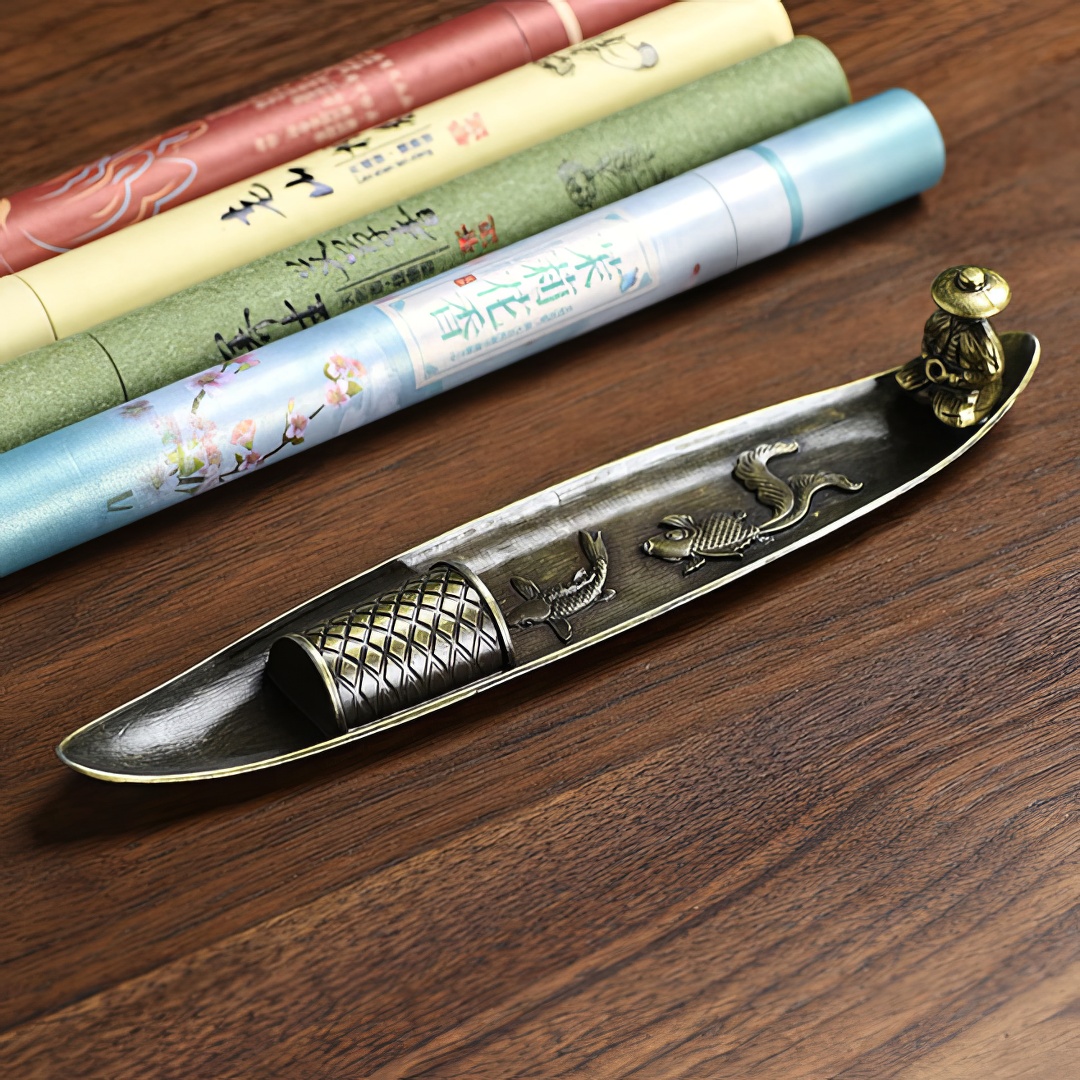 Металлическая подставка для аромапалочек. Выполнена в виде традиционной китайской лодки, на которой расположился Рыбак.