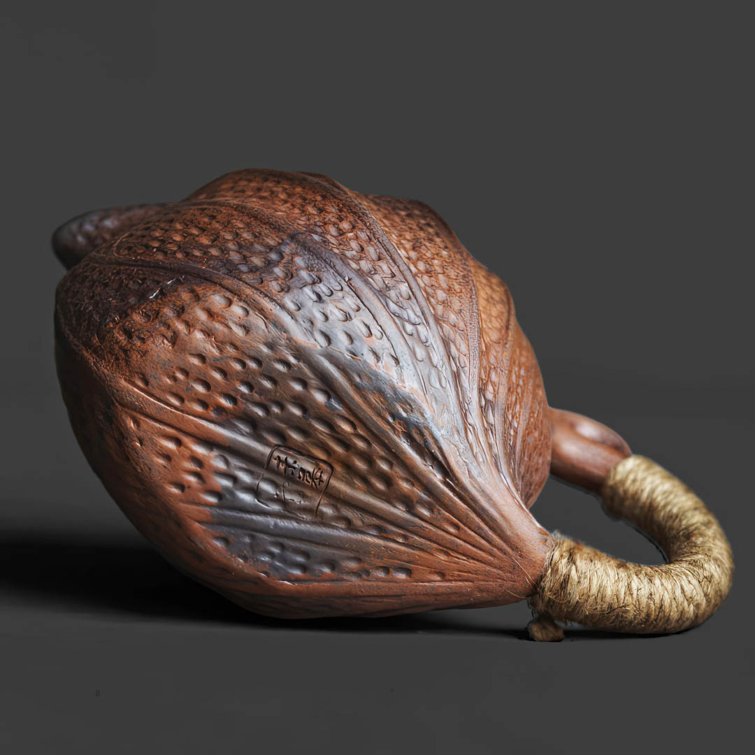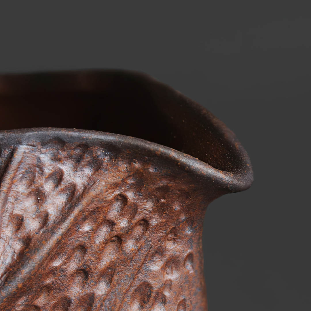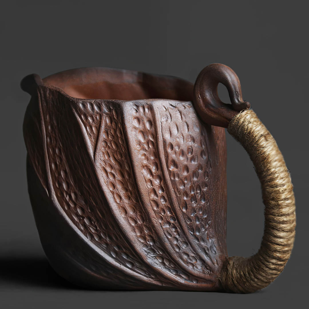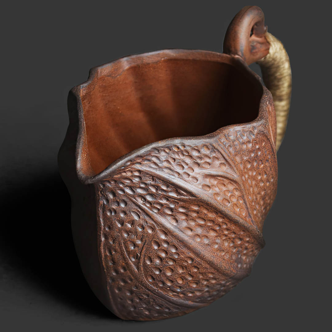 Стенки чуть тоньше средних. Форма вдохновлена кувшинкой. Ручка обмотана веревочным плетением и помимо эстетической составляющей, защищает пальцы от возможного нагревания изделия.