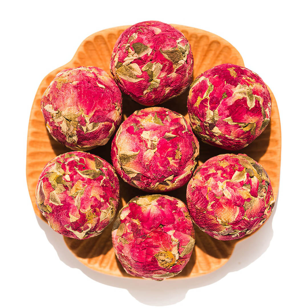 Цветочный чай, названный, благодаря своей форме, “Жемчужина Дракона”. Можно использовать как для заваривания, так и для создания композиций цветов и чая.