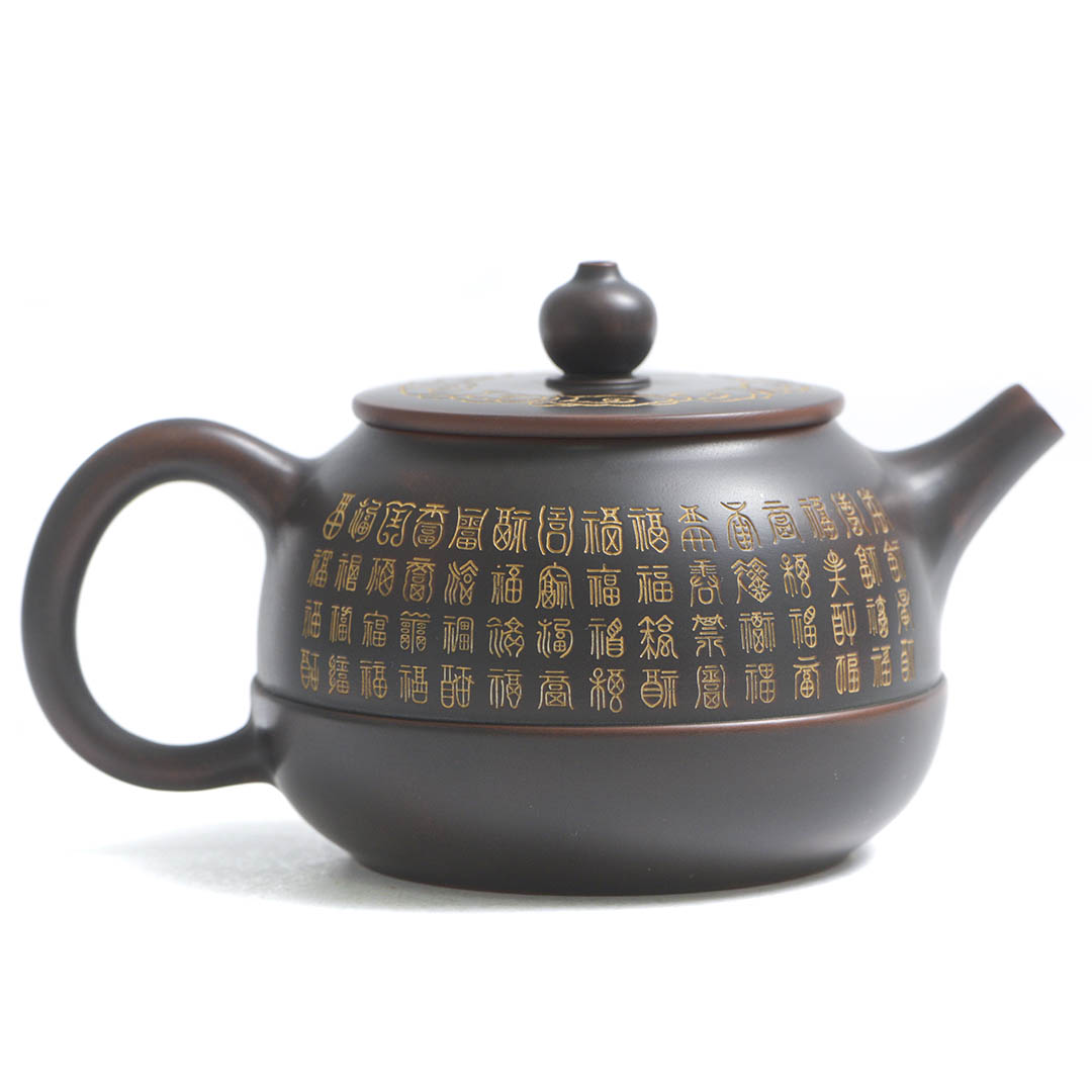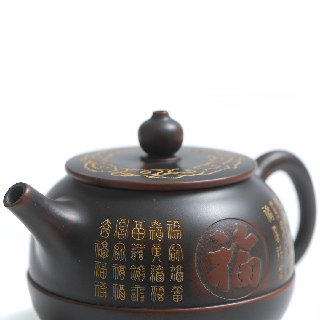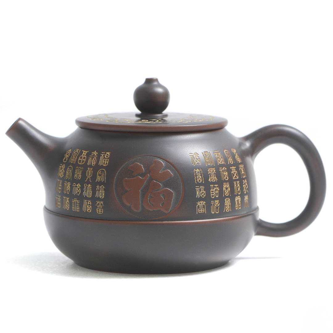Чайник украшен рельефными иероглифами, обозначающими Стократное Счастье – это пожелание, наполненное глубоким смыслом в китайской культуре, символизирующее изобилие, гармонию и бесконечное благополучие. Число "сто" (百) усиливает значение, выражая идею полноты и многократного умножения счастья. Это выражение часто звучит в праздники, свадьбы и важные моменты жизни, а иероглиф "счастье" (福) становится символом удачи, украшая дома и сердца. Оно напоминает о том, что счастье — это не только материальное богатство, но и духовная гармония, здоровье и радость, умноженные во сто крат.