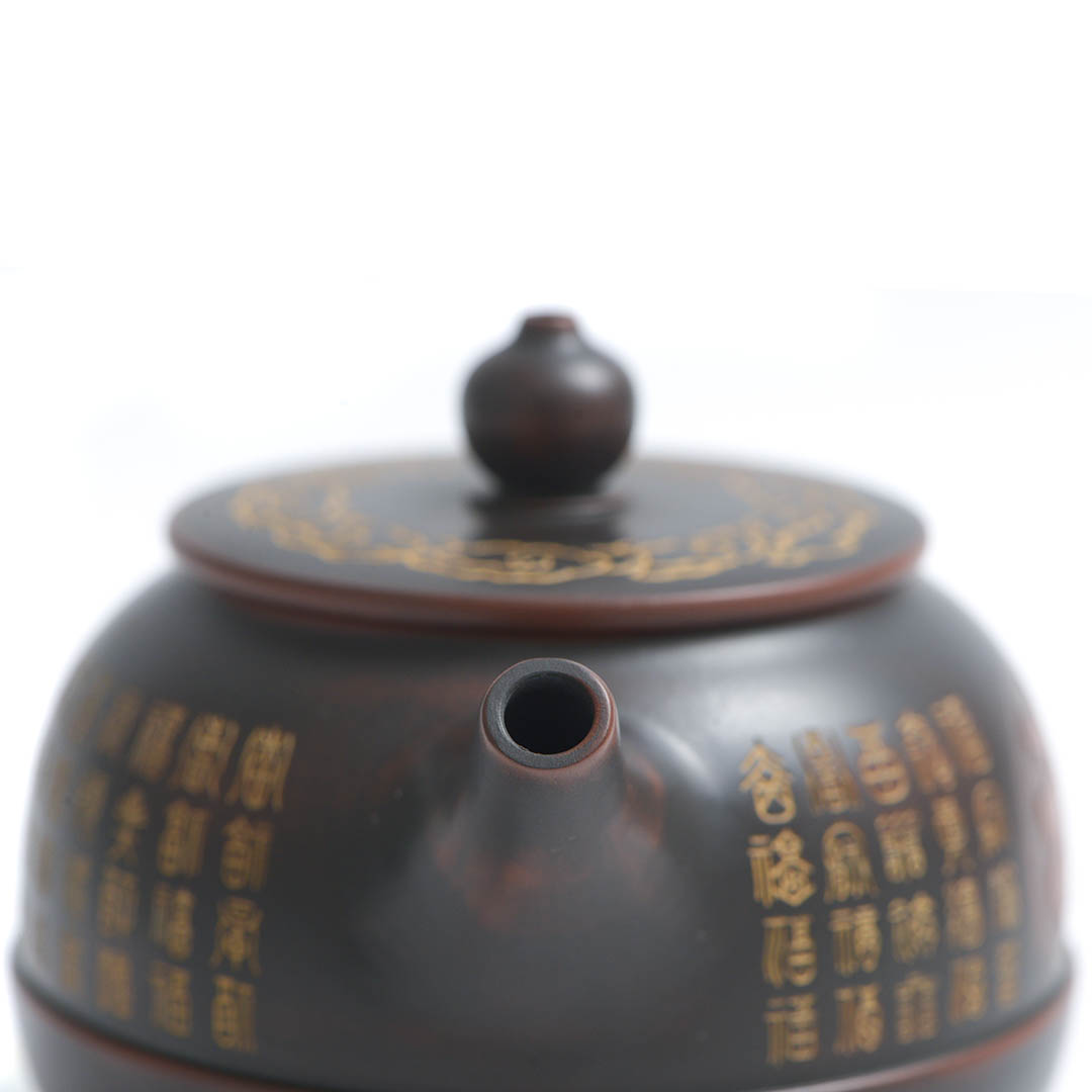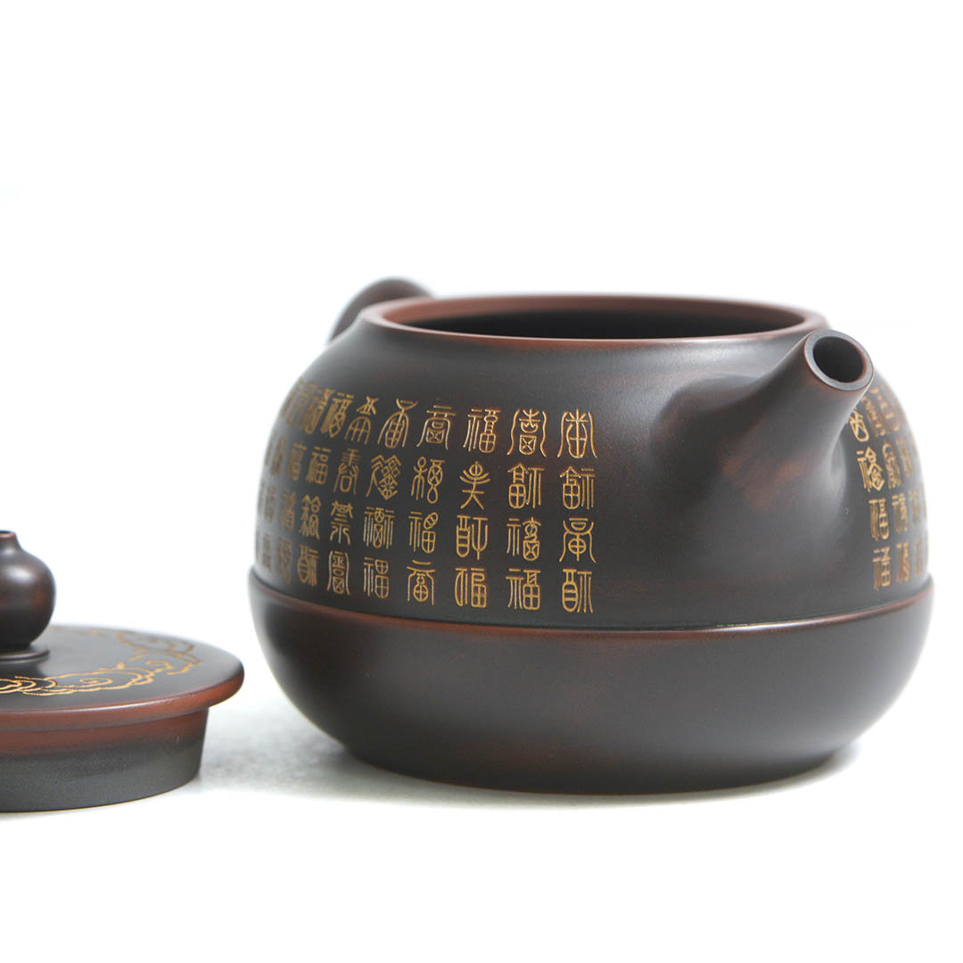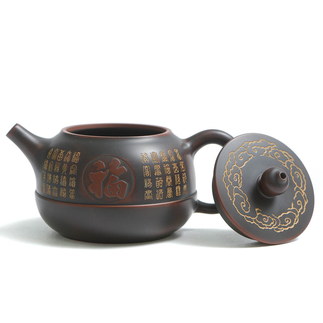 Чайник украшен рельефными иероглифами, обозначающими Стократное Счастье – это пожелание, наполненное глубоким смыслом в китайской культуре, символизирующее изобилие, гармонию и бесконечное благополучие. Число "сто" (百) усиливает значение, выражая идею полноты и многократного умножения счастья. Это выражение часто звучит в праздники, свадьбы и важные моменты жизни, а иероглиф "счастье" (福) становится символом удачи, украшая дома и сердца. Оно напоминает о том, что счастье — это не только материальное богатство, но и духовная гармония, здоровье и радость, умноженные во сто крат.