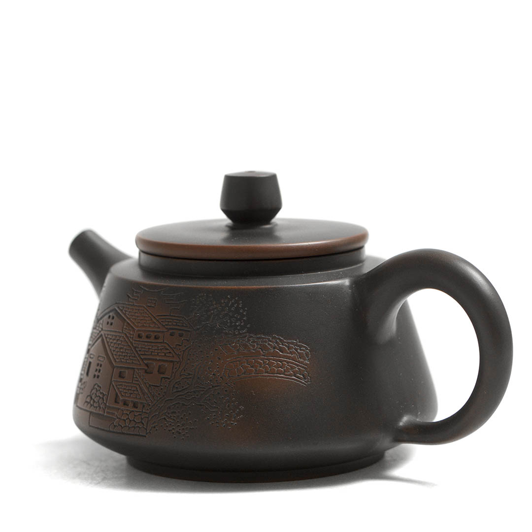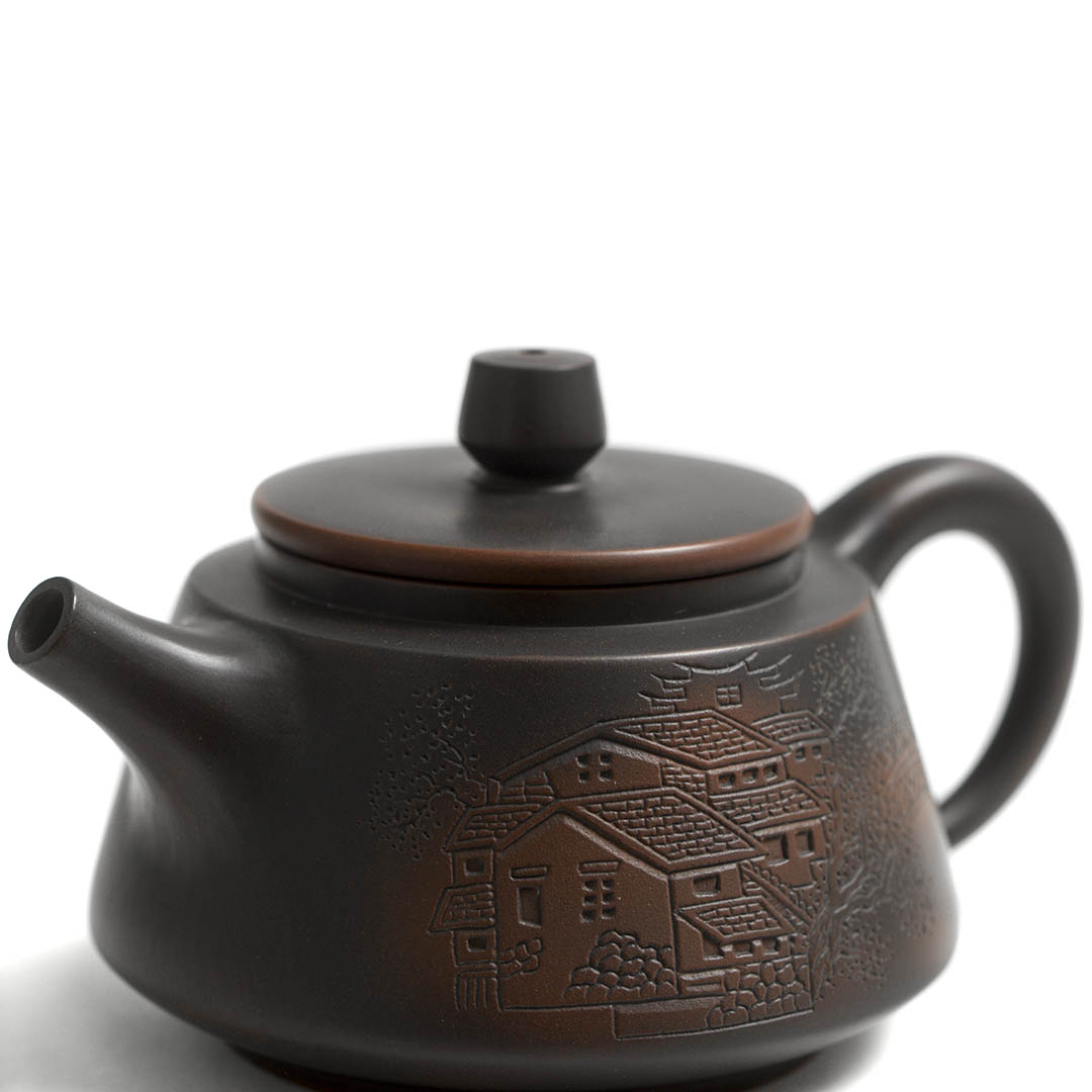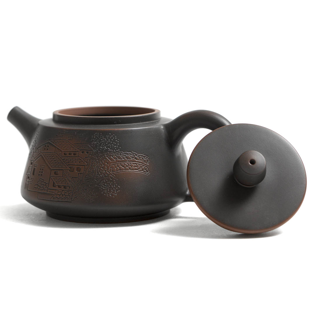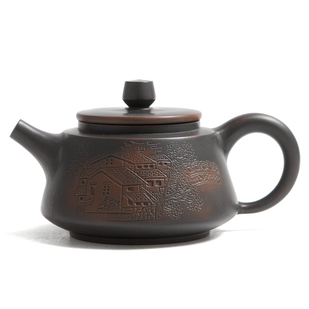 Чайник из Циньчжоу, провинция Гуанси. Так же эти изделия известны как Нисин-тао. Вариация классической формы Ши Пяо.Объем 210 мл. Работа отличного качества. Толщина стенок средняя. Долго держит тепло, звенит как сталь. Сито классическое, 14 отверстий. Отличный функционал, быстрый слив. Шелковистый на ощупь.Украшен резным изображением умиротворяющего пейзажа с видом на дома, реку и мост, проходящий над ней.В комплекте подарочная коробка и парчовый мешочек для хранения.Приятных чаепитий! Читать полностью