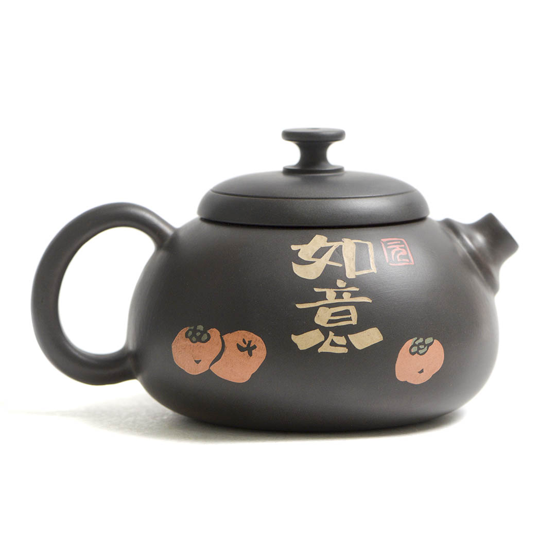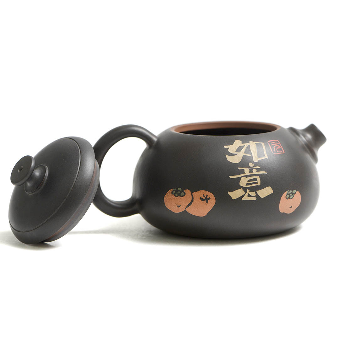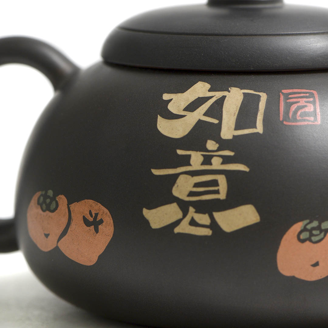 Стенки чайника украшены, инкрустированным в технике Иньке Ян Тянь, изображением плодов хурмы, что в Китае символизирует радость, удачу во всех делах и пожелание успешного завершения задуманного. По-китайски слово «хурма» созвучно слову «дело». Таким образом, данная композиция несёт в себе пожелание скорейших успехов в важном деле.
