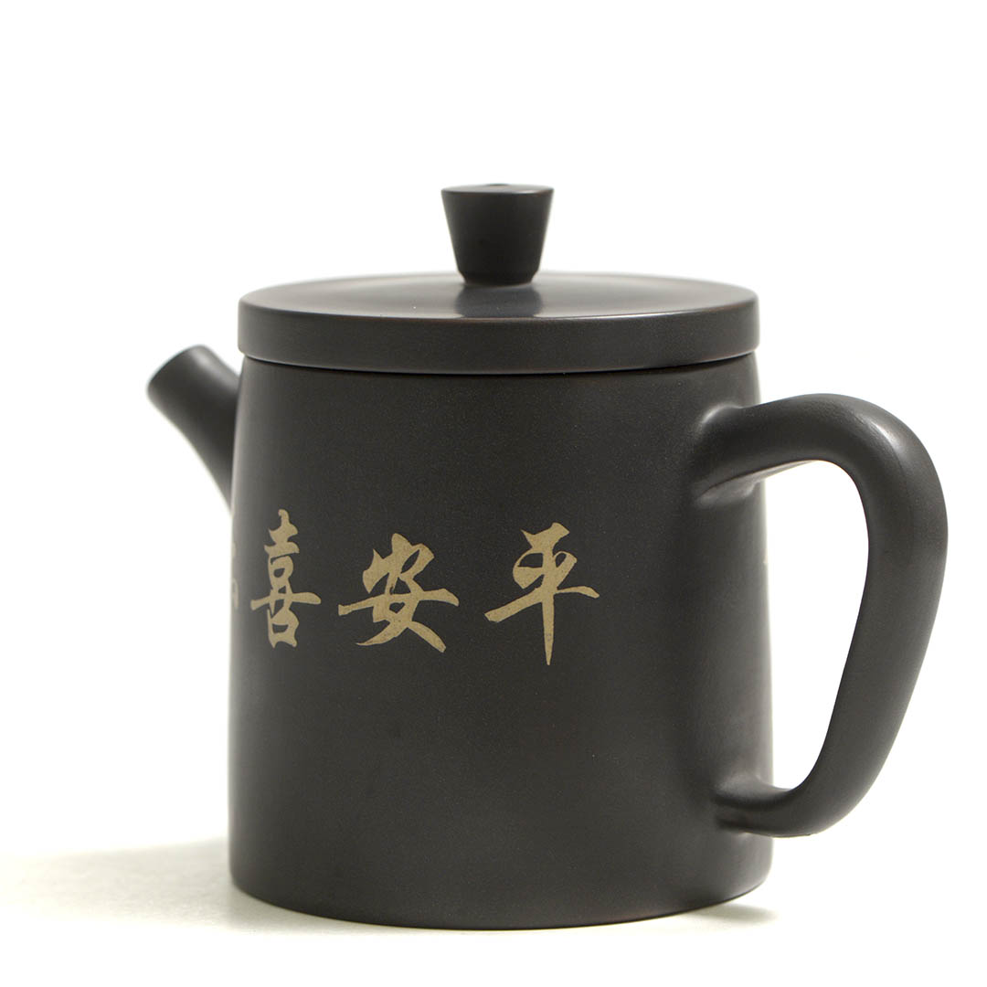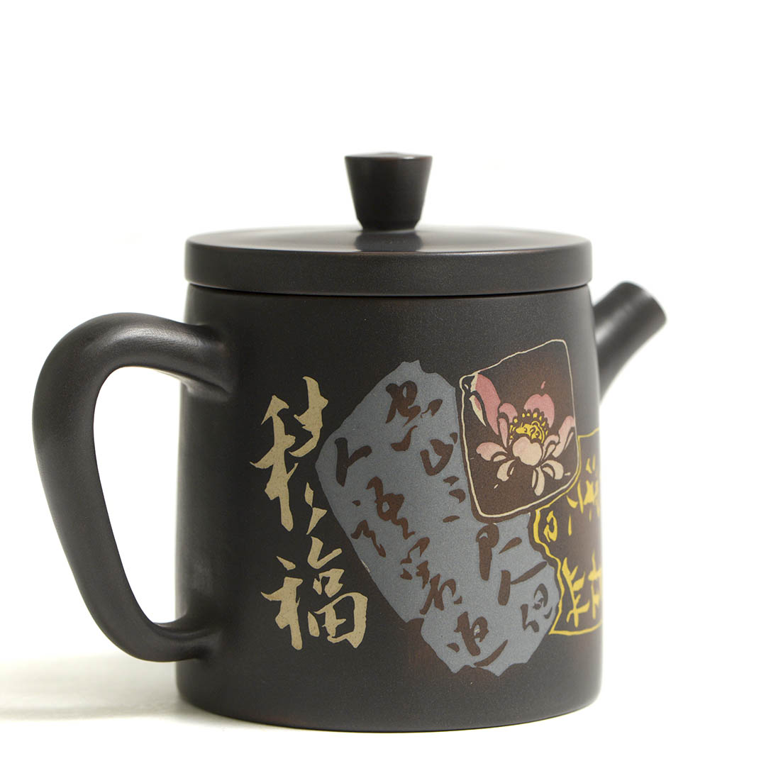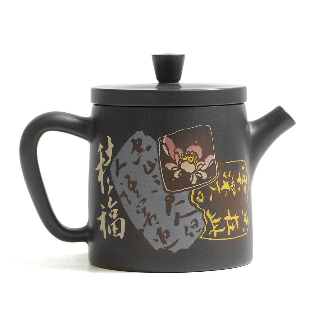 Стенки чайника украшены, инкрустированным в технике Иньке Ян Тянь изображением Ба По ТУ - Восемь Древних Свитков, которое является традиционным для китайского изобразительного искусства.