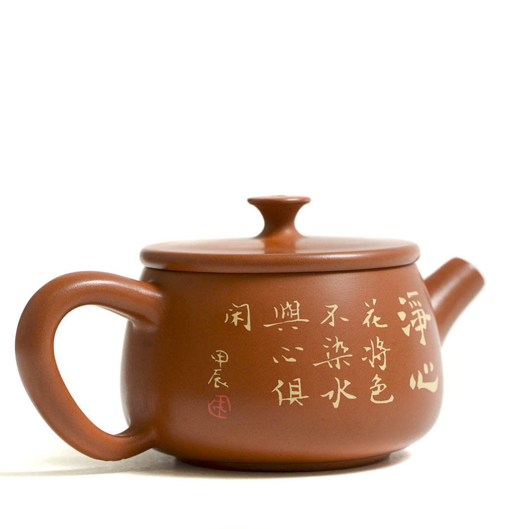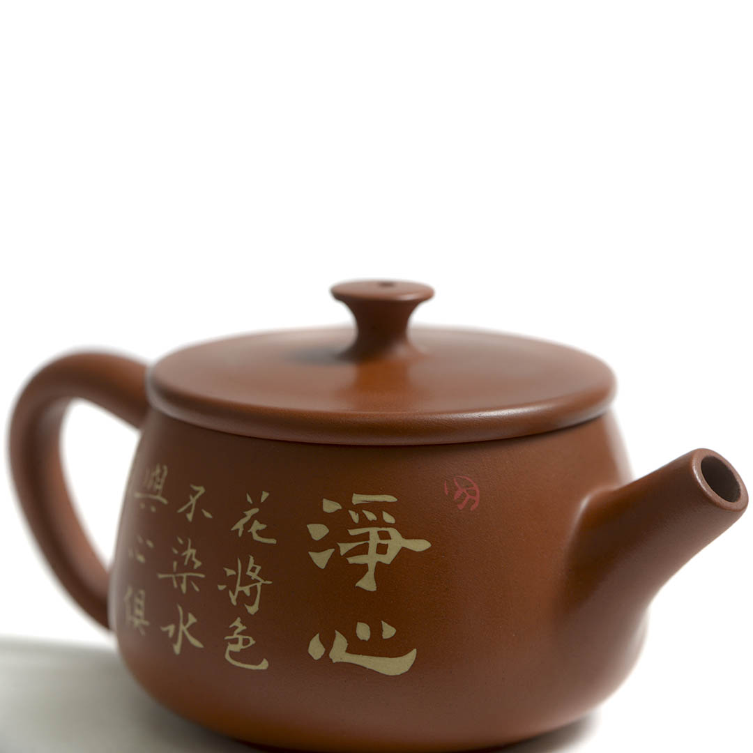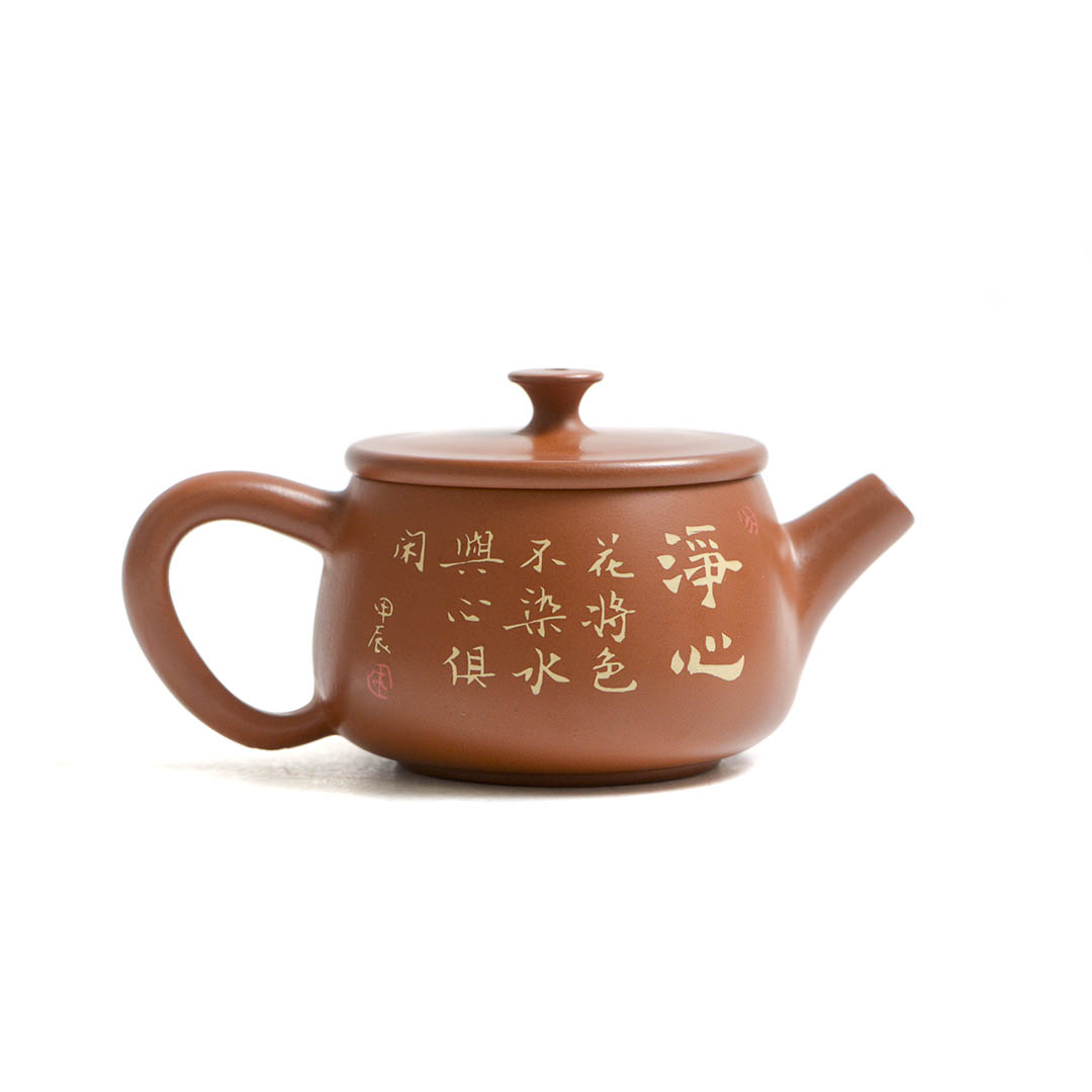 Стенки чайника украшены, инкрустированными в технике Иньке Ян Тянь, иероглифами, что в переводе означают “Чистое сердце не запятнано пылью, вода в цветочной долине полностью чиста” — суть чань-буддийской мудрости, воплощенной в глине. Она говорит о том, что внутренняя чистота сознания, свободного от мирских страстей, преображает и восприятие всего окружающего мира. Подобно лотосу, растущему из ила, но остающемуся незапятнанным, такой чайник приглашает к ритуалу, где каждый глоток — это шаг к ясности ума и созерцательной гармонии с природой.