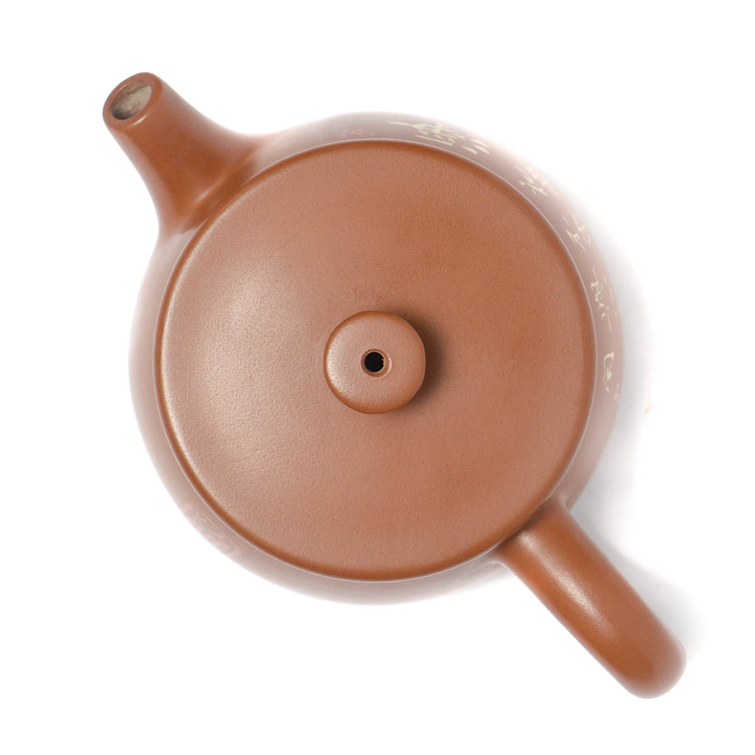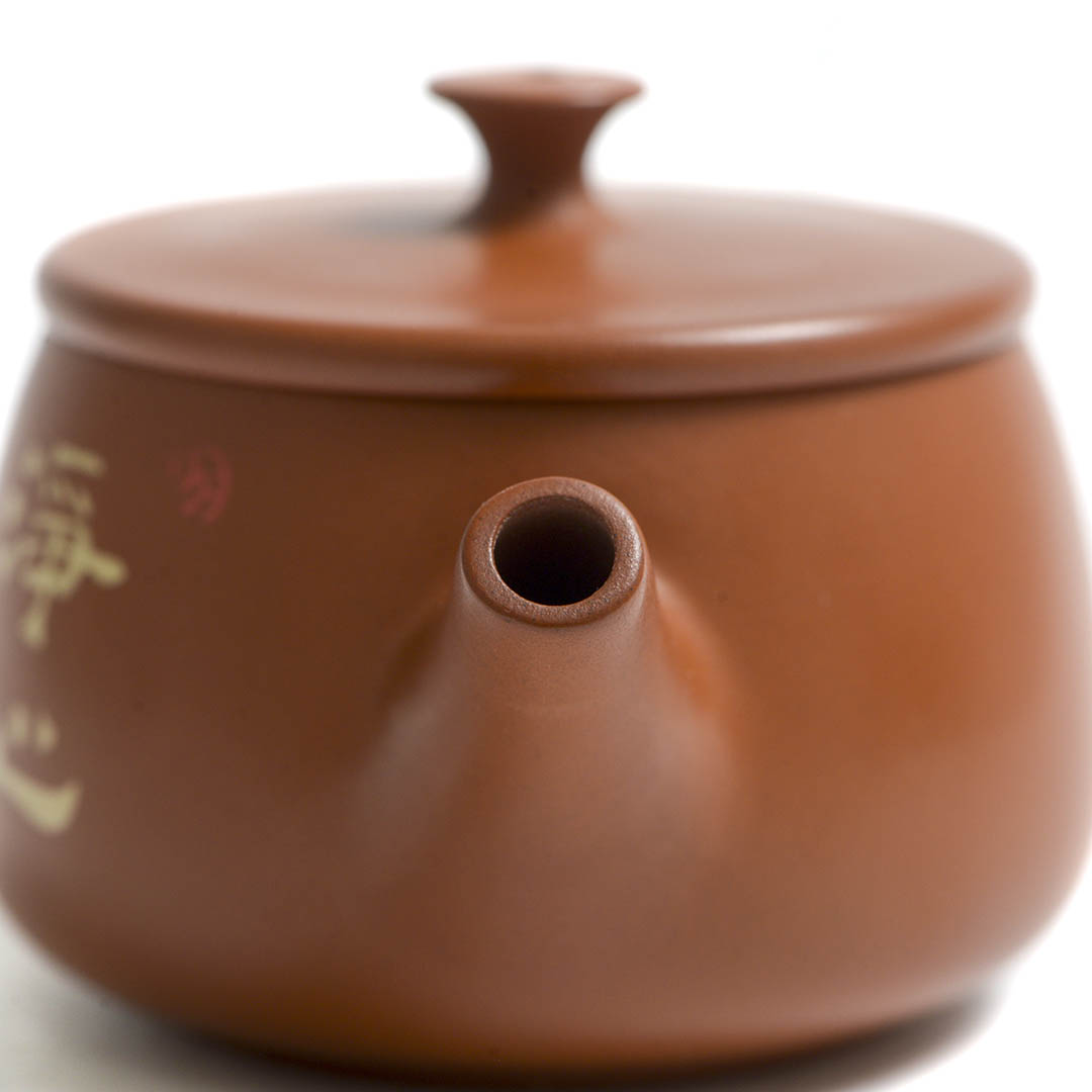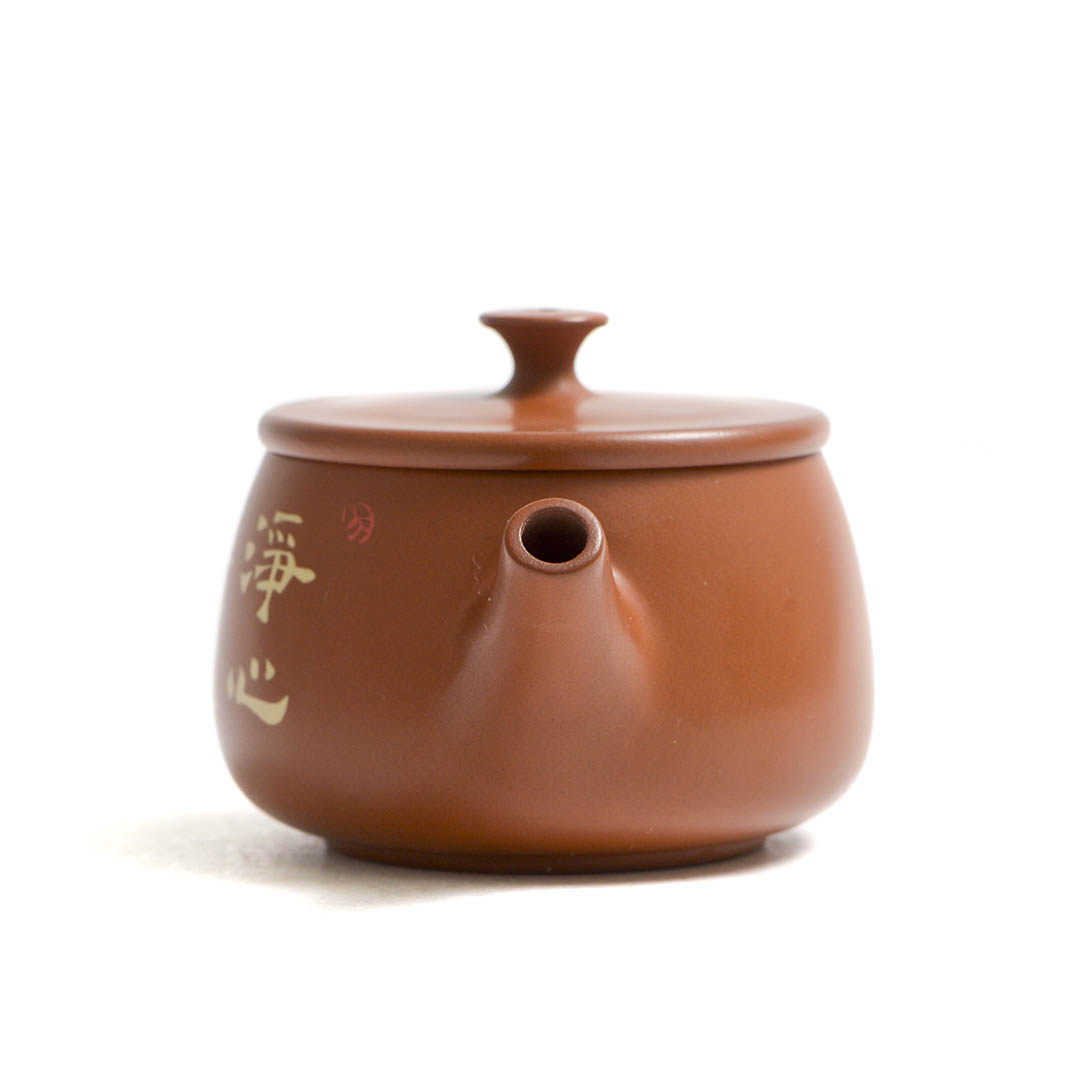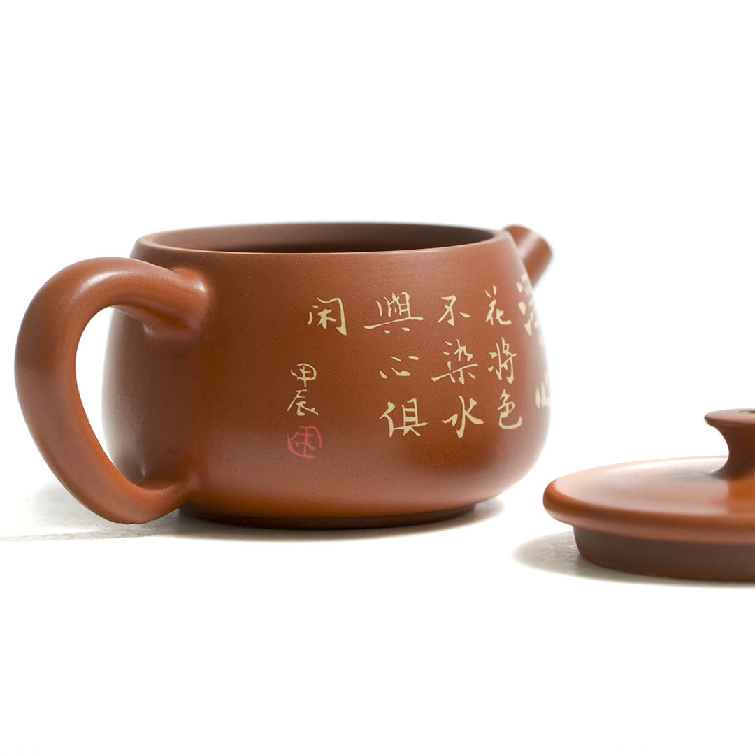 Стенки чайника украшены, инкрустированными в технике Иньке Ян Тянь, иероглифами, что в переводе означают “Чистое сердце не запятнано пылью, вода в цветочной долине полностью чиста” — суть чань-буддийской мудрости, воплощенной в глине. Она говорит о том, что внутренняя чистота сознания, свободного от мирских страстей, преображает и восприятие всего окружающего мира. Подобно лотосу, растущему из ила, но остающемуся незапятнанным, такой чайник приглашает к ритуалу, где каждый глоток — это шаг к ясности ума и созерцательной гармонии с природой.