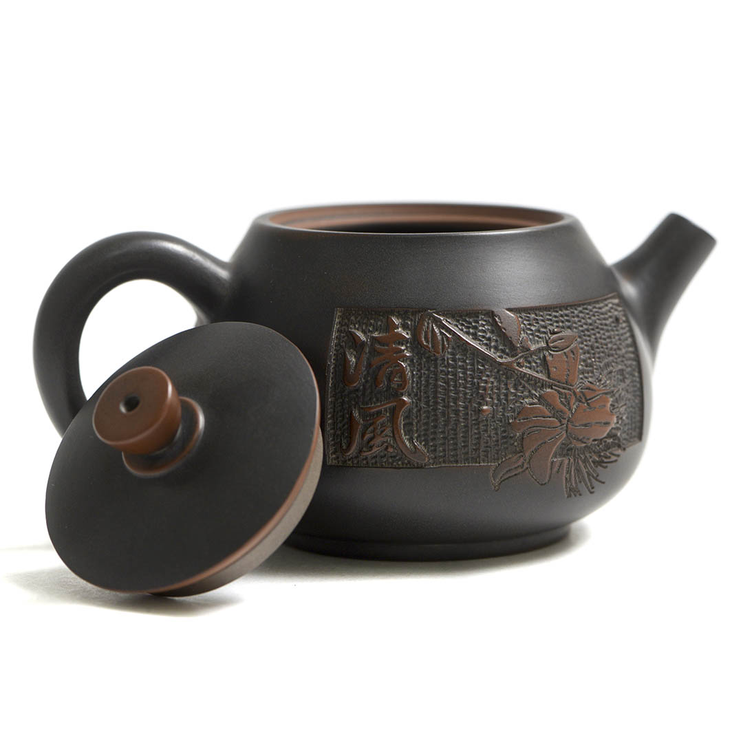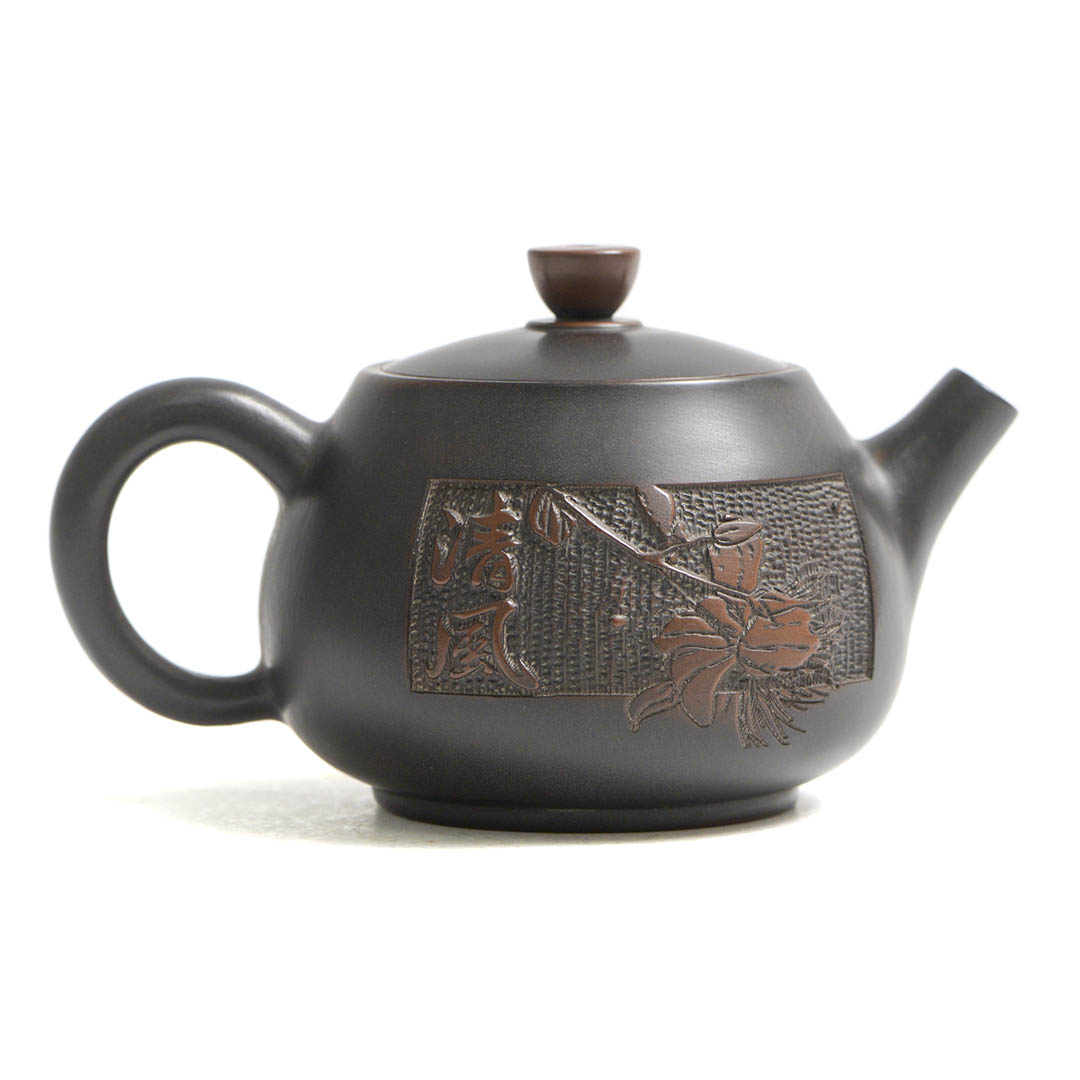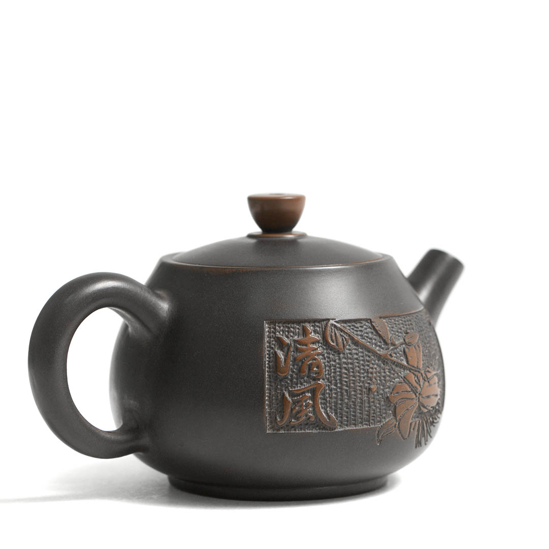 Чайник украшен иероглифами 清风, что означает “Свежий Ветер”, нанесены на чайник как воплощение гармонии и умиротворения. Они символизируют не только свежесть чайного напитка, но и стремление к ясности ума и душевной чистоте во время чайной церемонии. Эта надпись превращает процесс чаепития в медитативный ритуал, где каждый глоток наполнен легкостью и спокойствием природы.