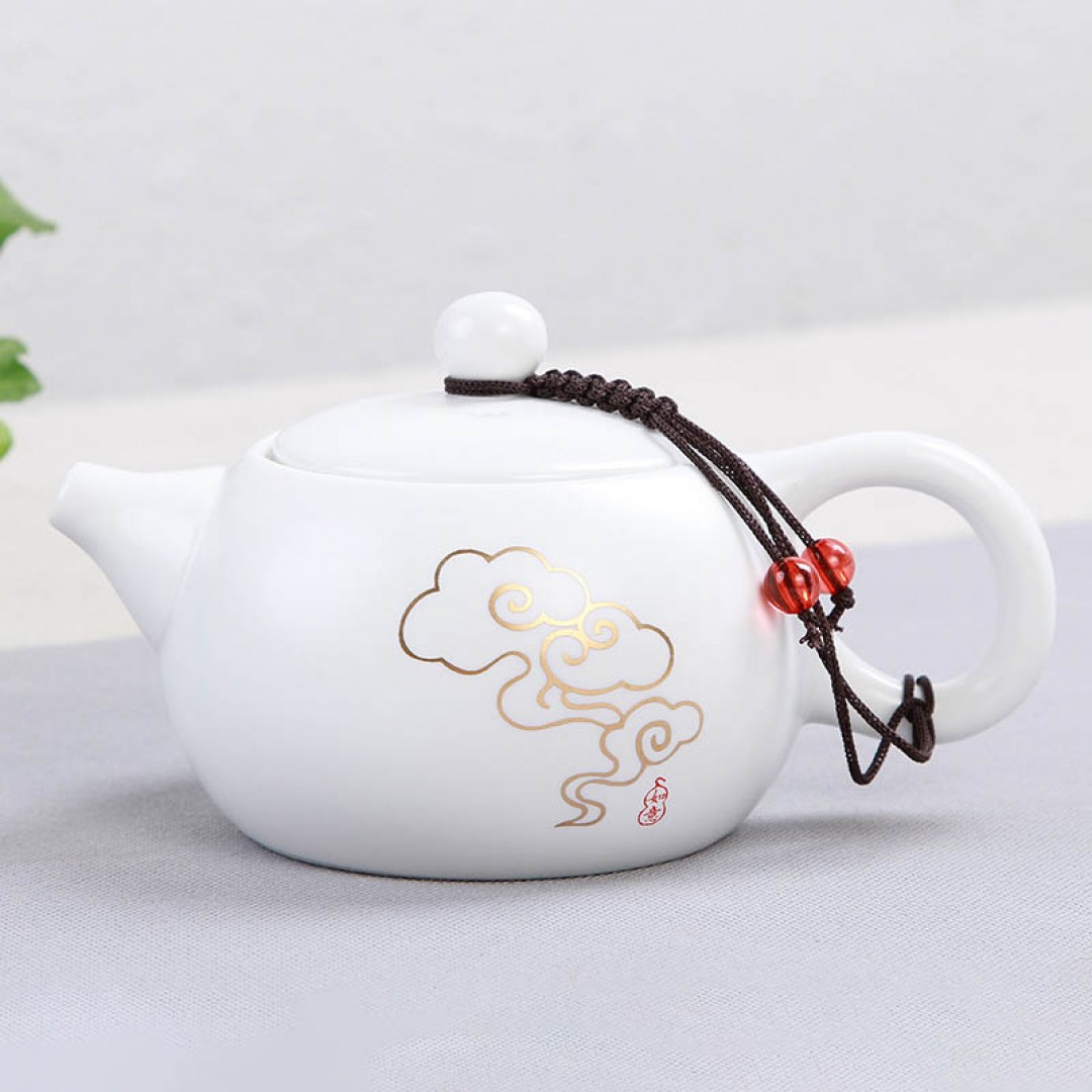 Чайник покрыт белой матовой глазурью. Украшен стилизованным изображением облаков.