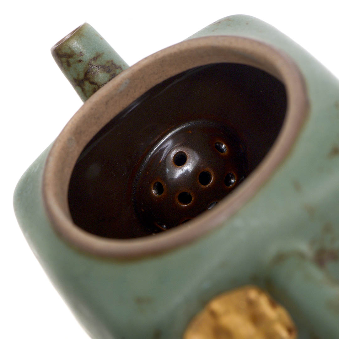 Керамический чайник родом из Дэхуа. Толстостенный, тяжелый. Сито выполнено в виде гнезда.