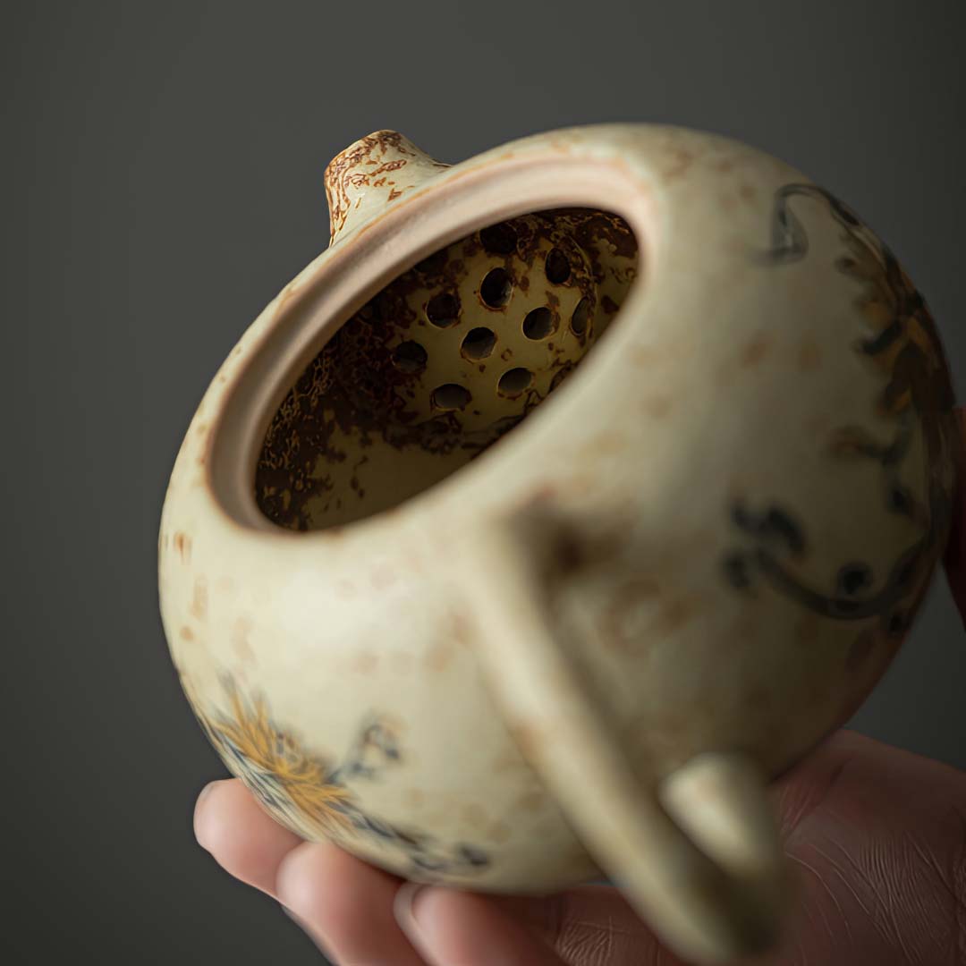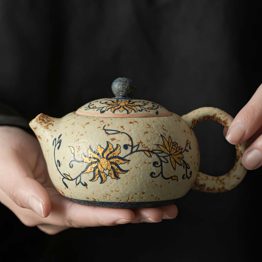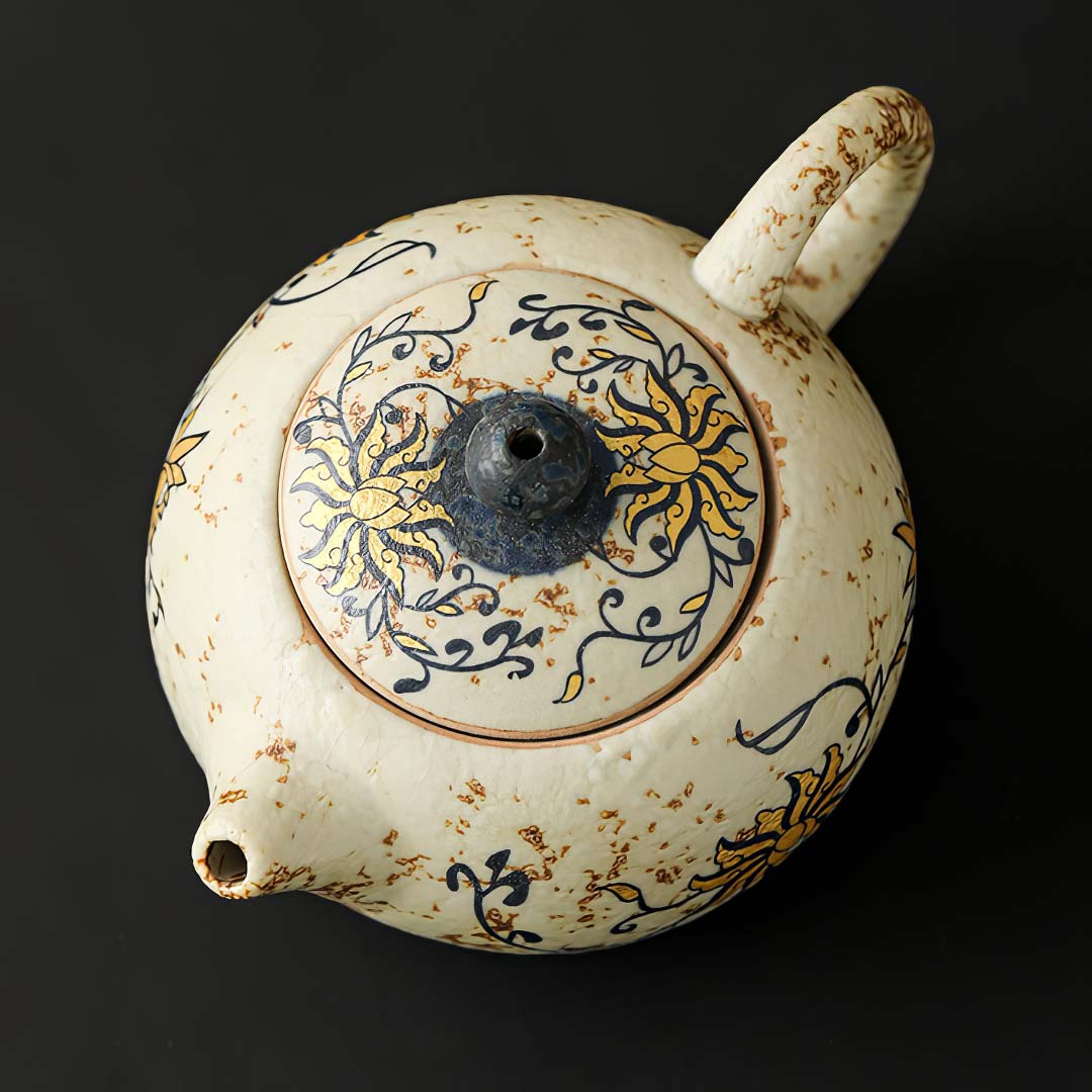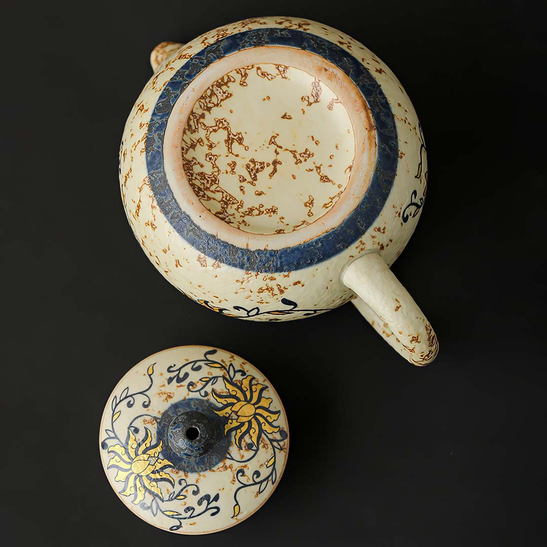 Чайник покрыт авторской глазурью, имитирующей древний камень с золотой инкрустацией.