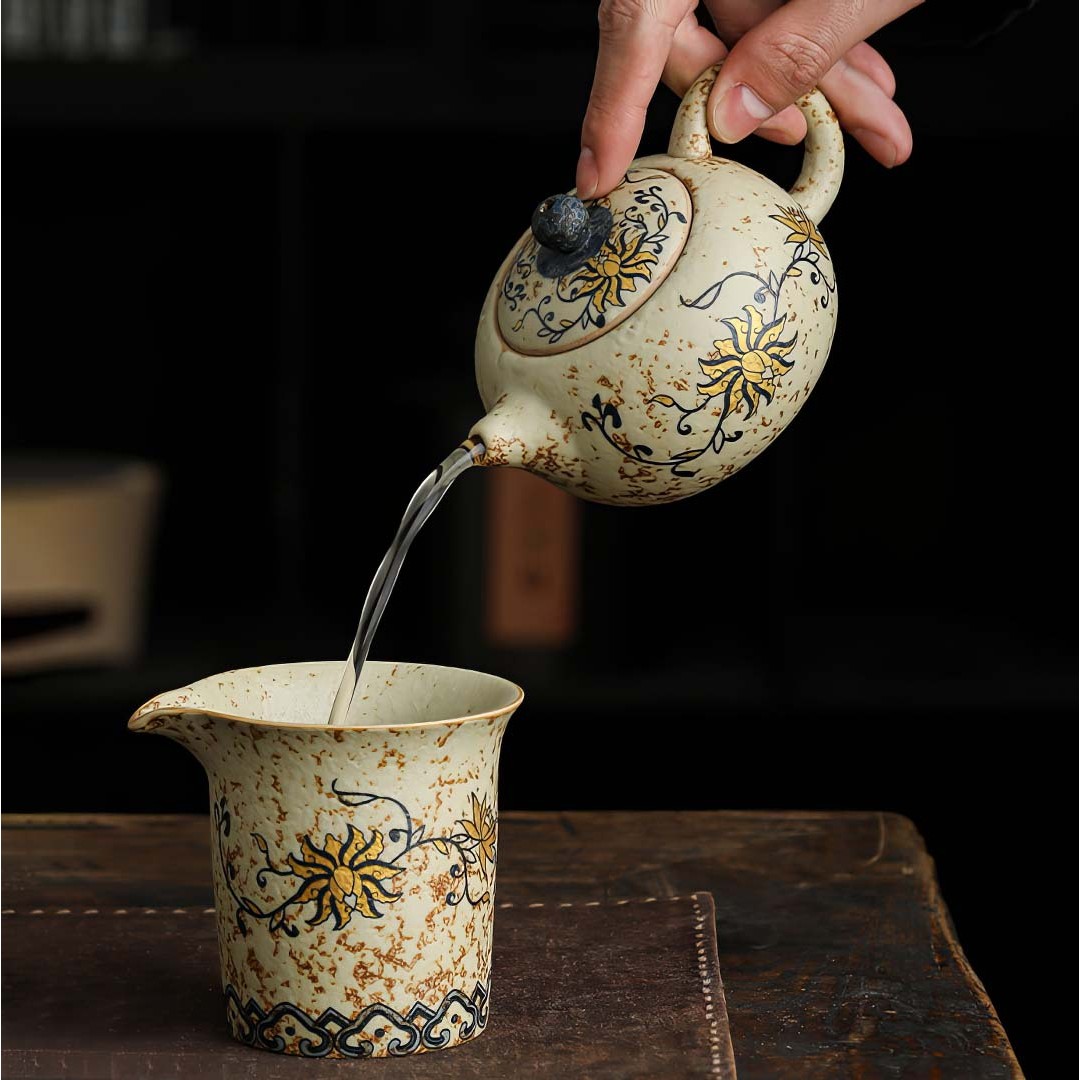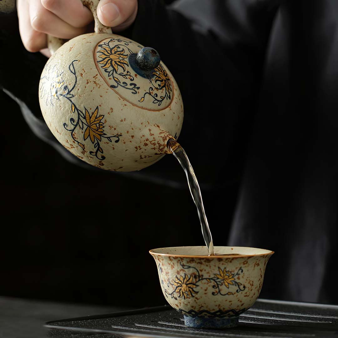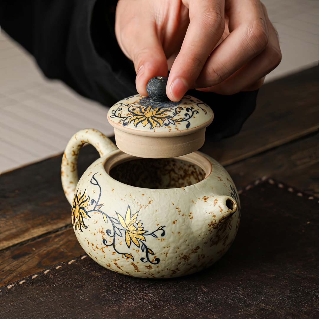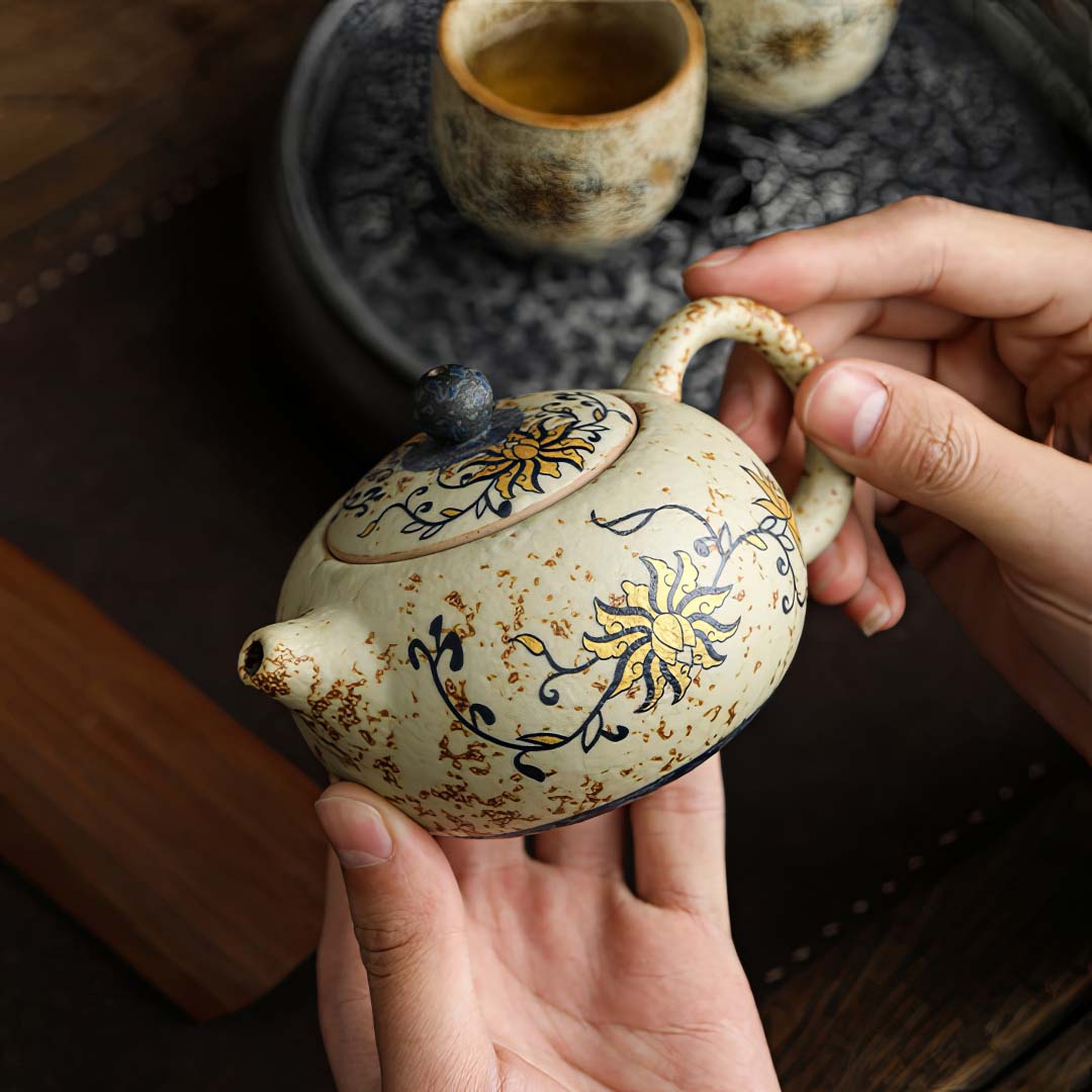 Чайник покрыт авторской глазурью, имитирующей древний камень с золотой инкрустацией.
