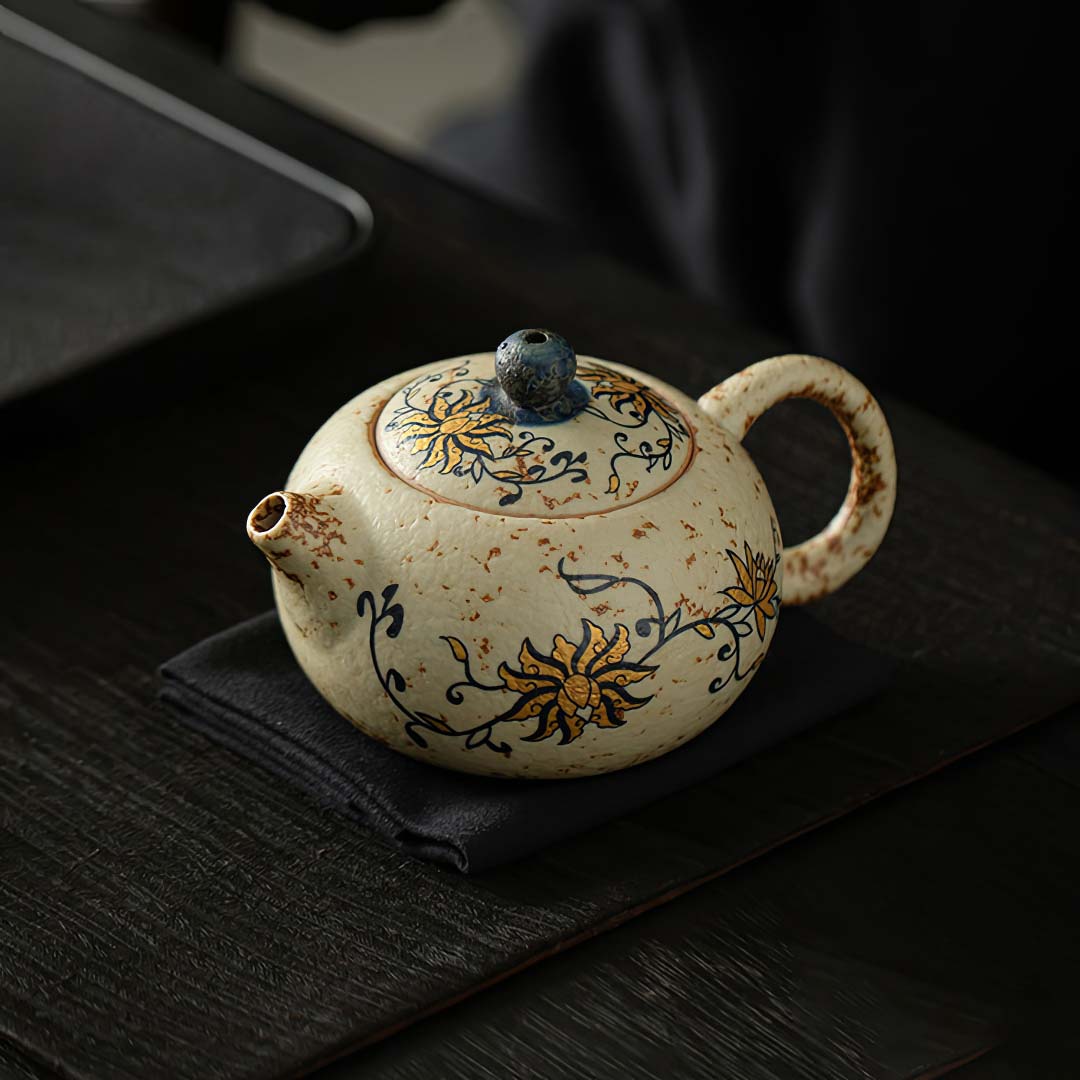 Керамический чайник родом из провинции Фуцзянь. Стенки чуть тоньше средних. Сито выполнено в виде гнезда. Объем – 210 мл.Чайник покрыт авторской глазурью, имитирующей древний камень с золотой инкрустацией.Украшен изображением Лотоса. В Китае лотос символизирует чистоту, духовное раскрытие, мудрость.Приятного чаепития! Читать полностью