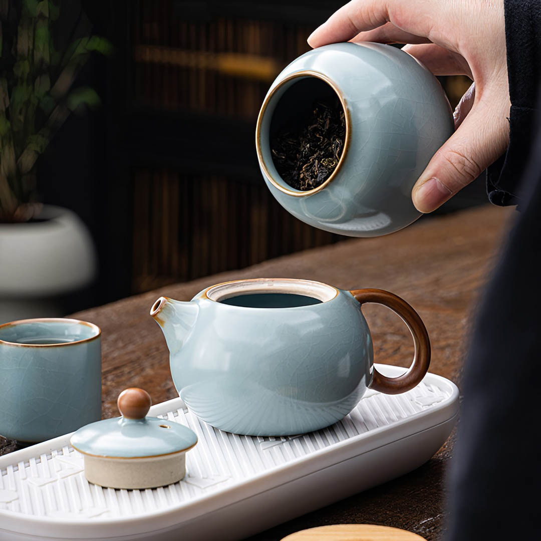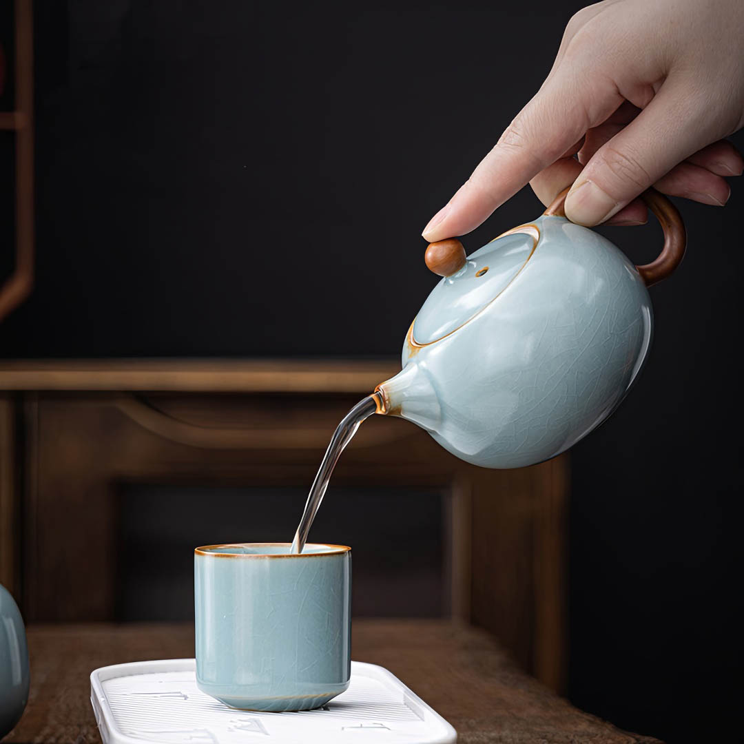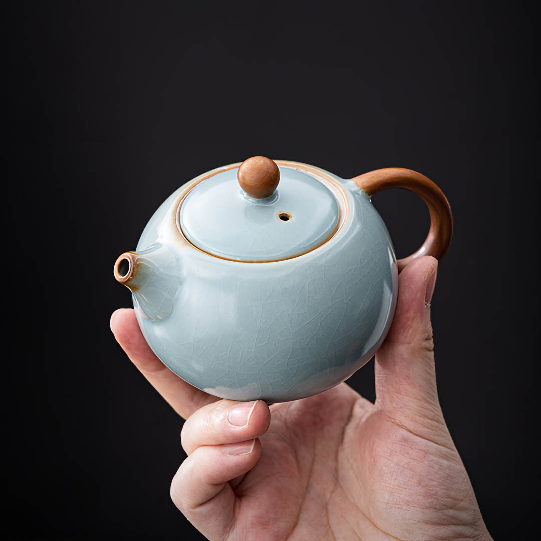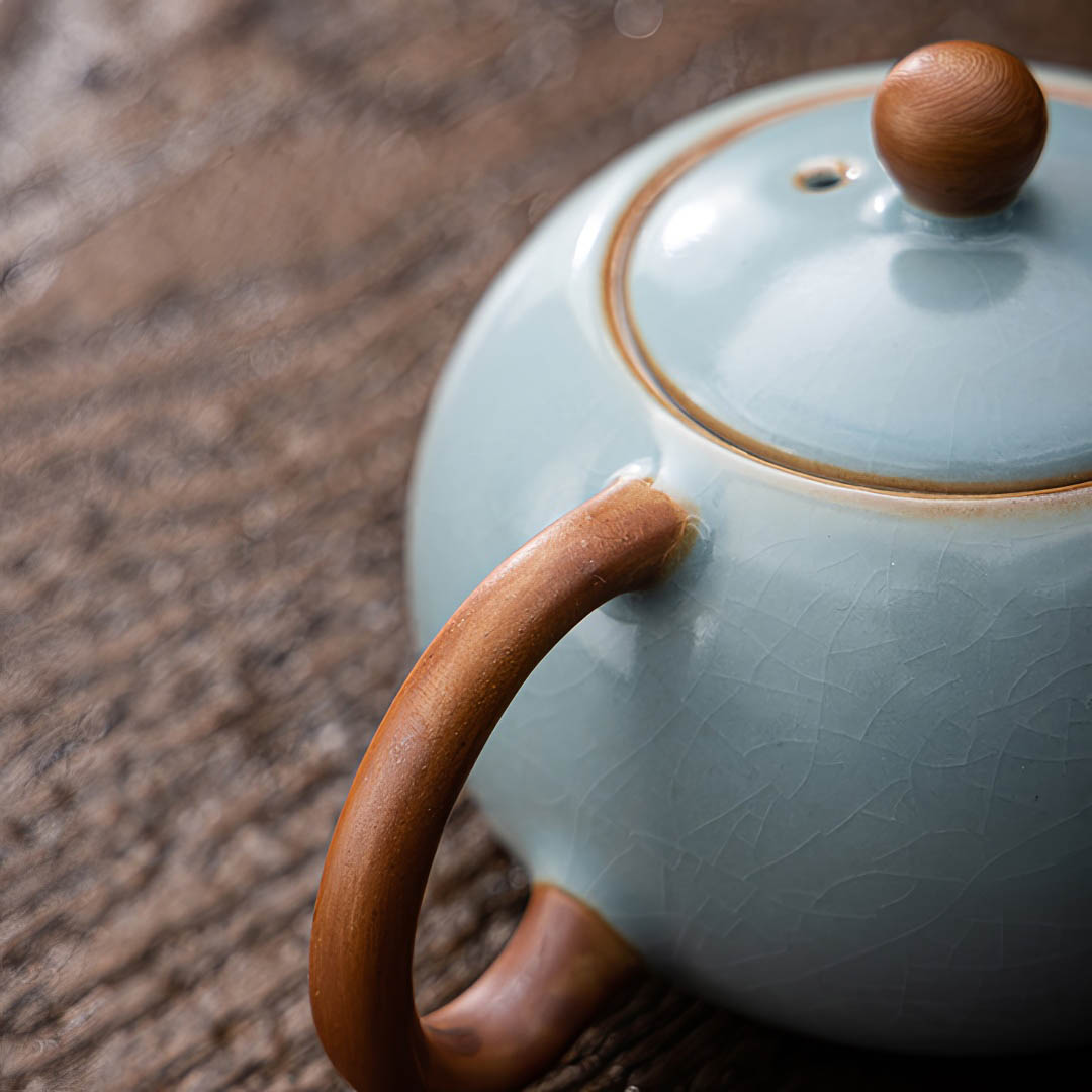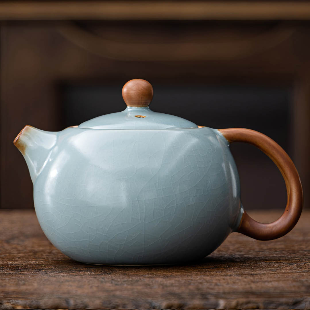 Керамический чайник. Стенки чуть толще среднего.Покрыт глазурью Жу Яо, ее особенность заключается в том, что она покрыта паутинкой мельчайших трещин, которые постепенно заполняются чаем и проявляют уникальный для каждой пиалы рисунок, придавая изделию особый, таинственный налет времени.
