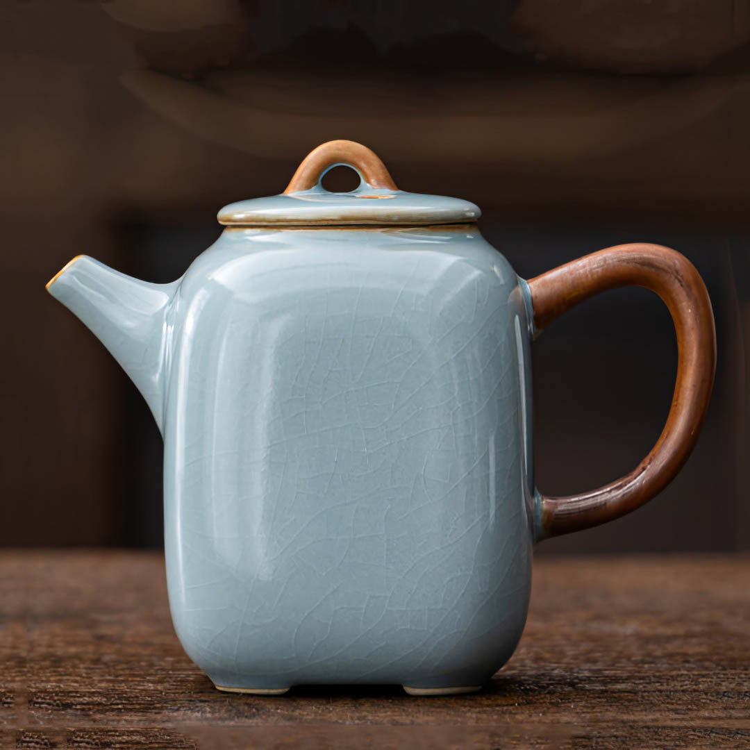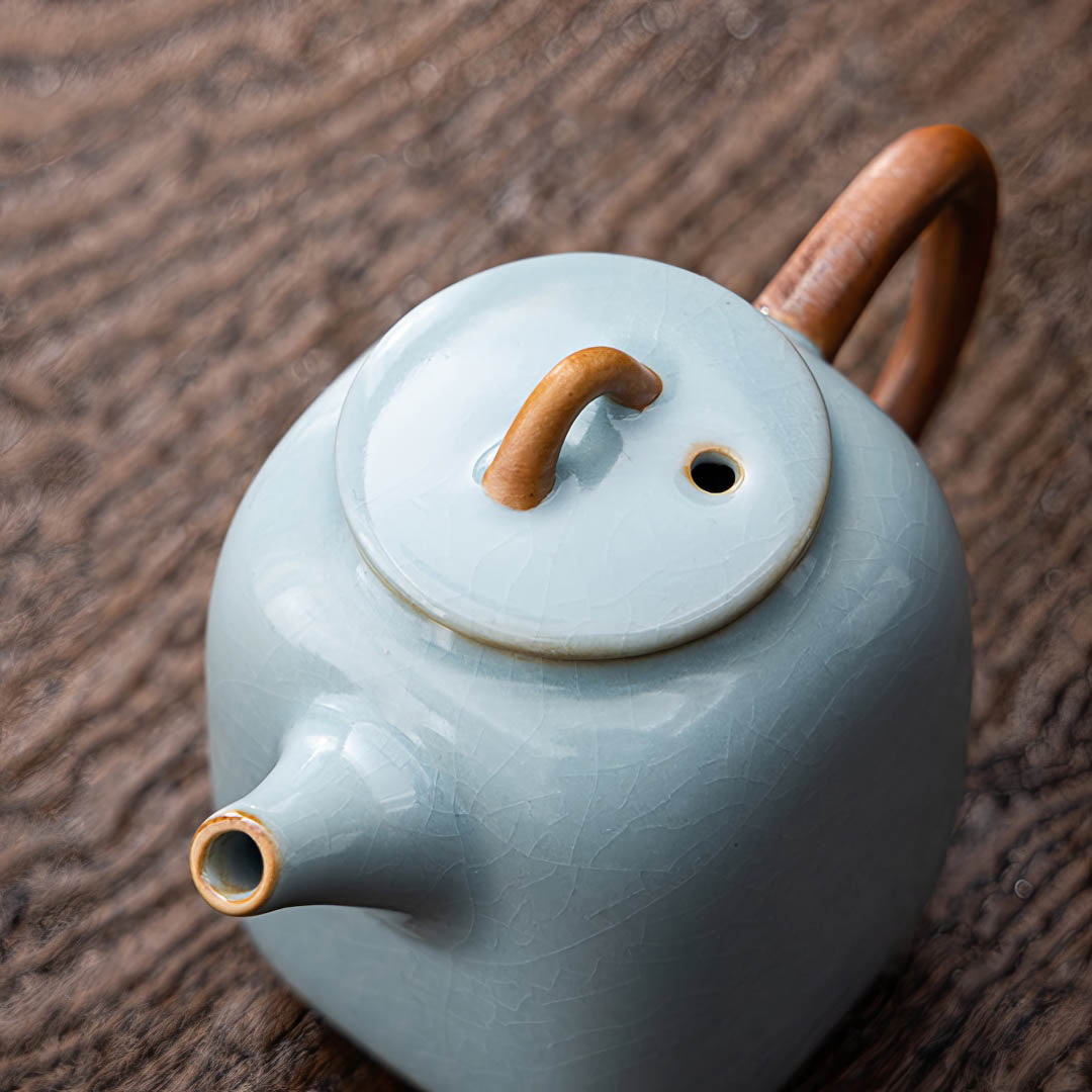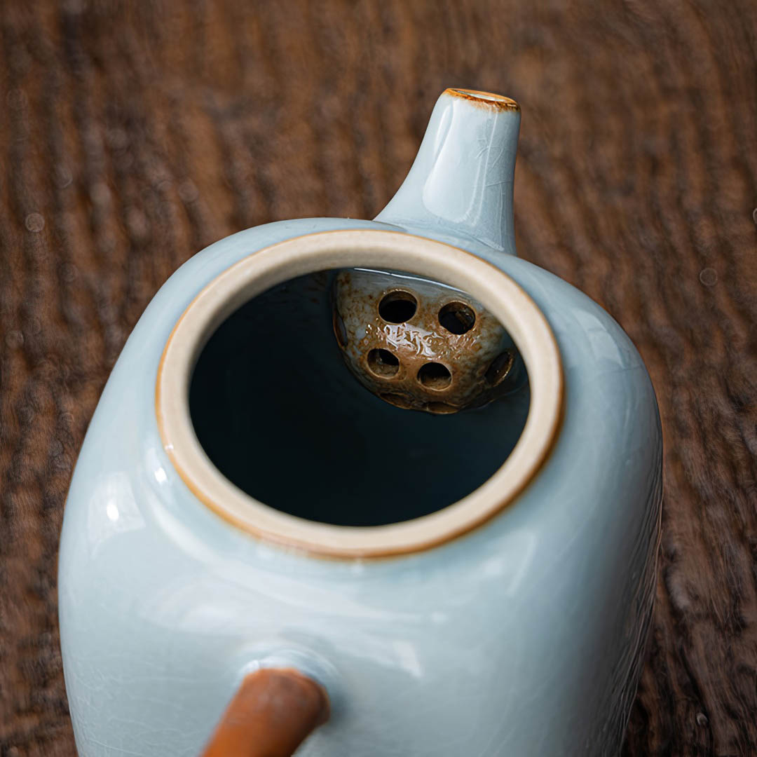 Керамический чайник. Стенки чуть толще среднего.Покрыт глазурью Жу Яо, ее особенность заключается в том, что она покрыта паутинкой мельчайших трещин, которые постепенно заполняются чаем и проявляют уникальный для каждой пиалы рисунок, придавая изделию особый, таинственный налет времени.