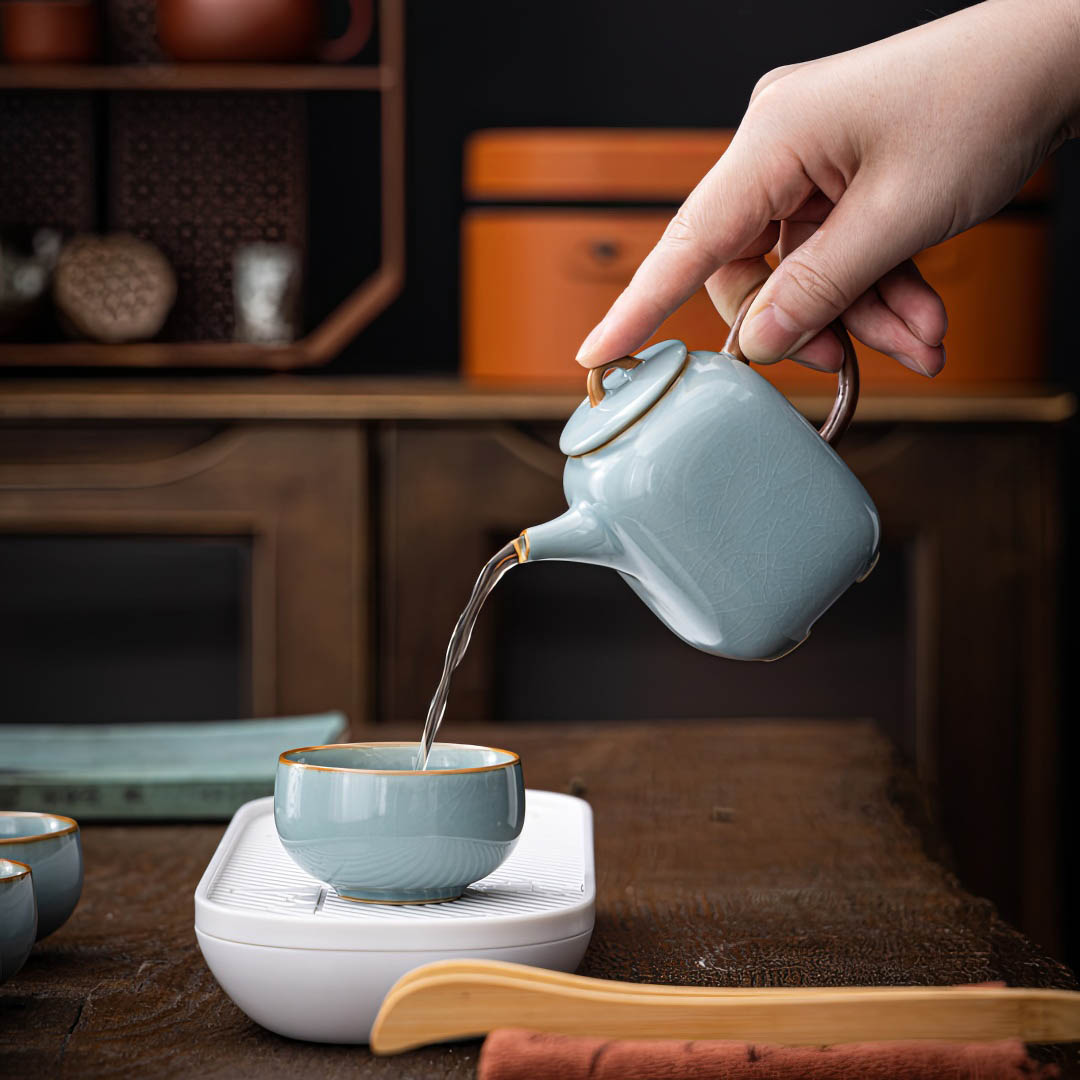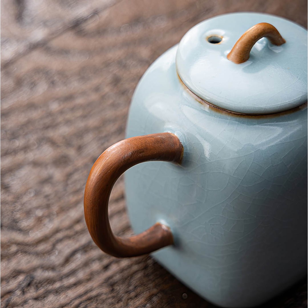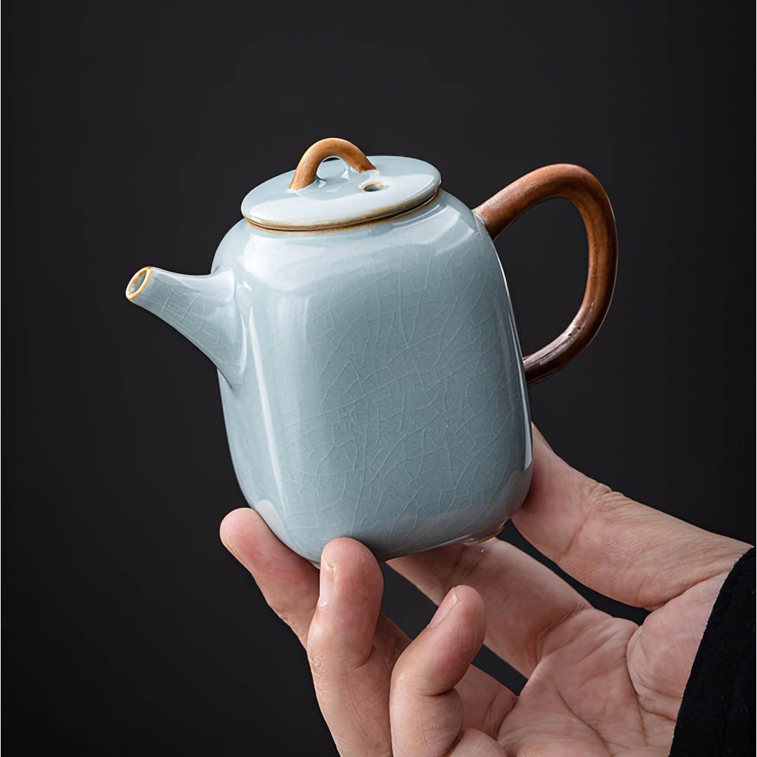 Керамический чайник. Стенки чуть толще среднего.Покрыт глазурью Жу Яо, ее особенность заключается в том, что она покрыта паутинкой мельчайших трещин, которые постепенно заполняются чаем и проявляют уникальный для каждой пиалы рисунок, придавая изделию особый, таинственный налет времени.
