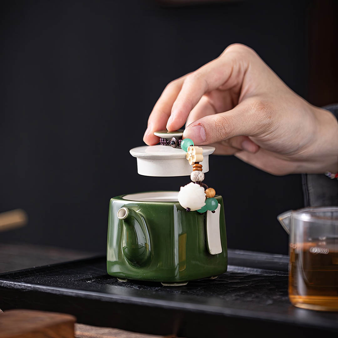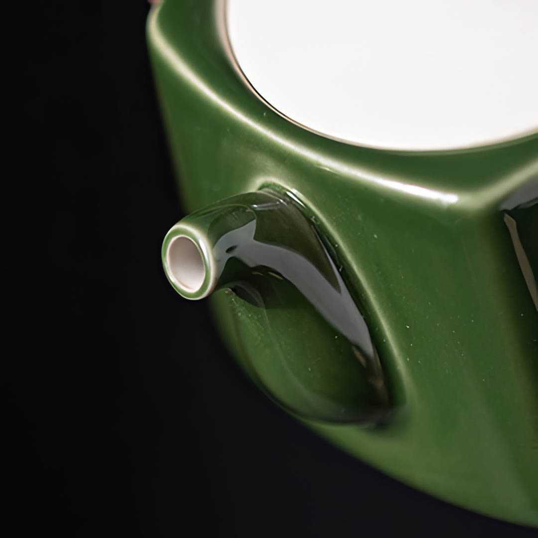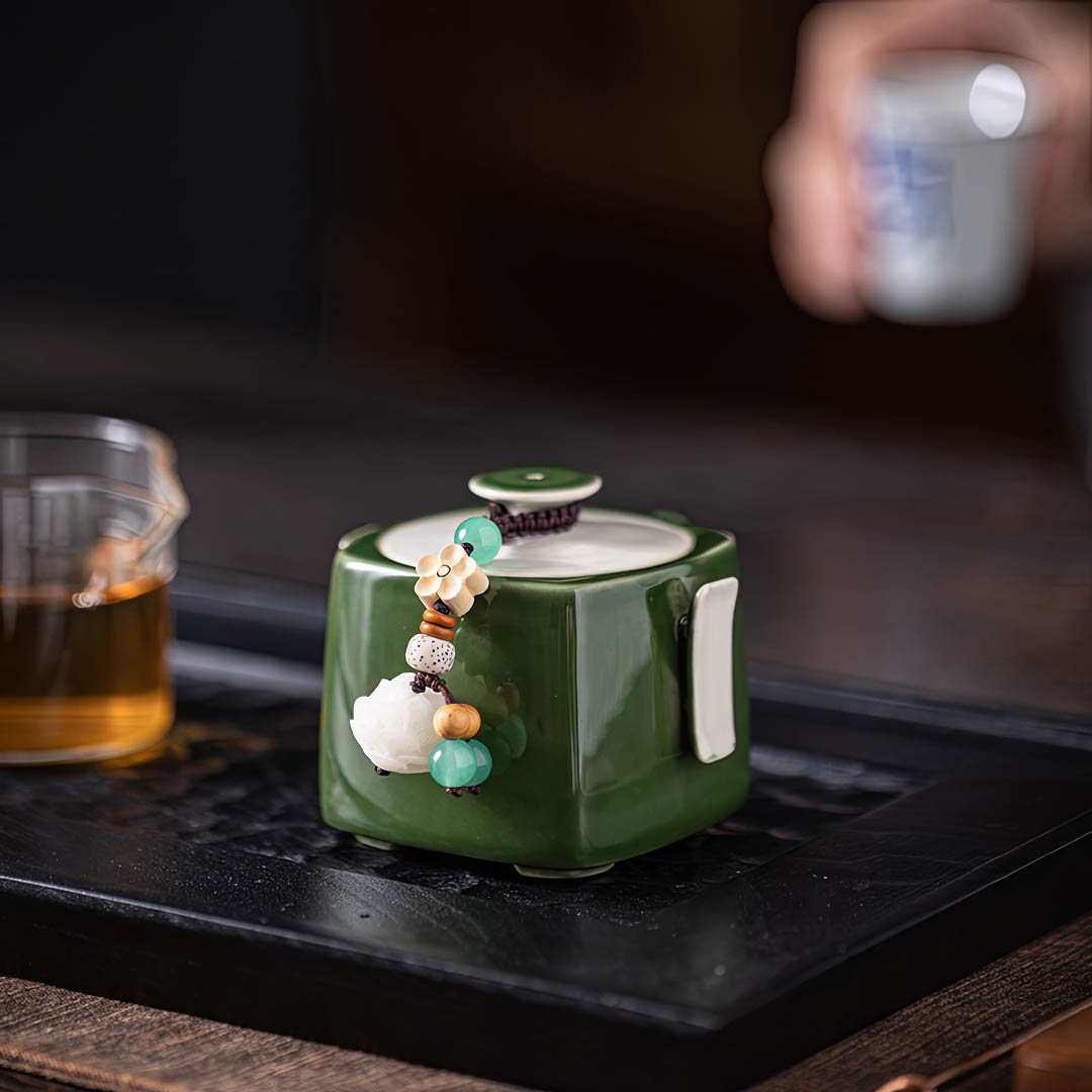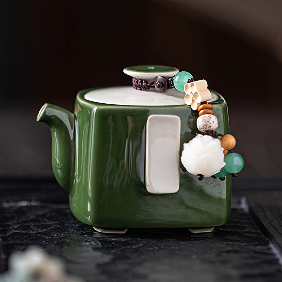 Объем - 120 мл. Сито классическое, 12 отверстий. Покрыт глянцевой глазурью глубокого зеленого оттенка. На крышке присутствует Даоши — шнурок с декором, включающим бусины и цветы, для более удобного использования крышечки.