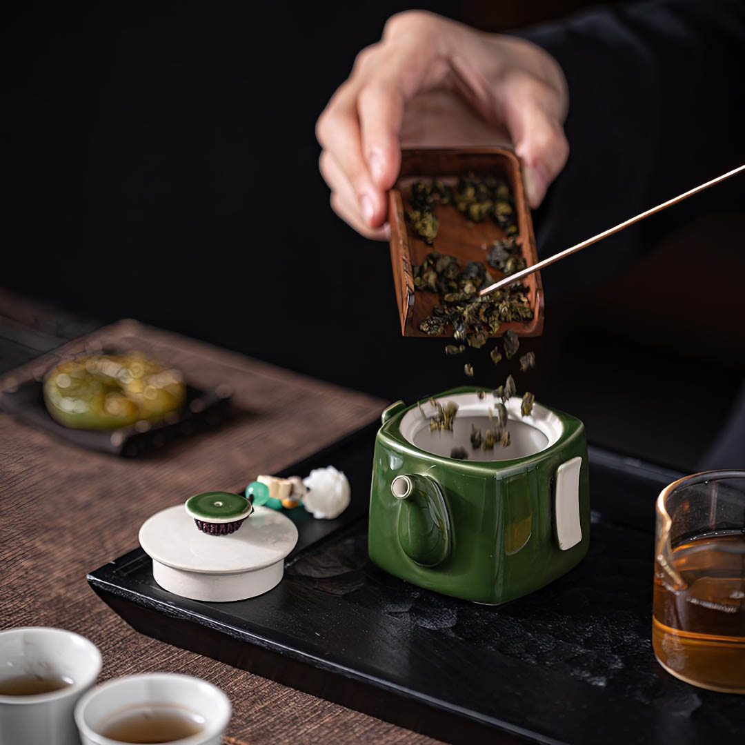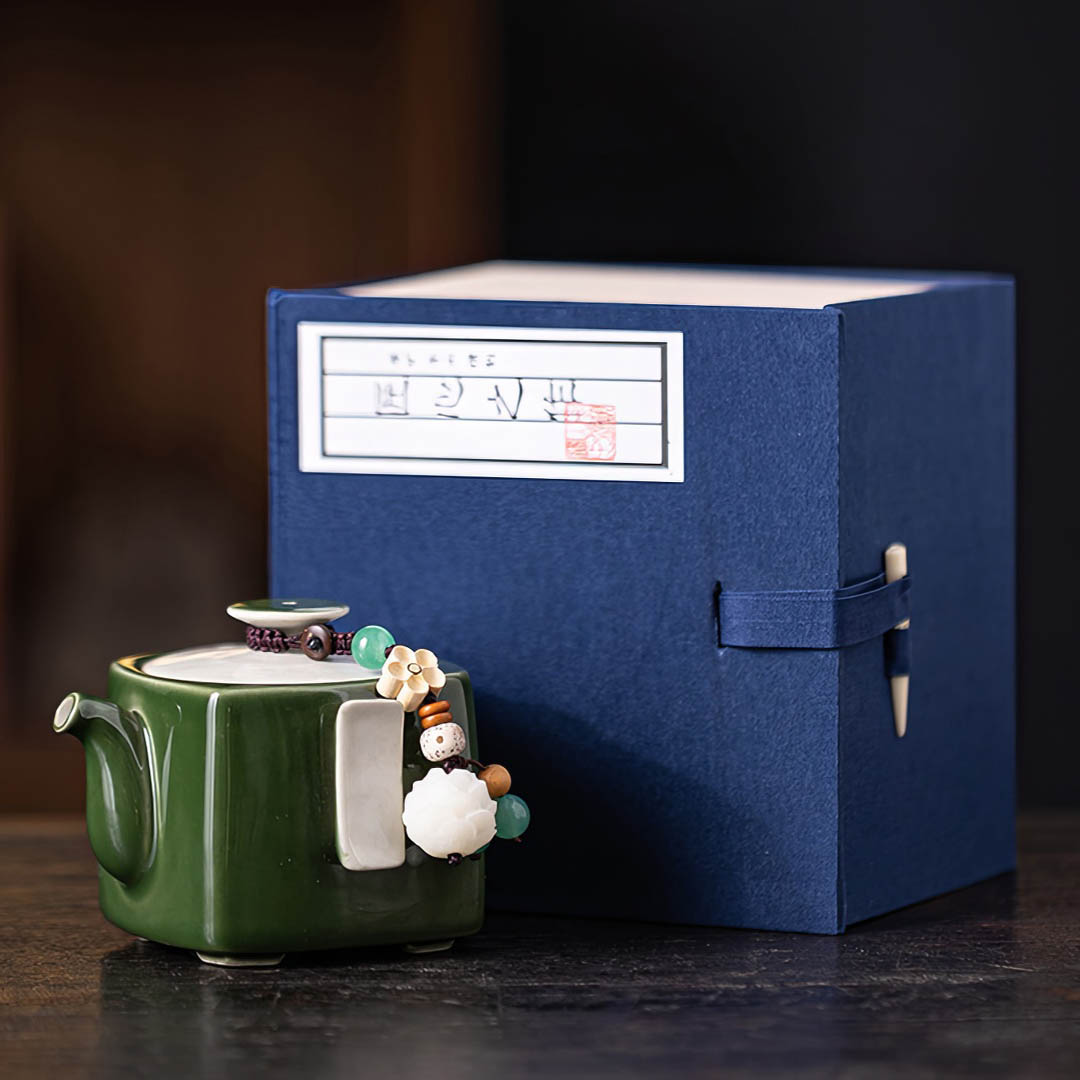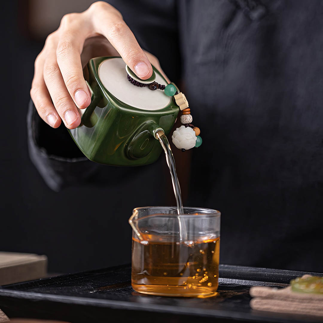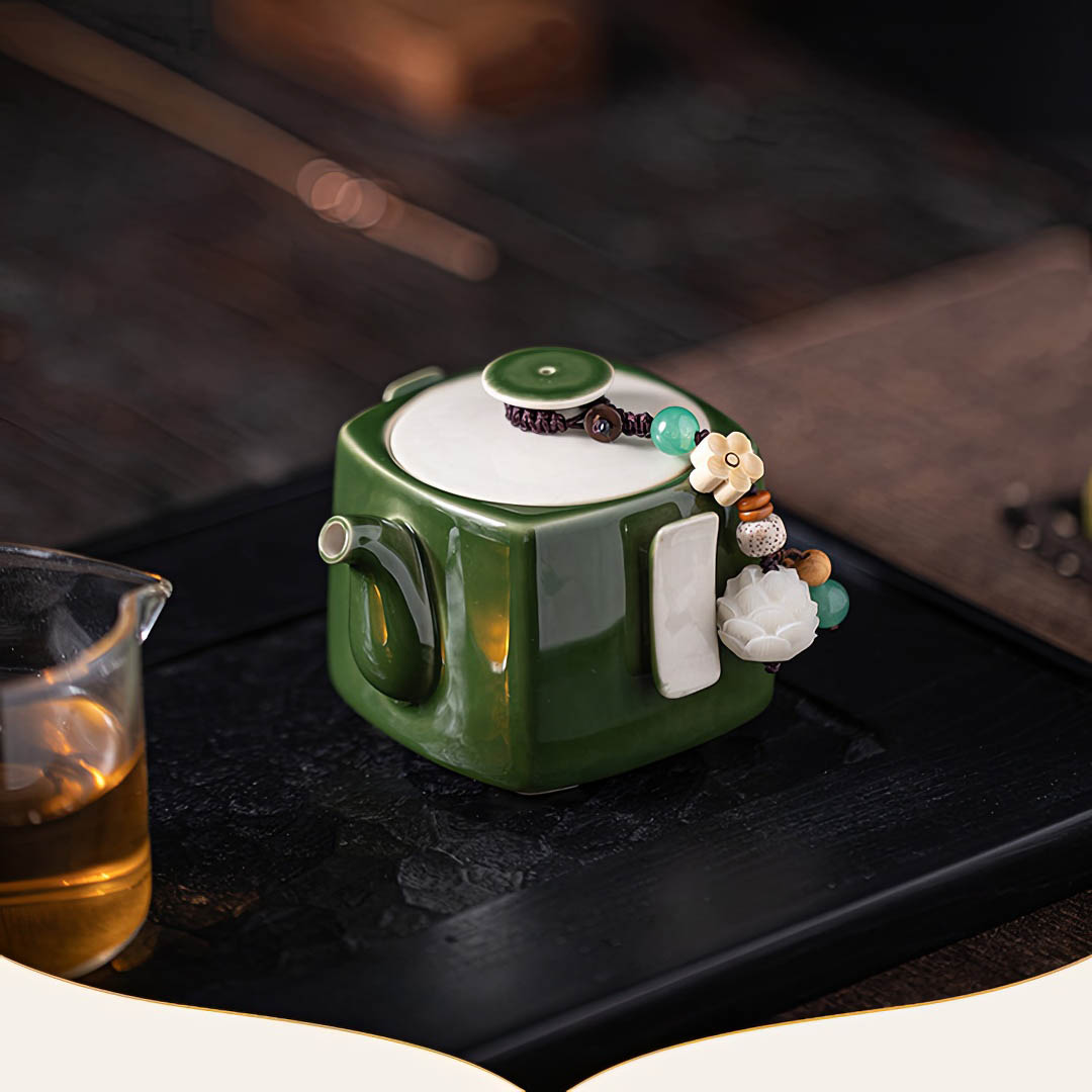 Объем - 120 мл. Сито классическое, 12 отверстий. Покрыт глянцевой глазурью глубокого зеленого оттенка. На крышке присутствует Даоши — шнурок с декором, включающим бусины и цветы, для более удобного использования крышечки.