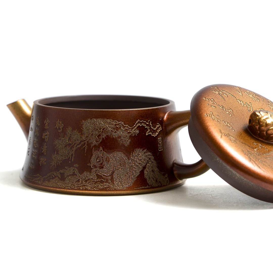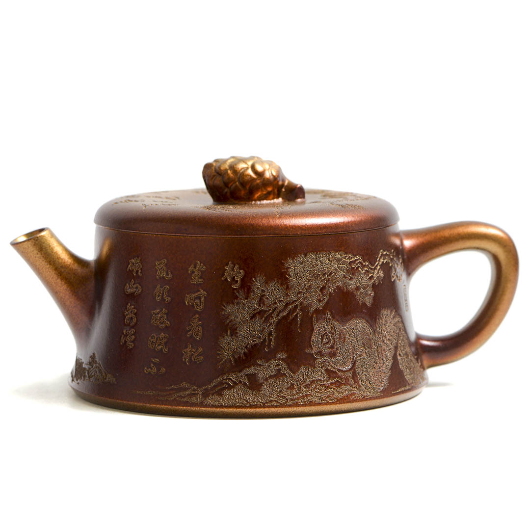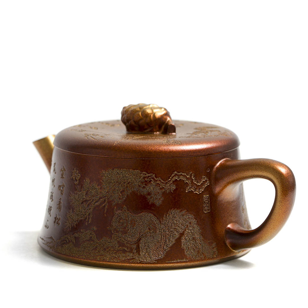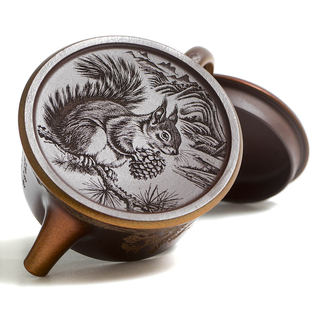 Чайник, донышко и крышка украшены рельефным изображением Белки, держащей шишку на фоне Сосен и Горных Пейзажей. Ручка крышечки выполнена в виде сосновой шишки. Белка в китайской традиции – символ плодородия и изобилия.