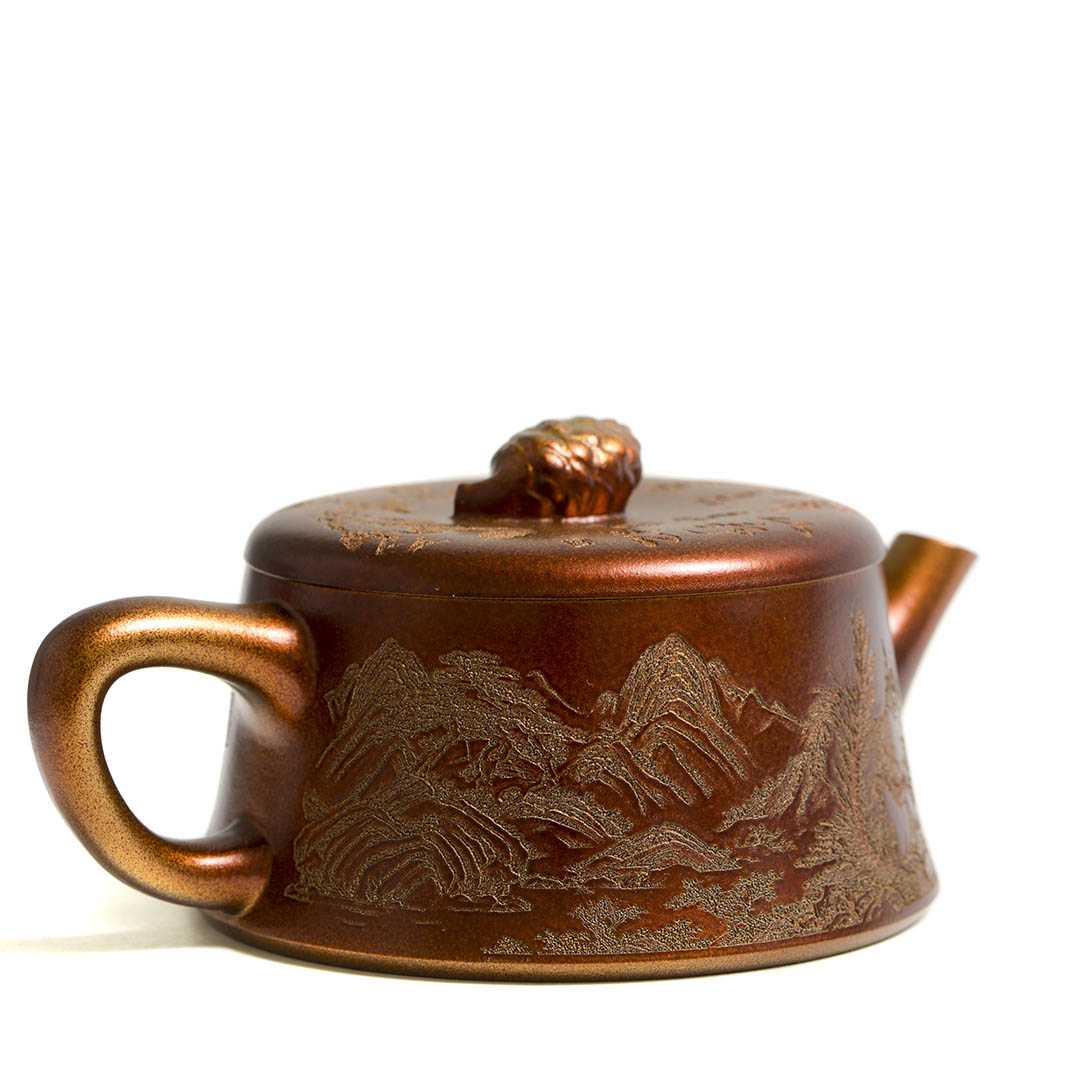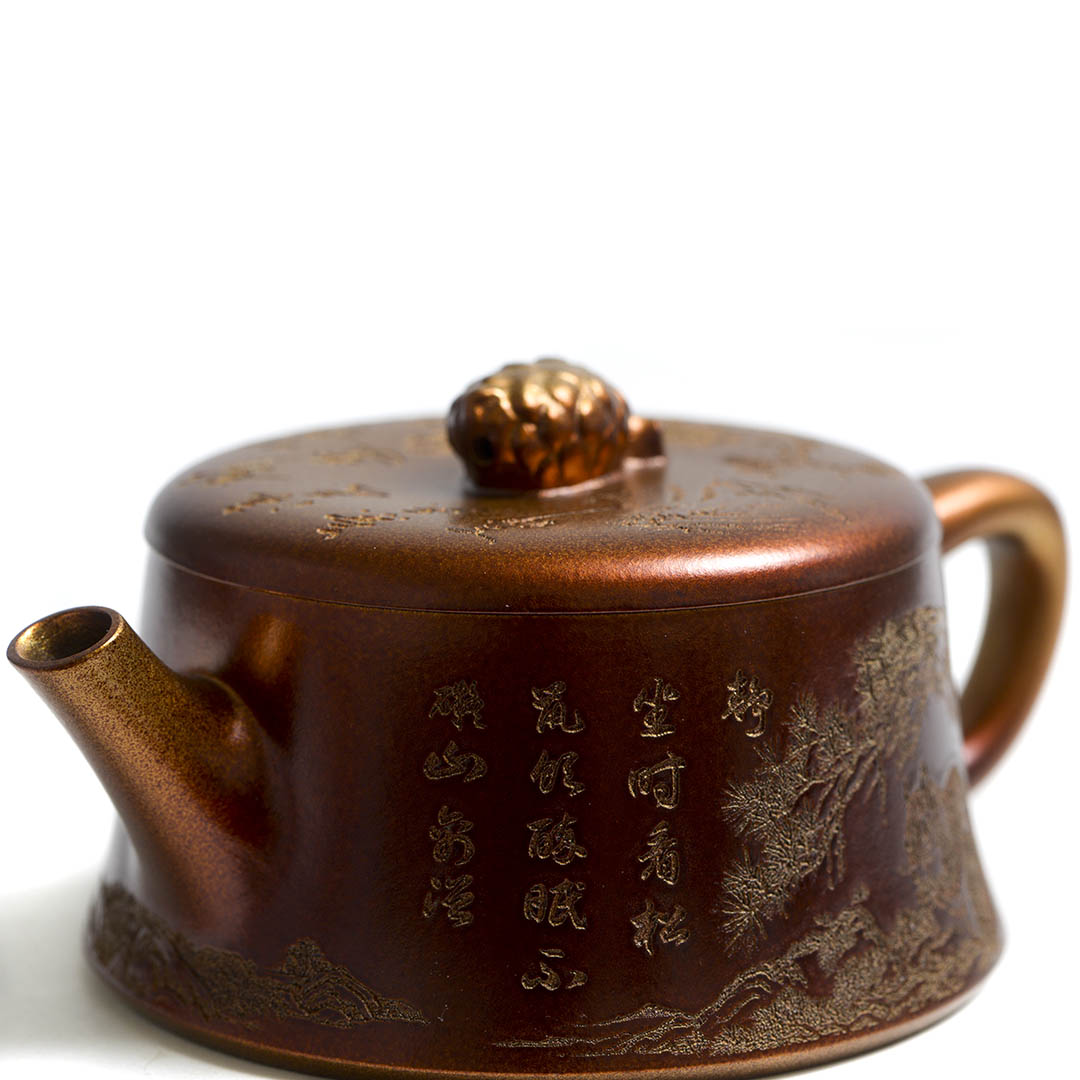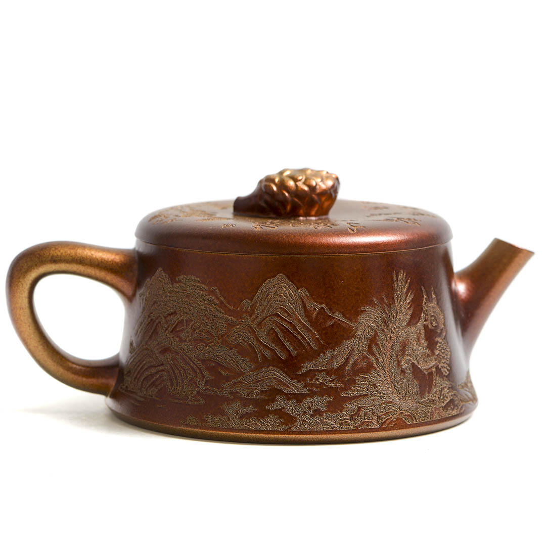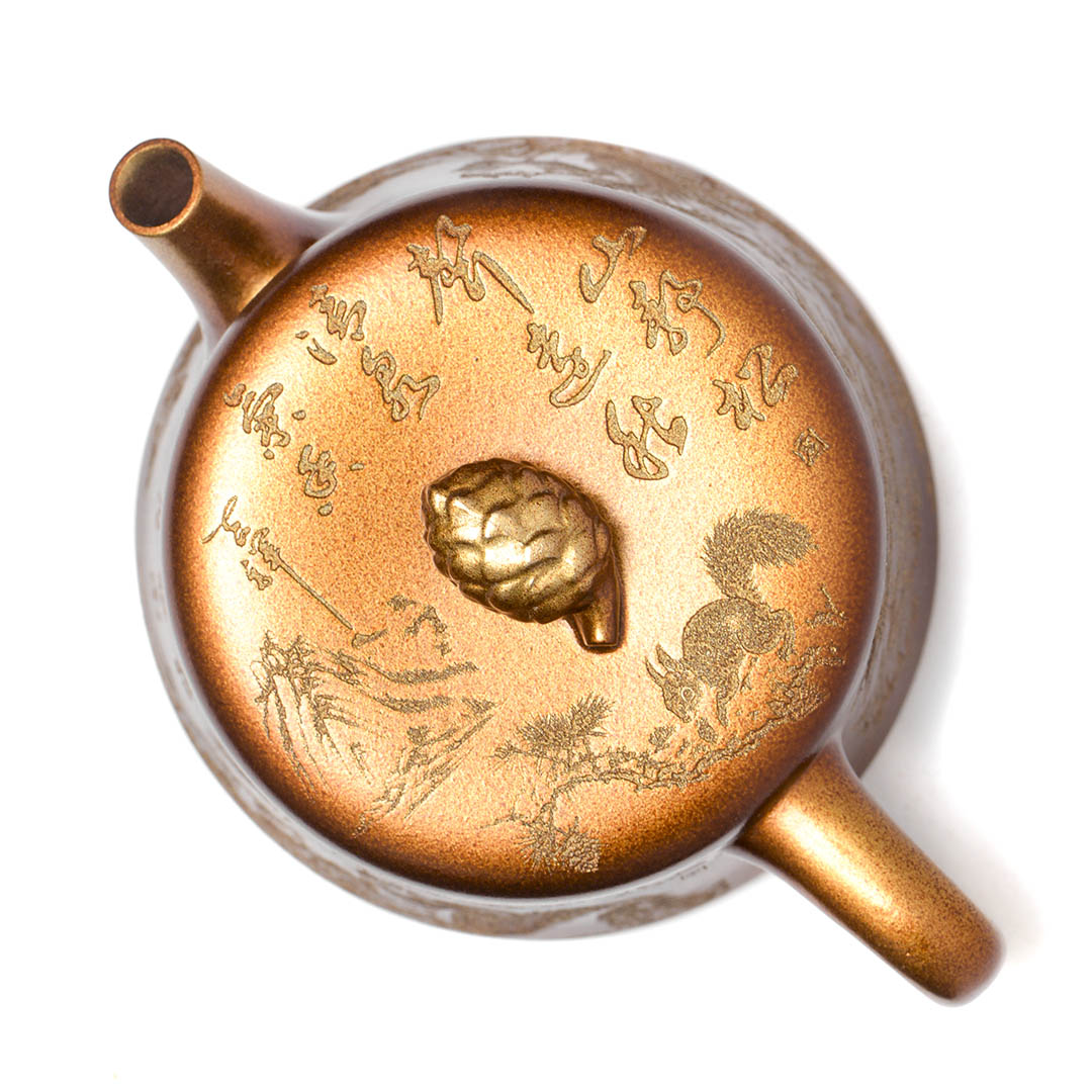 Чайник, донышко и крышка украшены рельефным изображением Белки, держащей шишку на фоне Сосен и Горных Пейзажей. Ручка крышечки выполнена в виде сосновой шишки. Белка в китайской традиции – символ плодородия и изобилия.