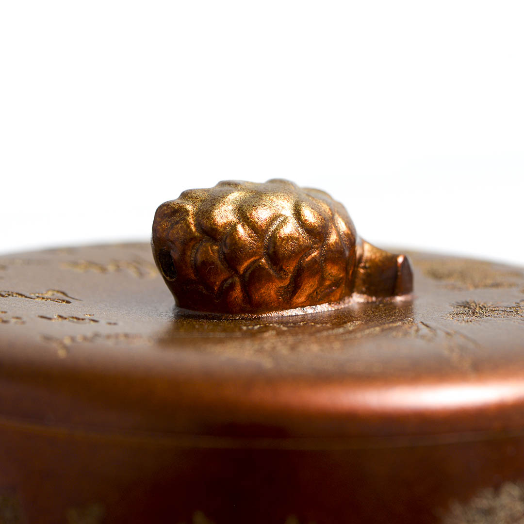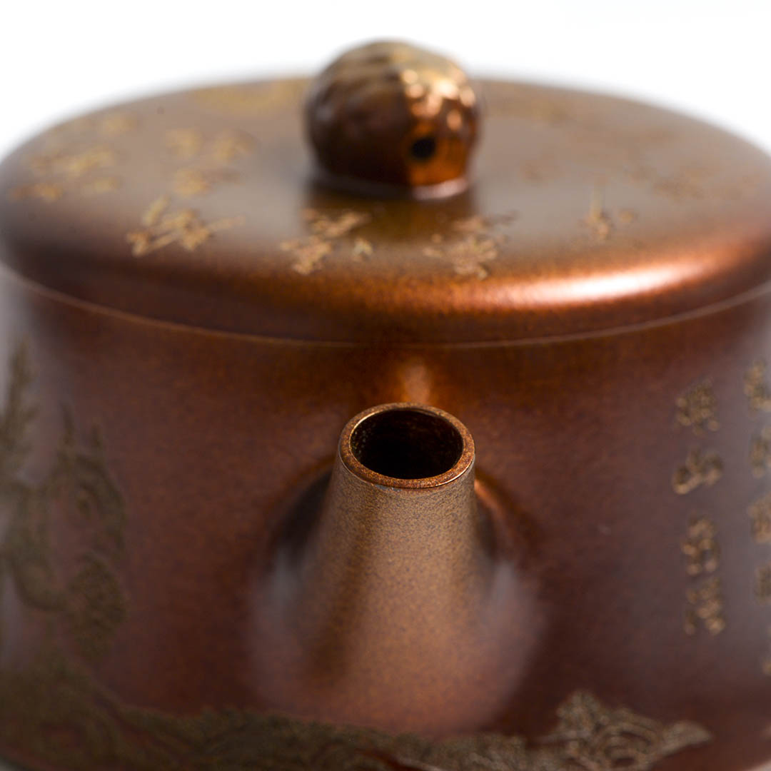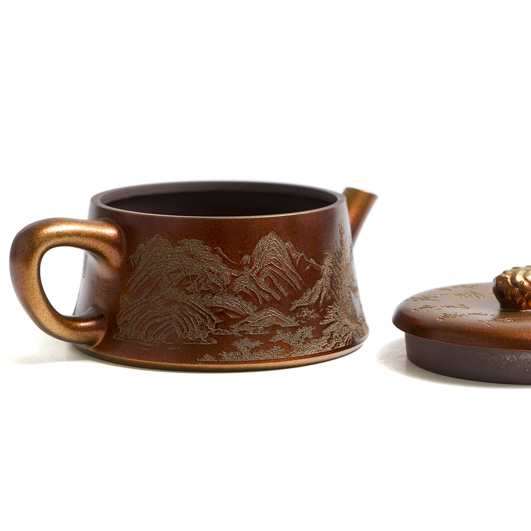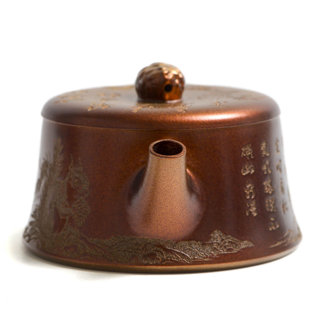 Чайник, донышко и крышка украшены рельефным изображением Белки, держащей шишку на фоне Сосен и Горных Пейзажей. Ручка крышечки выполнена в виде сосновой шишки. Белка в китайской традиции – символ плодородия и изобилия.
