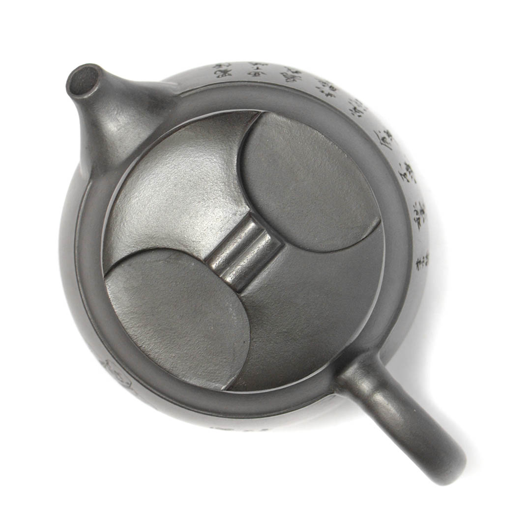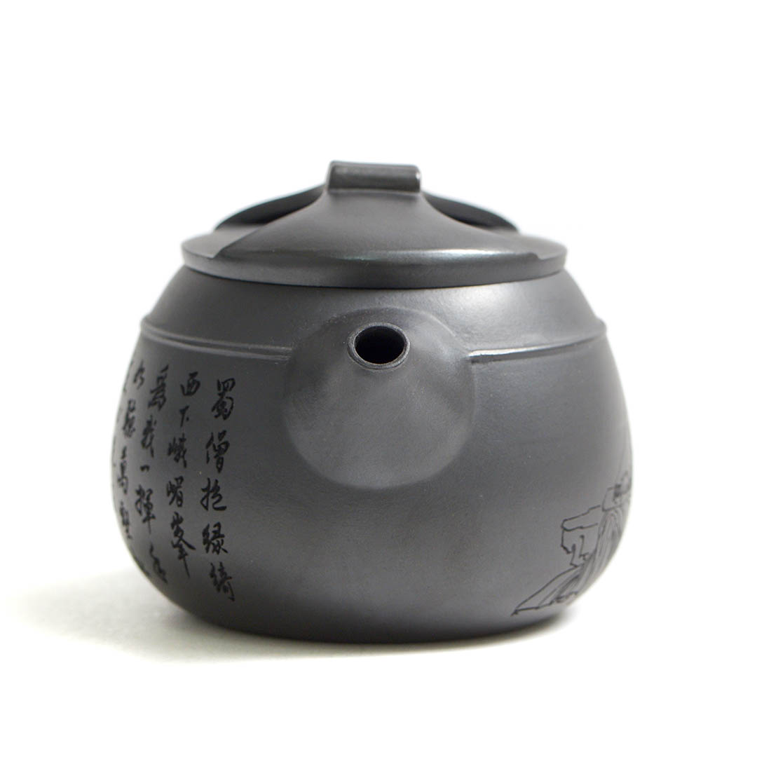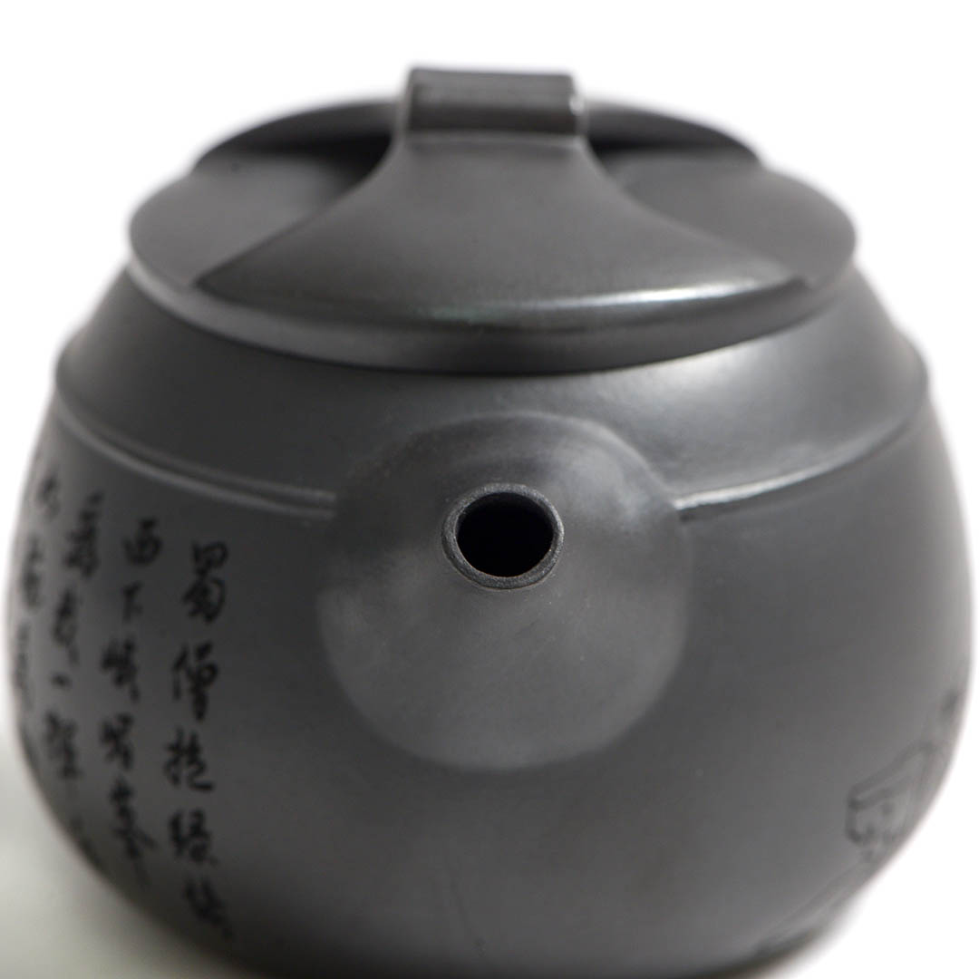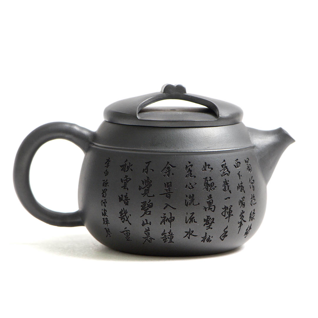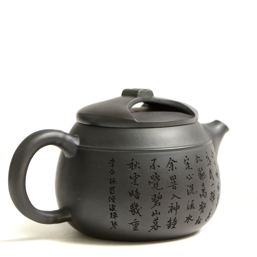 Чайник украшен резными иероглифами — это стихотворение Ли Бо “Слушая, как монах Цзюнь из Шу играет на цине”. Вот полный перевод стиха: