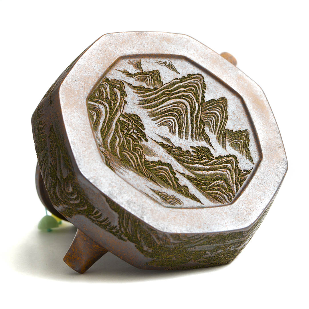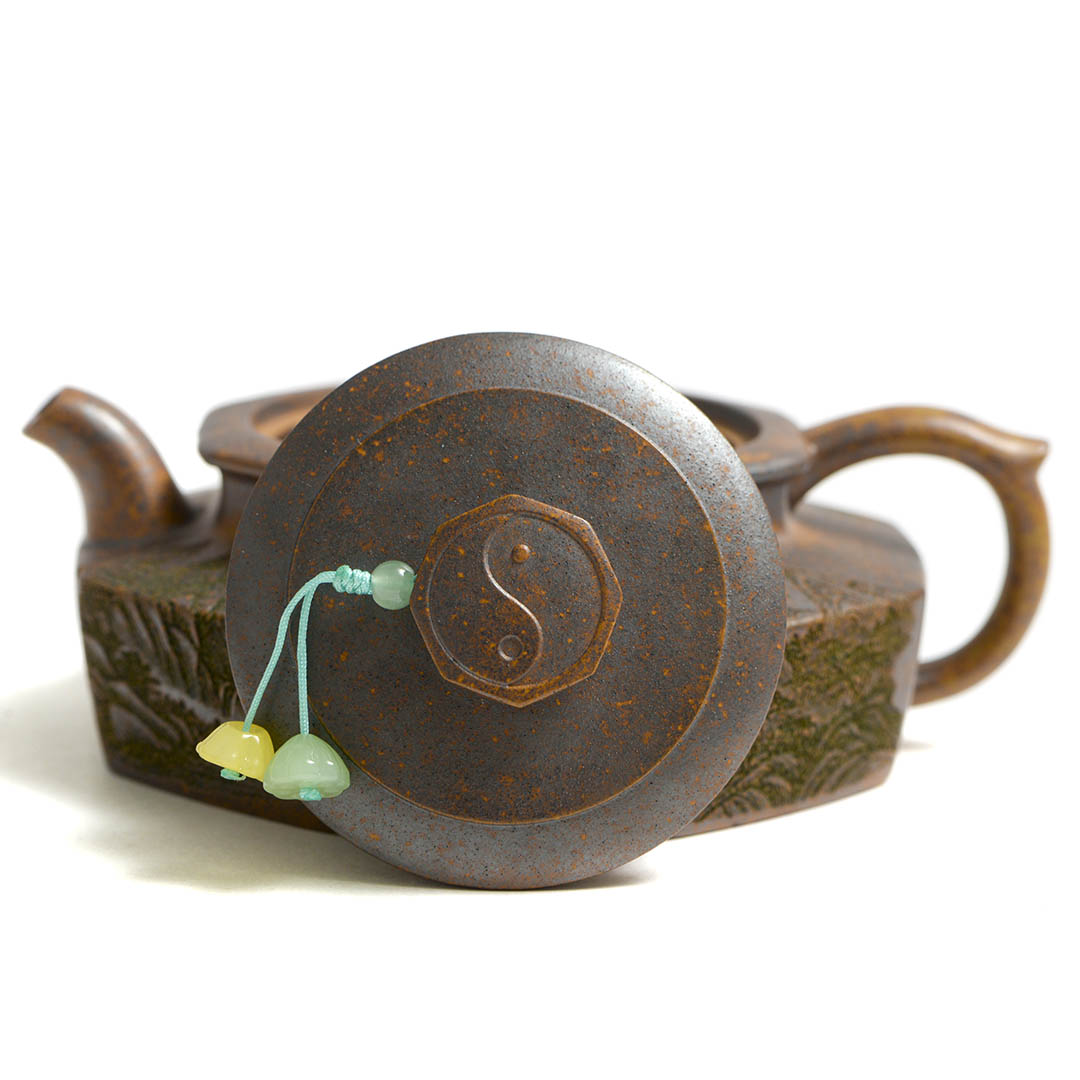 Чайник, как и донышко, украшены красивым, детализированным фактурным изображением Горного Пейзажа, символизируя спокойствие и умиротворение. Ручка крышечки выполнена в виде Тайцзи — знак Инь и Ян, известный как «рыбки» или черно-белый круг, в китайской философии.