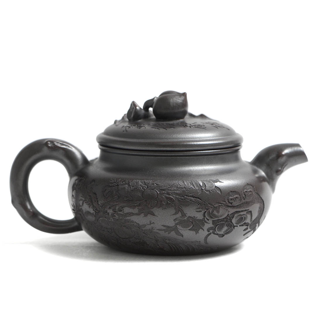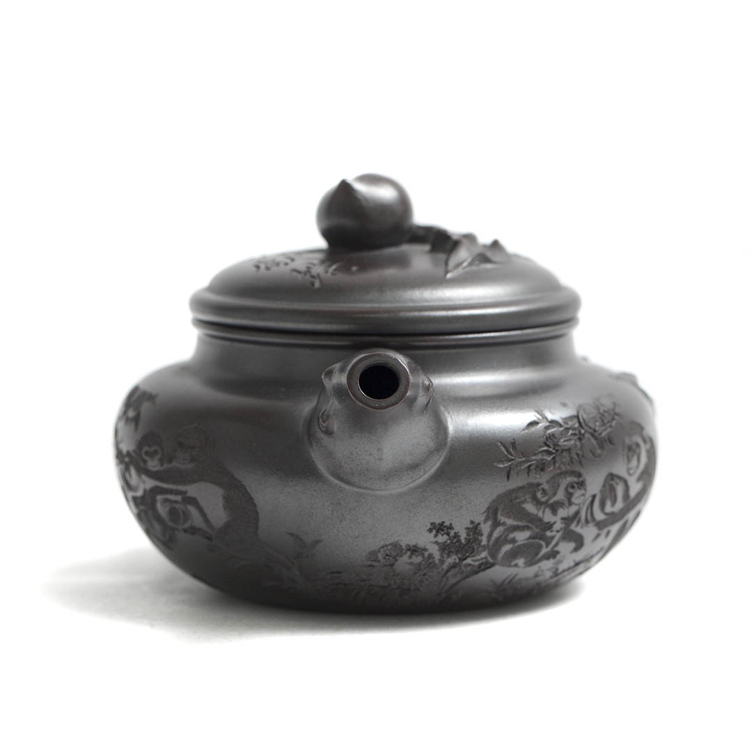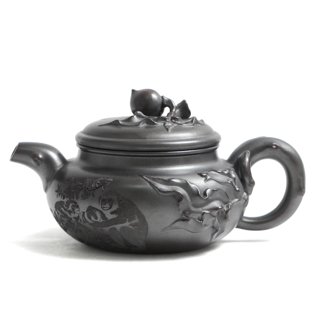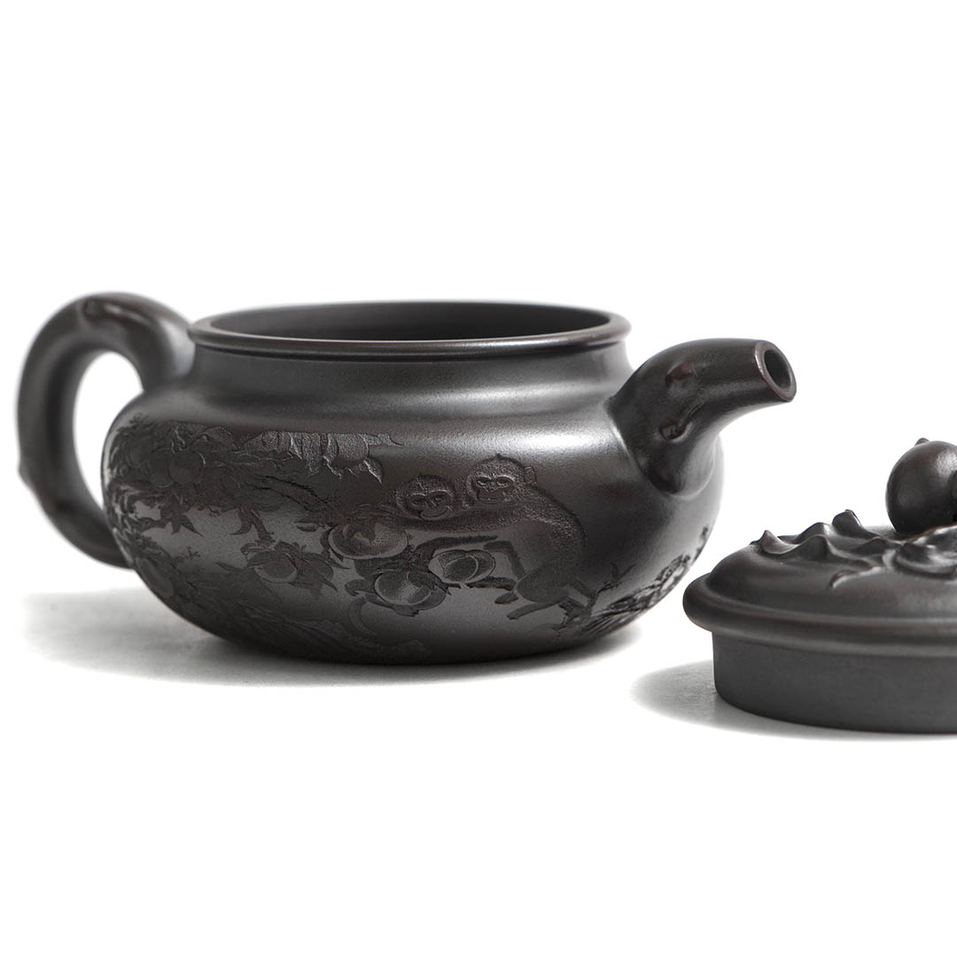 Сам чайник в отдельных местах имеет рельефный декор персикового дерева, на вершине которого, а именно на ручке крышки, расположился плод — персик. Также резными изображениями показаны ветви дерева, к которому тянуться Обезьяны. Само название чайника “Священная обезьяна, приносящая благодать” — это традиционный китайский сюжет, символизирующий пожелание долголетия, удачи и мудрости. Обезьяна здесь выступает как проводник благодатных сил природы.