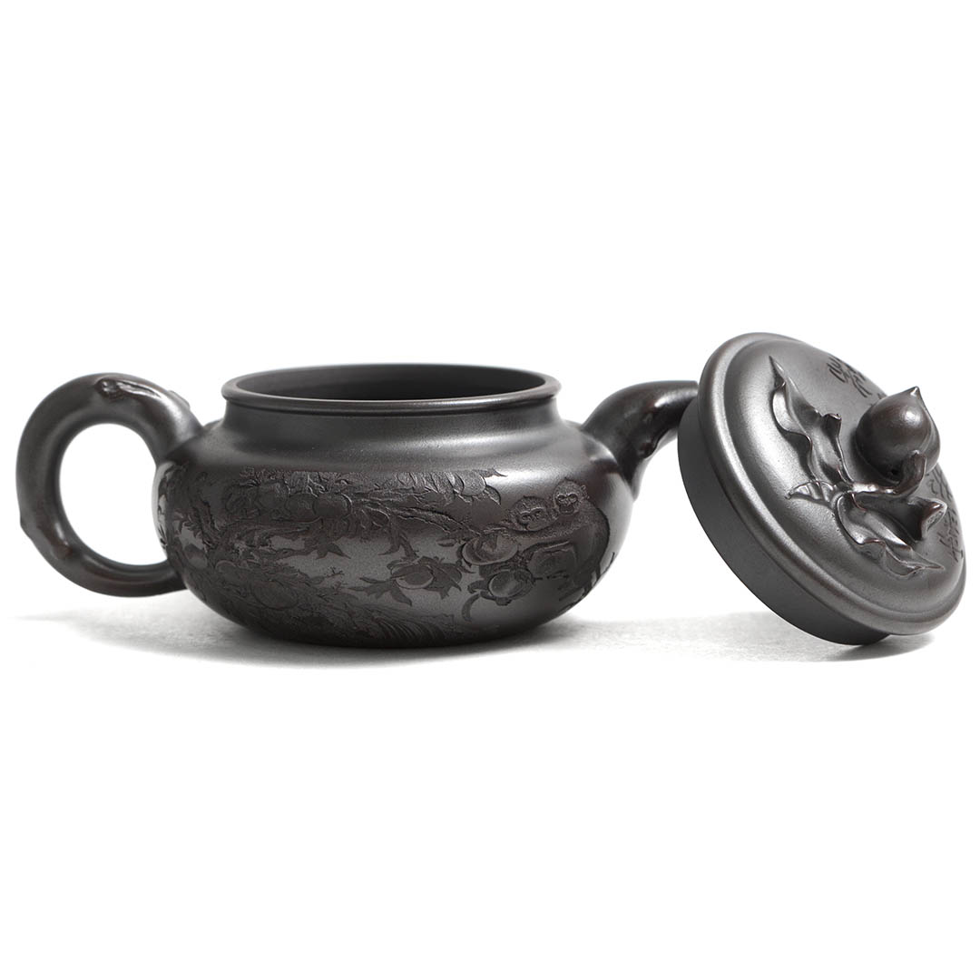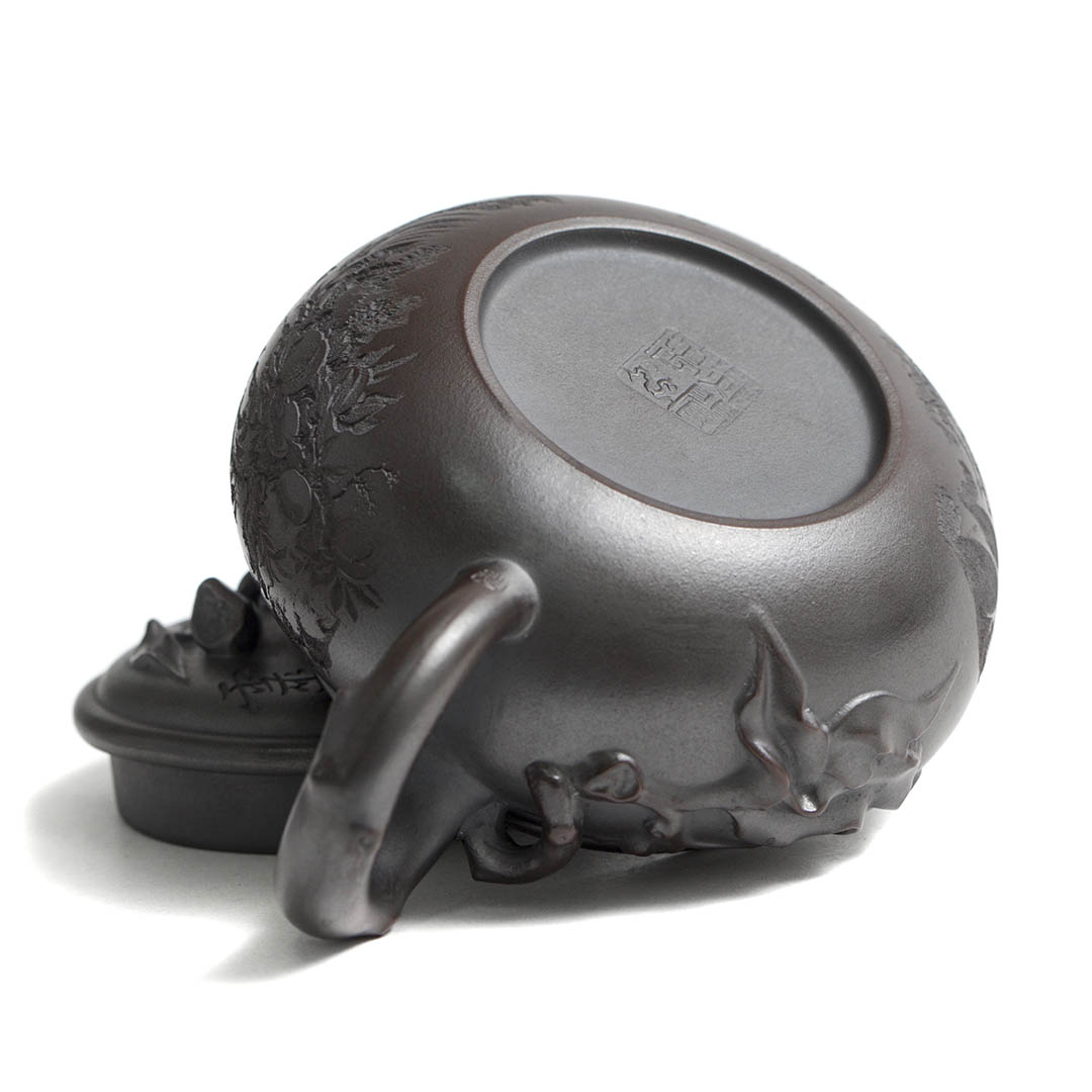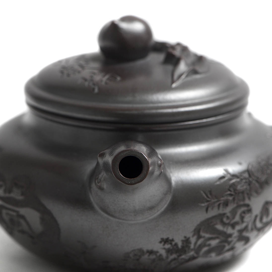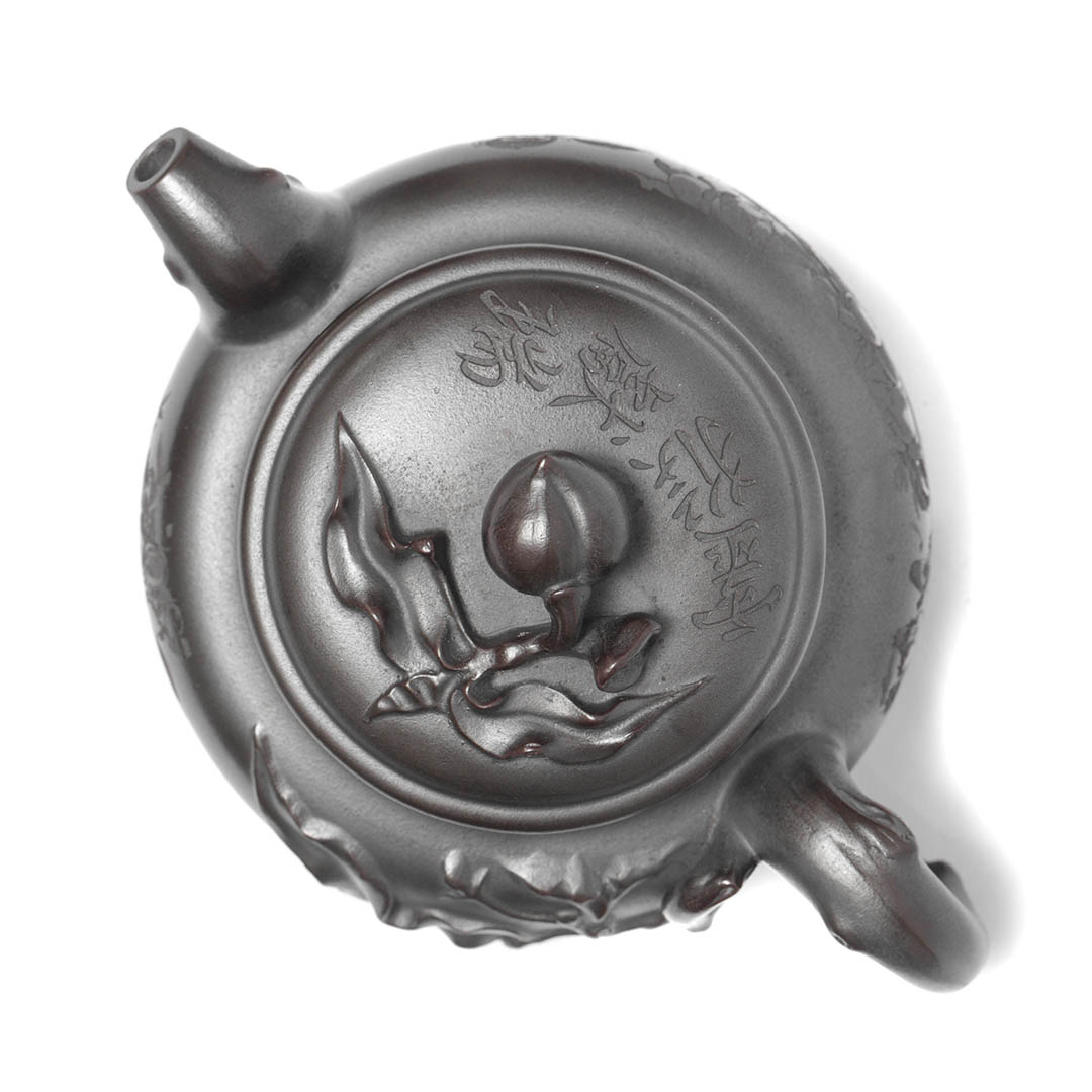 Сам чайник в отдельных местах имеет рельефный декор персикового дерева, на вершине которого, а именно на ручке крышки, расположился плод — персик. Также резными изображениями показаны ветви дерева, к которому тянуться Обезьяны. Само название чайника “Священная обезьяна, приносящая благодать” — это традиционный китайский сюжет, символизирующий пожелание долголетия, удачи и мудрости. Обезьяна здесь выступает как проводник благодатных сил природы.