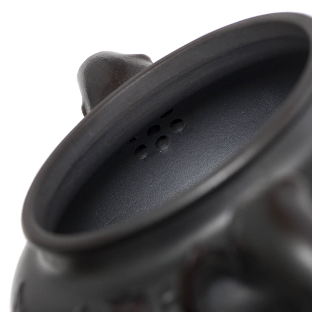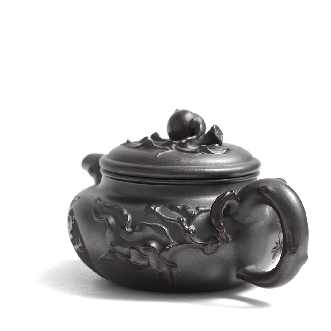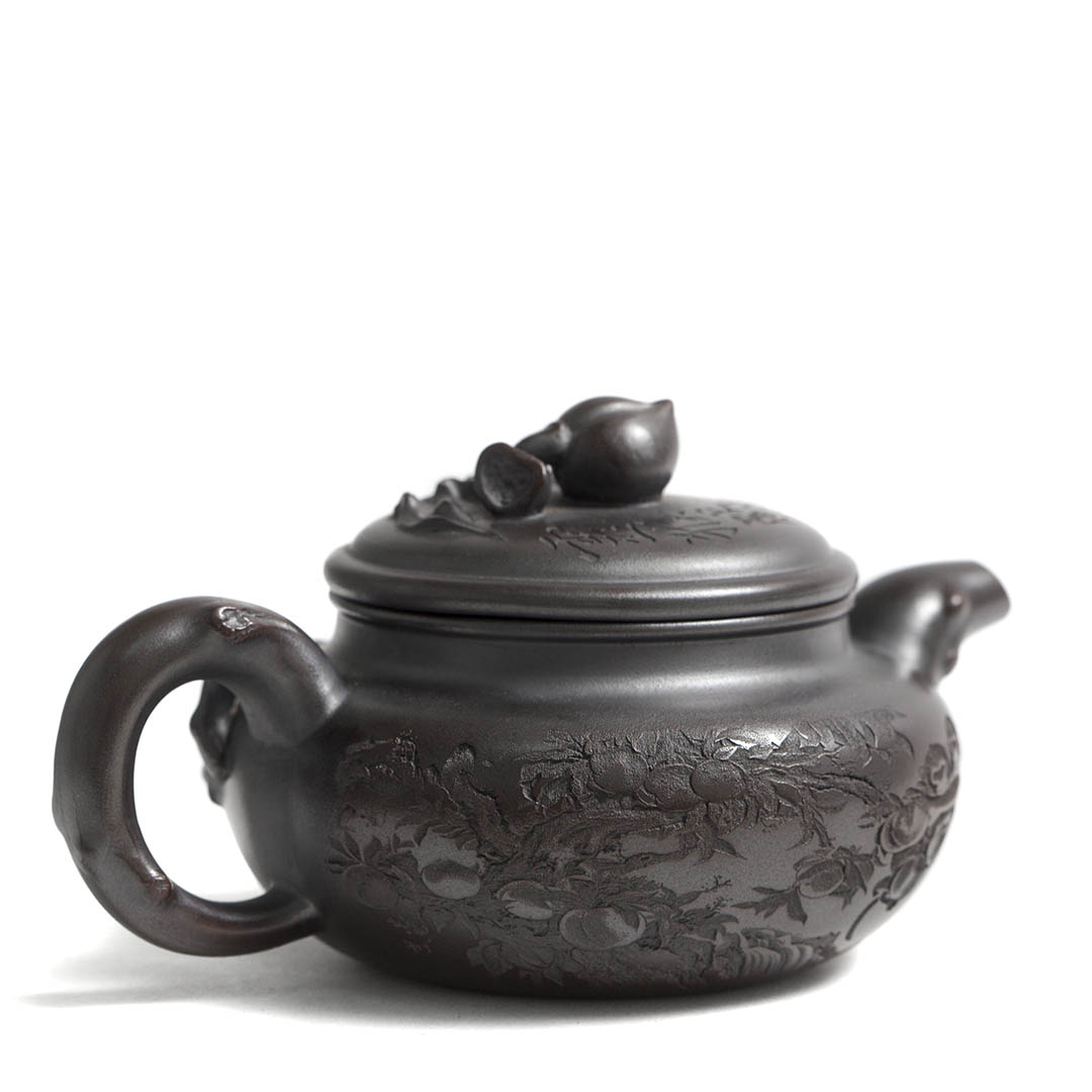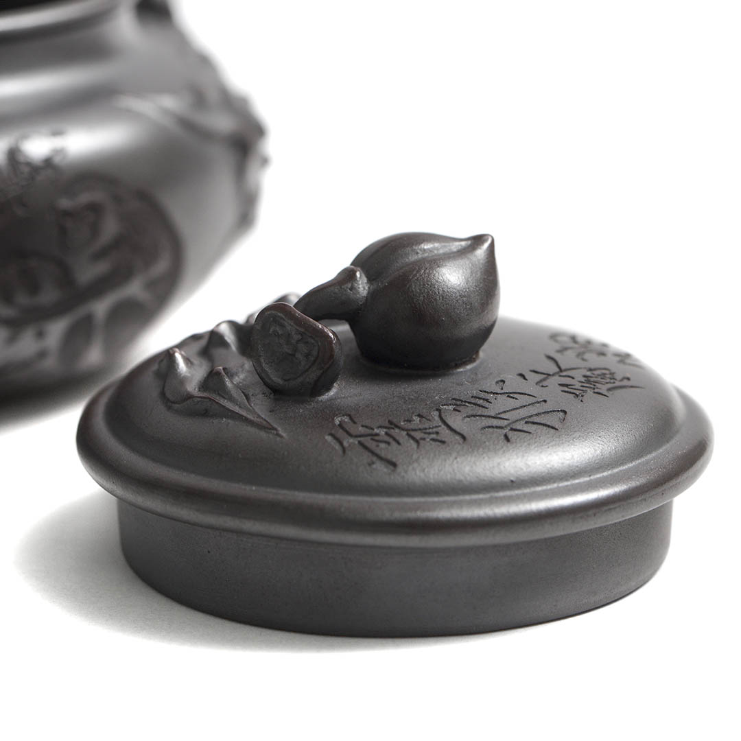 Сам чайник в отдельных местах имеет рельефный декор персикового дерева, на вершине которого, а именно на ручке крышки, расположился плод — персик. Также резными изображениями показаны ветви дерева, к которому тянуться Обезьяны. Само название чайника “Священная обезьяна, приносящая благодать” — это традиционный китайский сюжет, символизирующий пожелание долголетия, удачи и мудрости. Обезьяна здесь выступает как проводник благодатных сил природы.