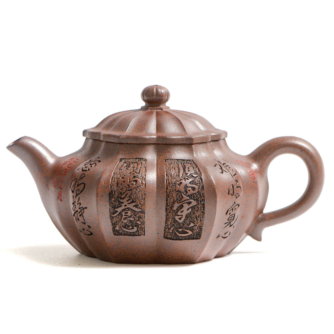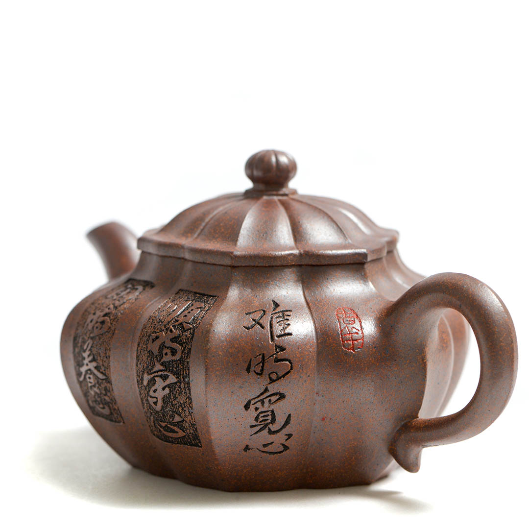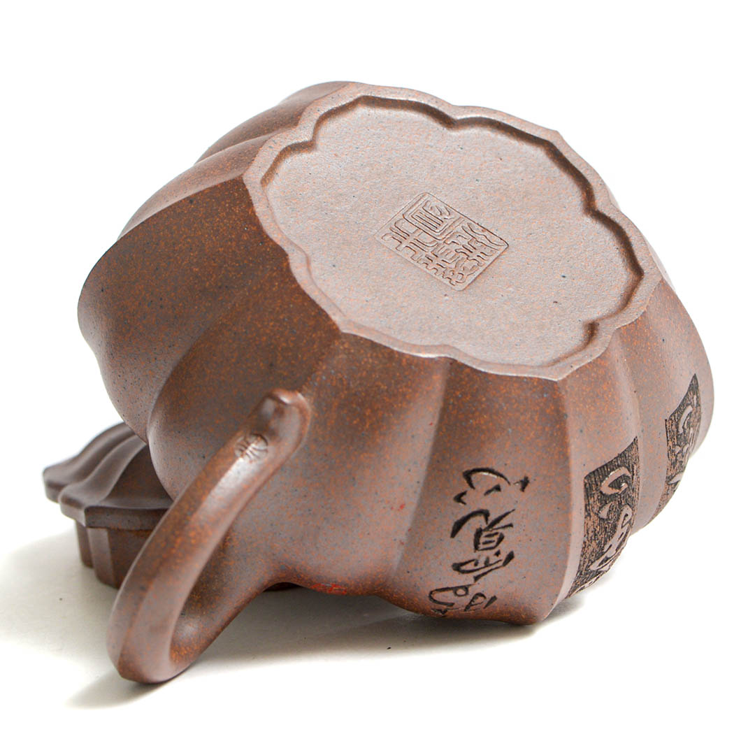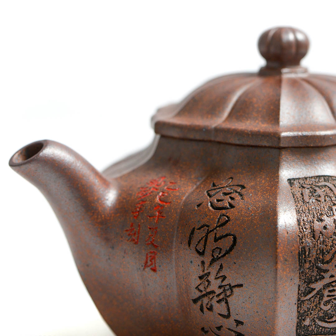 Каждый этап создания — от формовки до финишной отделки — выполнен вручную. Поверхность чайника украшена с помощью традиционной техники резьбы по глине. Острым стальным резцом мастер нанес иероглифы, которые переводятся как: