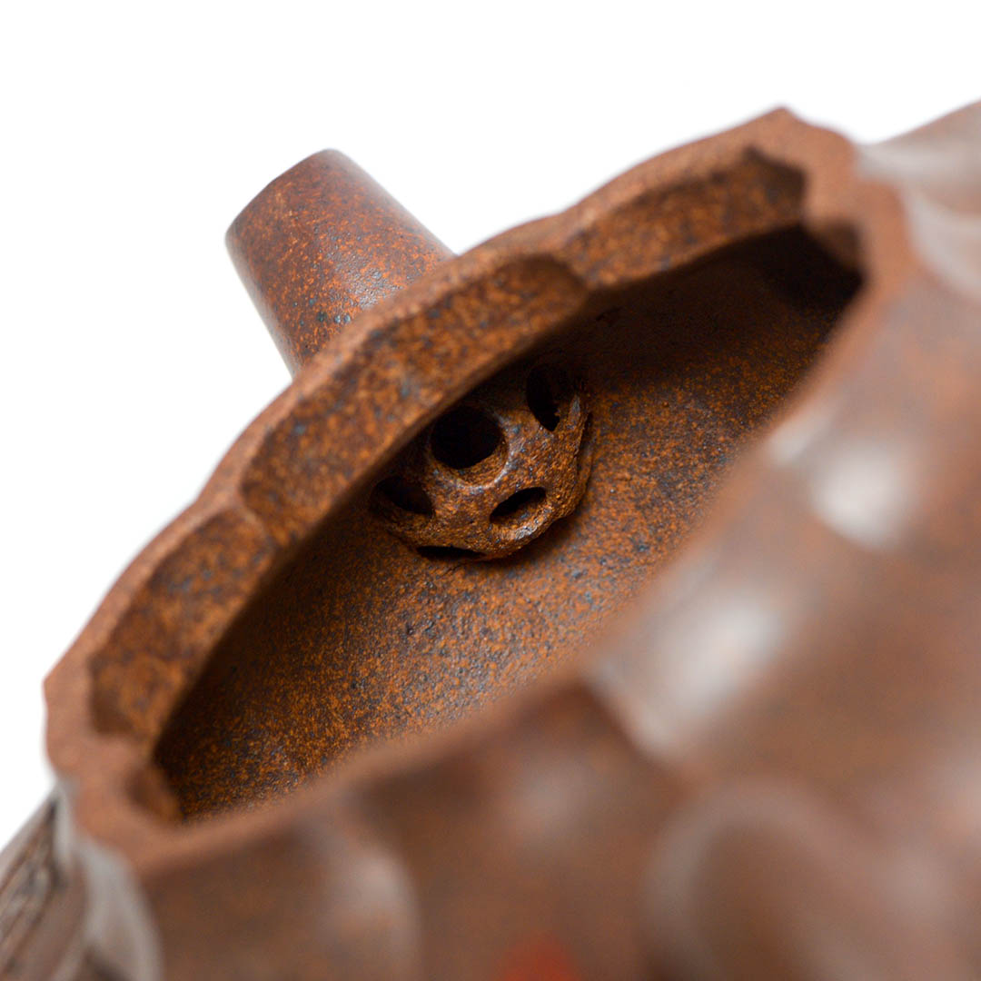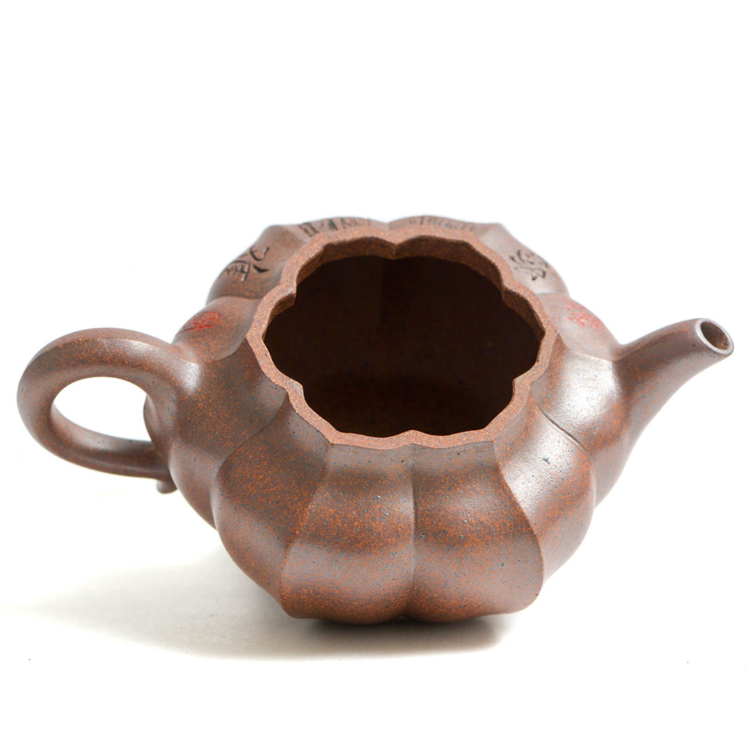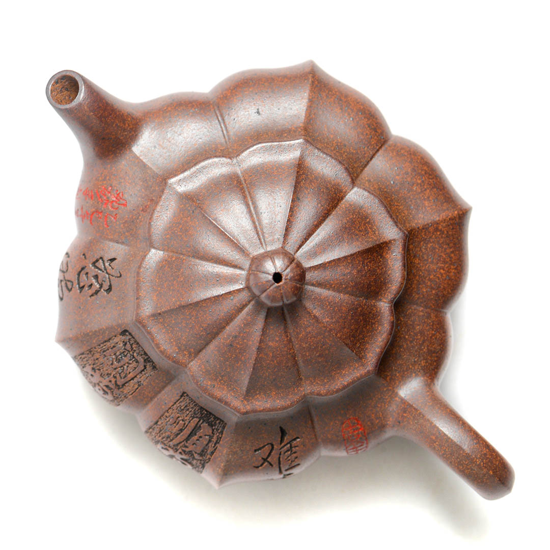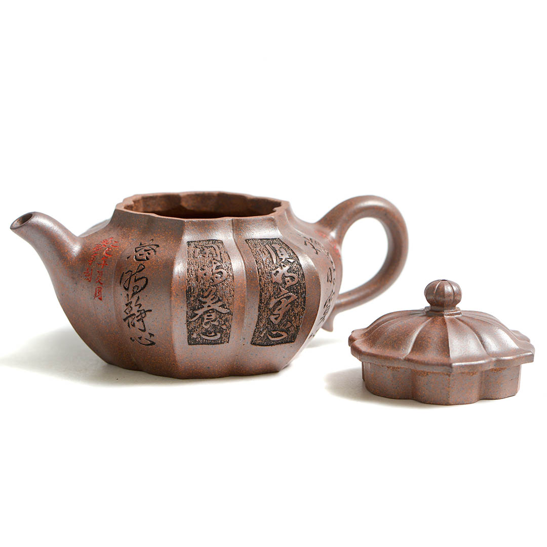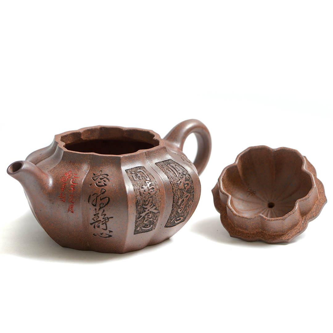 Каждый этап создания — от формовки до финишной отделки — выполнен вручную. Поверхность чайника украшена с помощью традиционной техники резьбы по глине. Острым стальным резцом мастер нанес иероглифы, которые переводятся как: