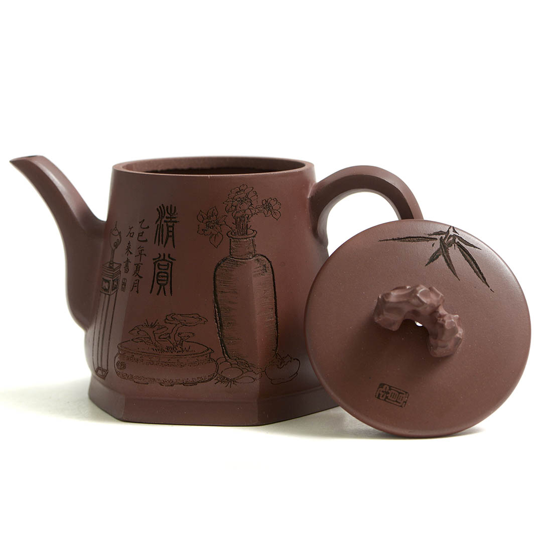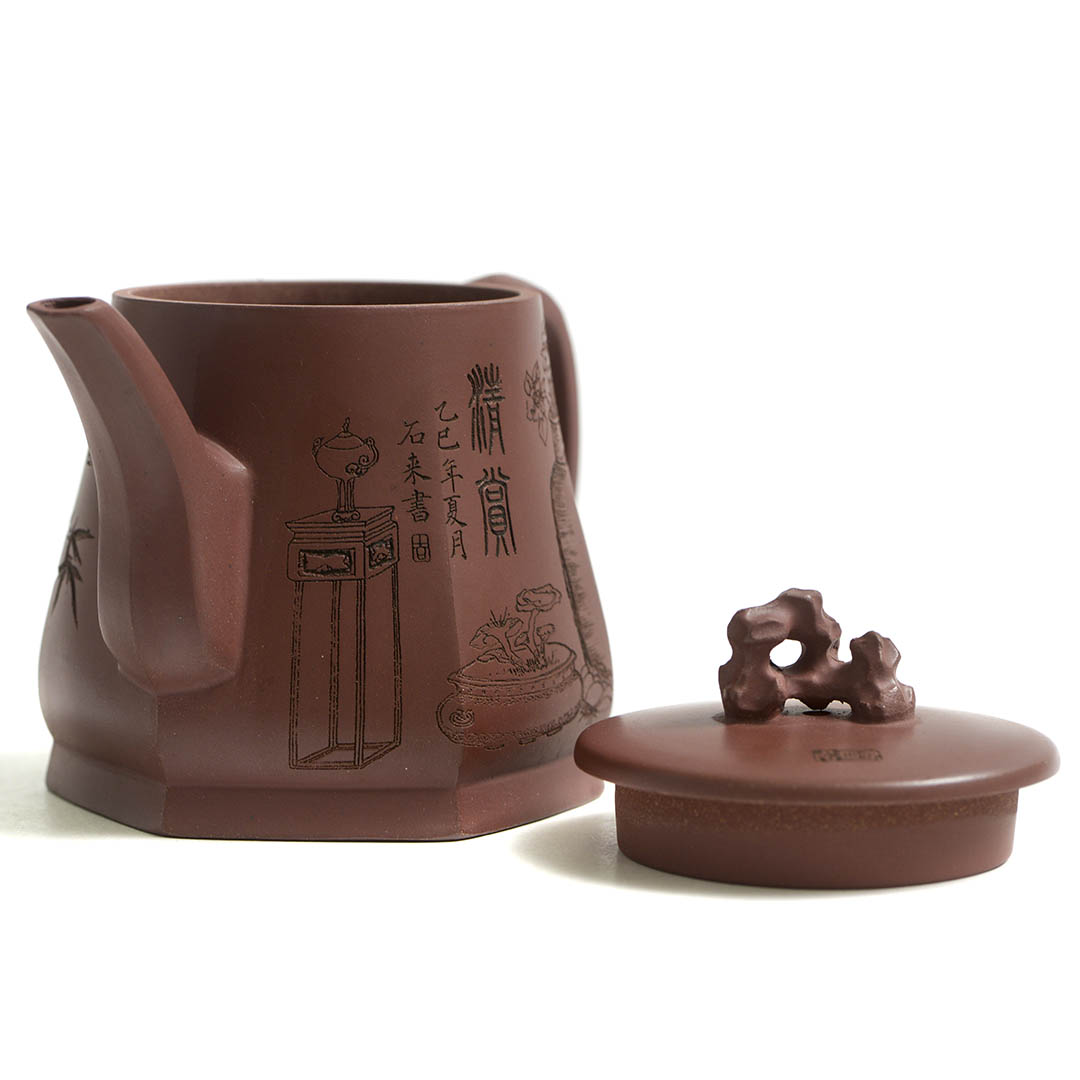Название чайника отсылает к резному изображению на нем. В китайском языке иероглиф 静, входящий в термин «натюрморт» — 静物, означает «тишина», «покой», «неподвижность». Название 静趣 обыгрывает этот иероглиф, добавляя к нему 趣 — «интерес», «изюминка», «вкус», что в целом передает идею: красота тихих, неподвижных предметов раскрывается как источник утонченного наслаждения.