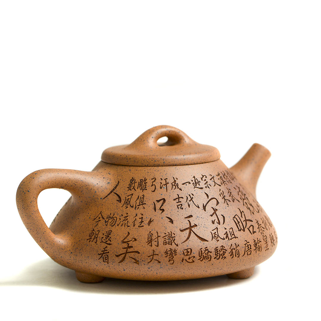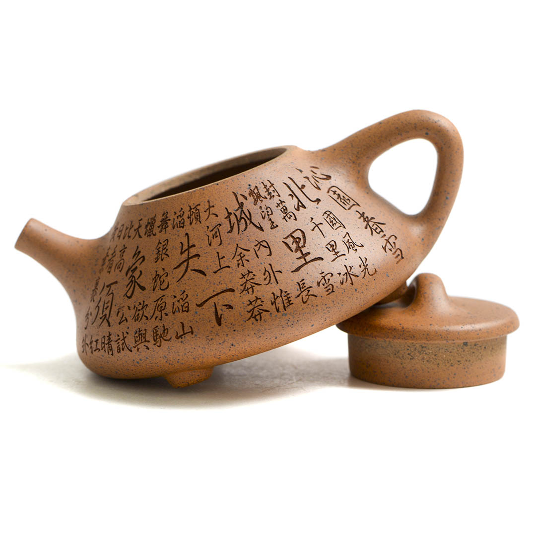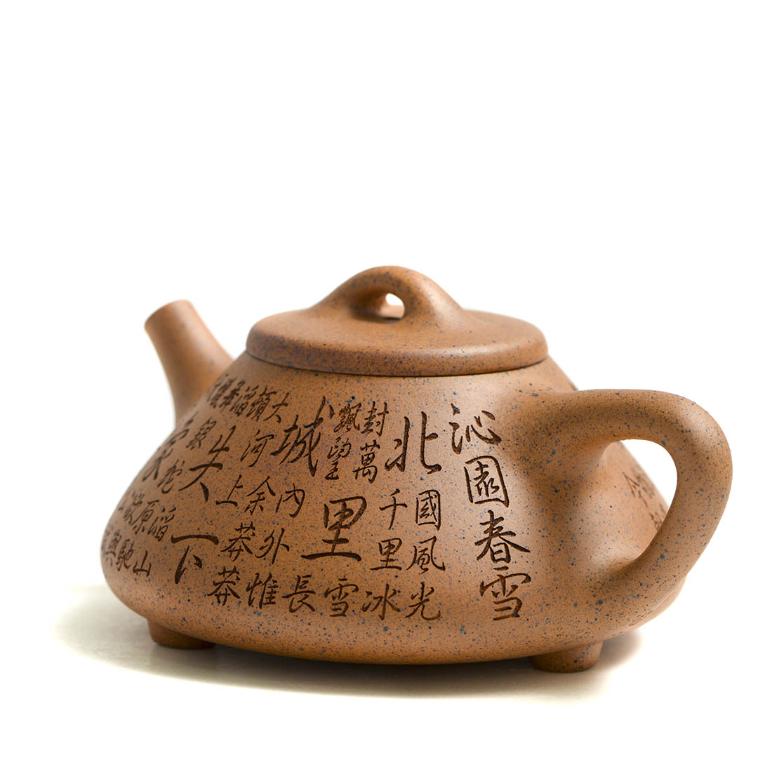 Тело чайника украшено иероглифами, это фрагмент стихотворения “Наблюдая за охотой” поэта Ван Вэя (王维, эпоха Тан), в таком переводе: