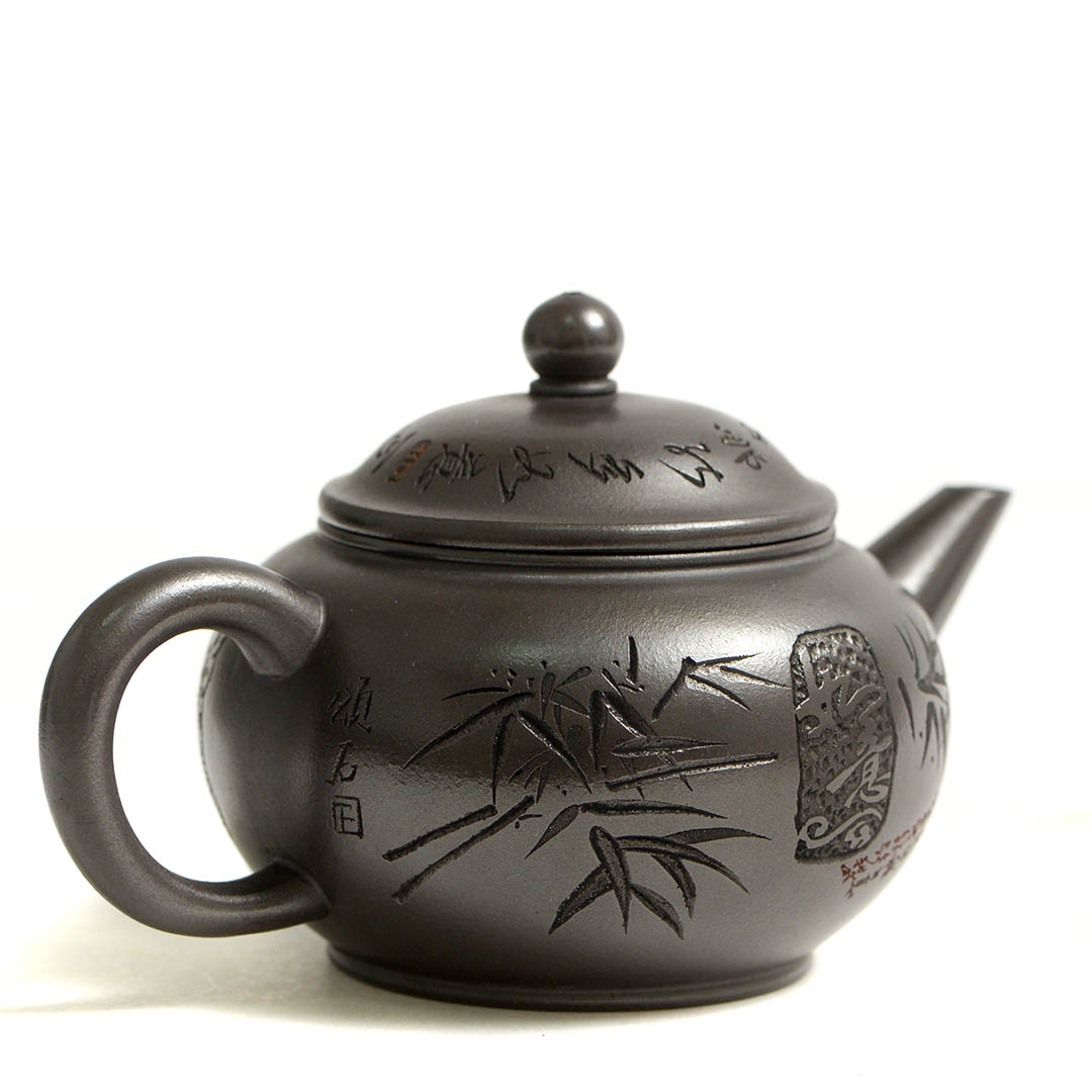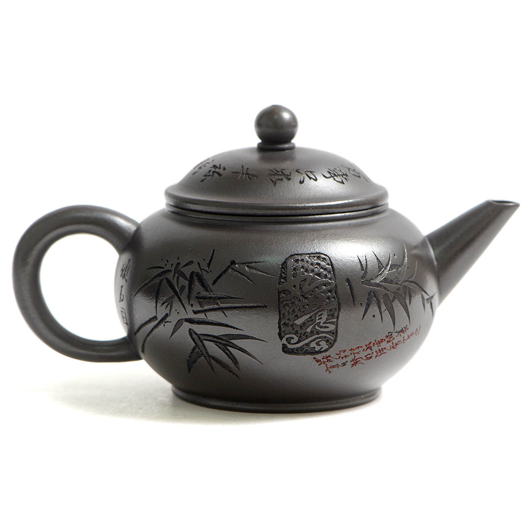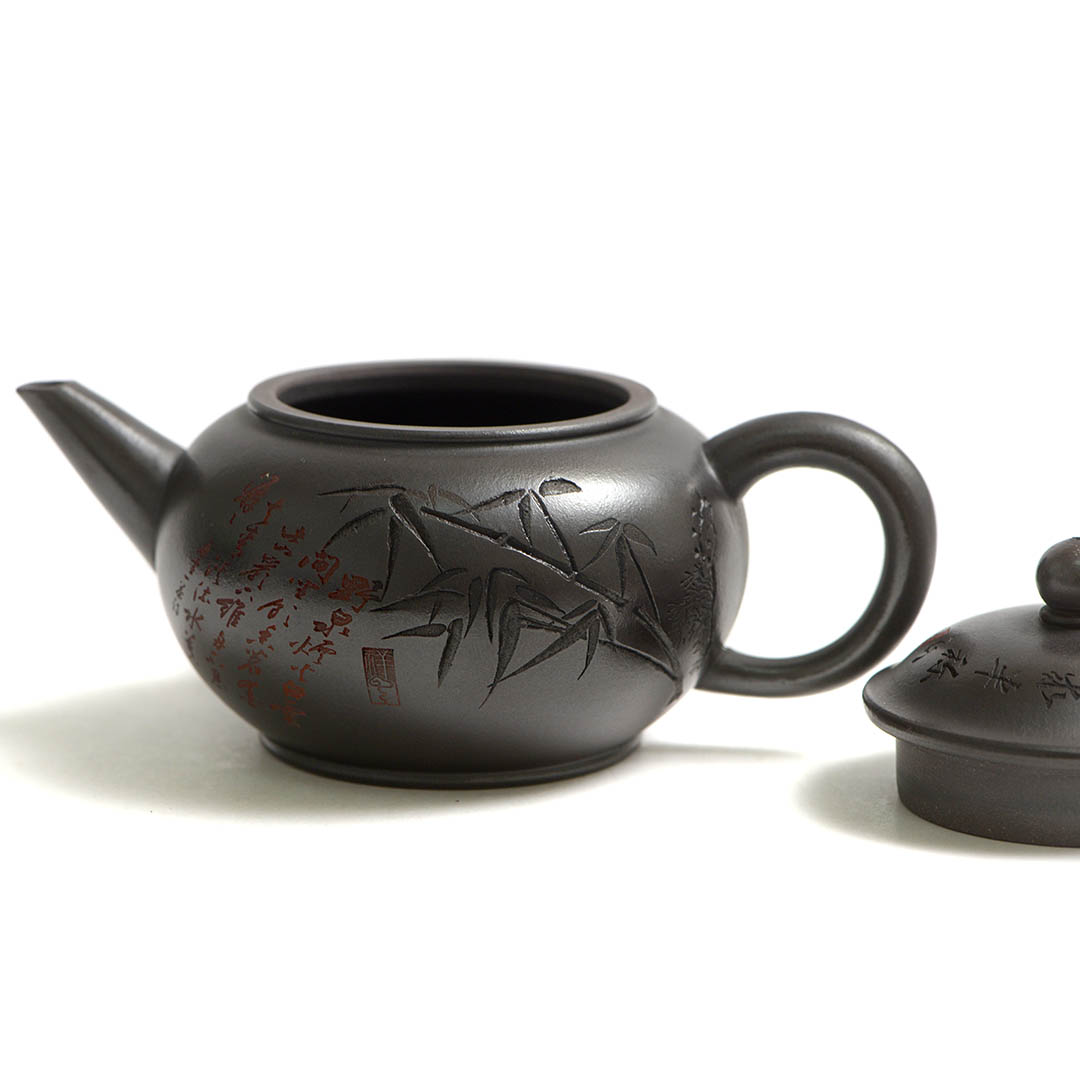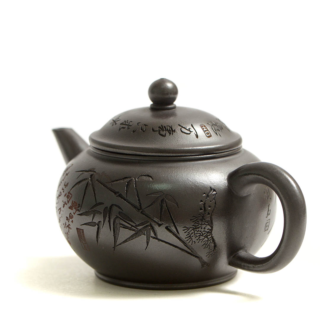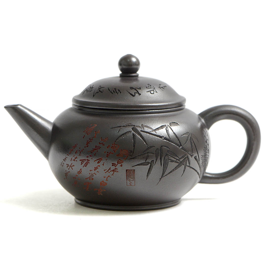 Тело чайника украшено резными изображениями бамбука, который является символом долголетия и стойкости к жизненным невзгодам.