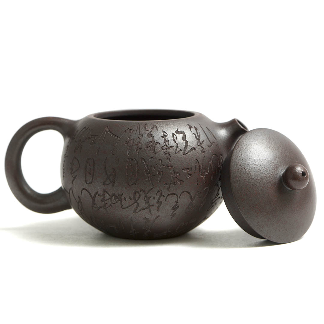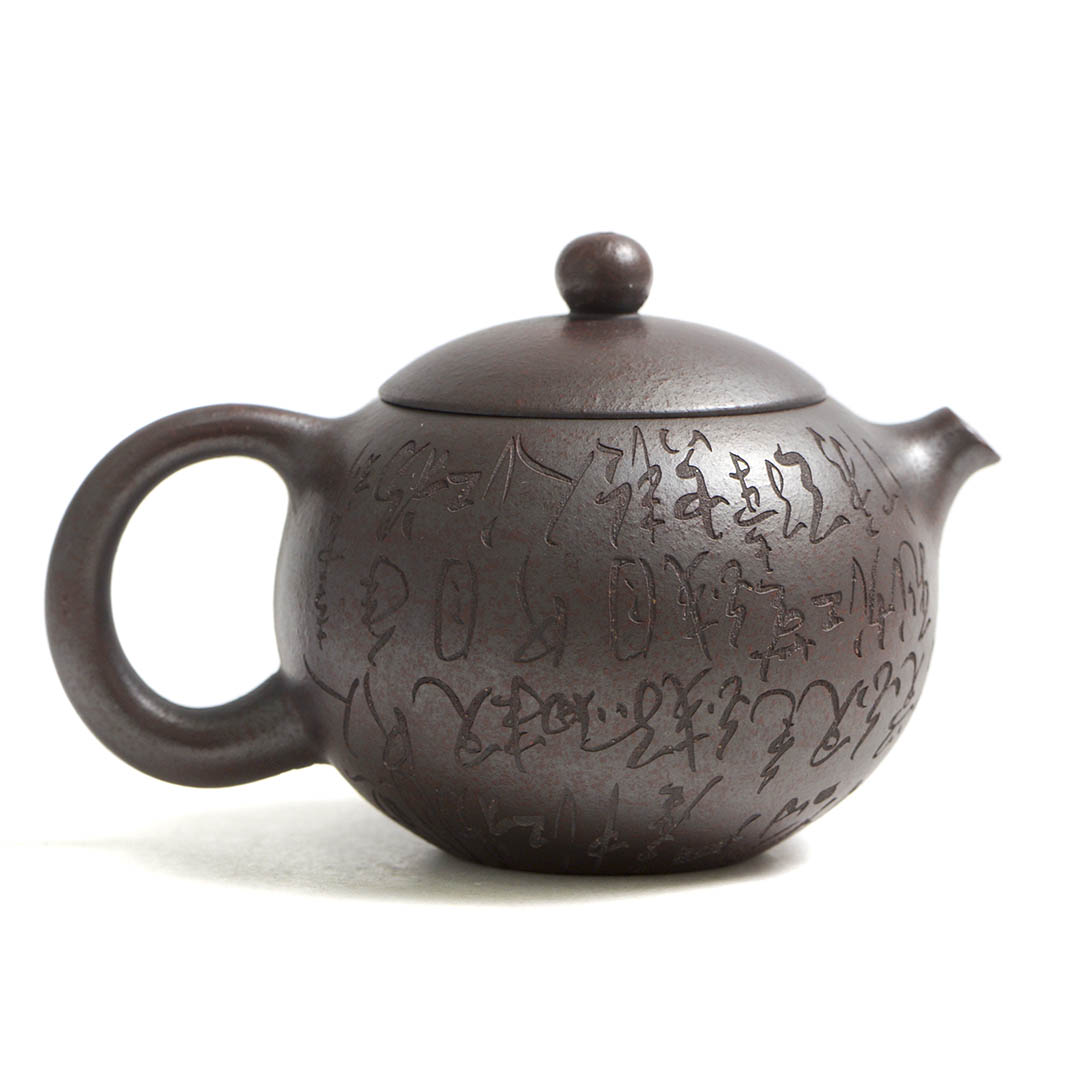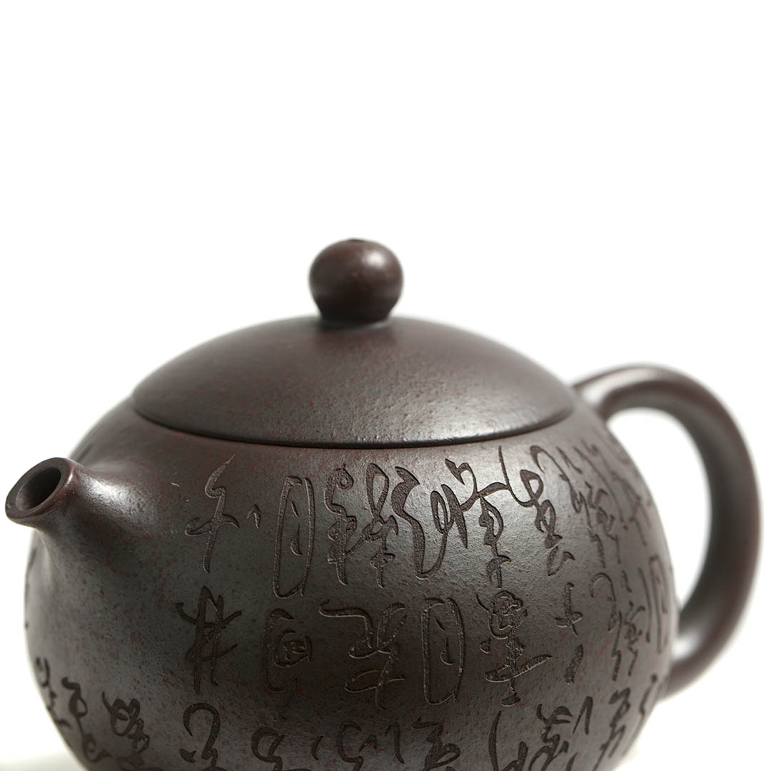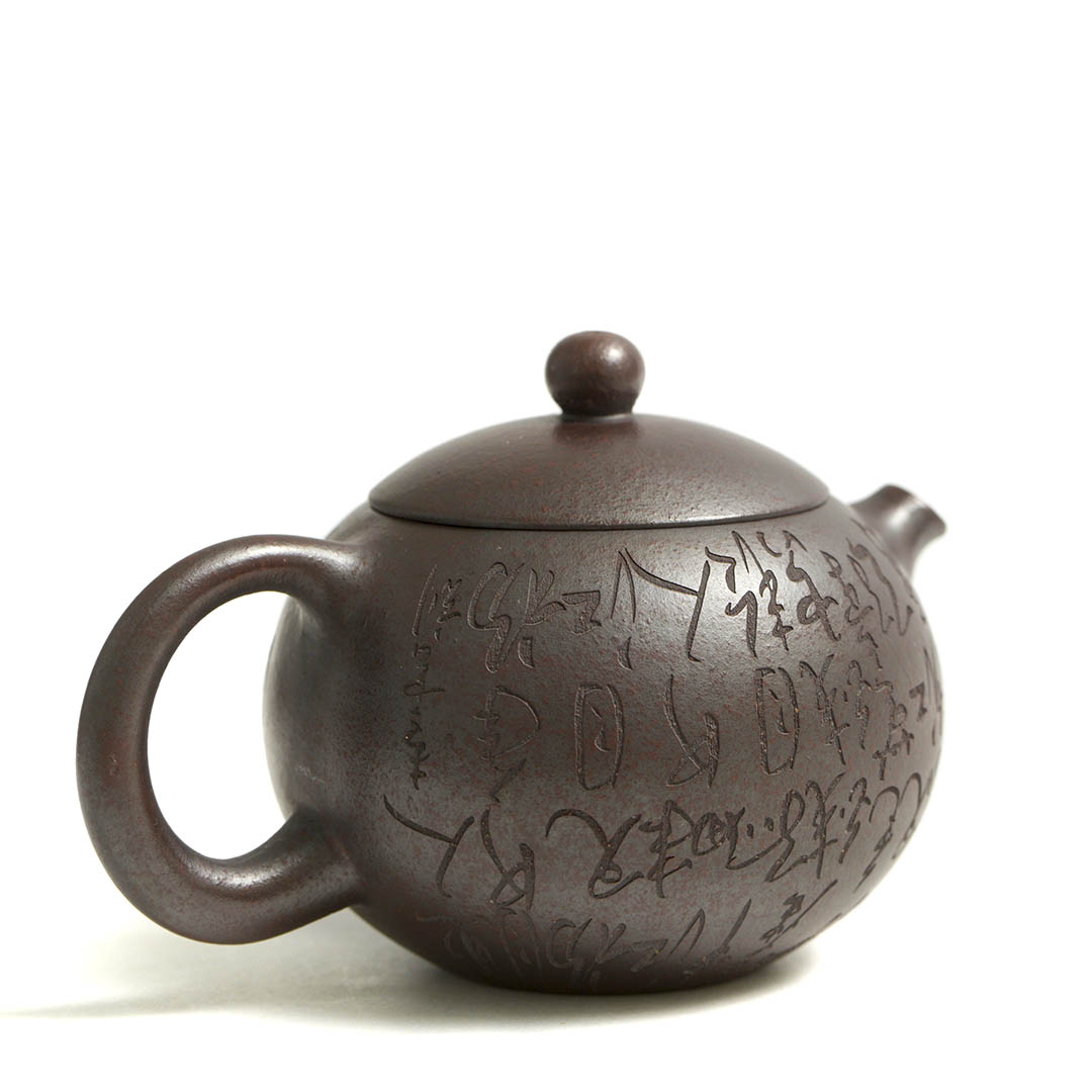 Название чайника отсылает к стилю написания иероглифов, изображенных на нем. Это 草书 — “Скоропись”, или же очень свободная каллиграфия. Это высшая ступень китайской каллиграфии, где главными становятся не четкость иероглифов, а динамика, эмоция и индивидуальность мастера. Это искусство «танцующей кисти», где линии связываются в единый стремительный поток, подобный порыву ветра.