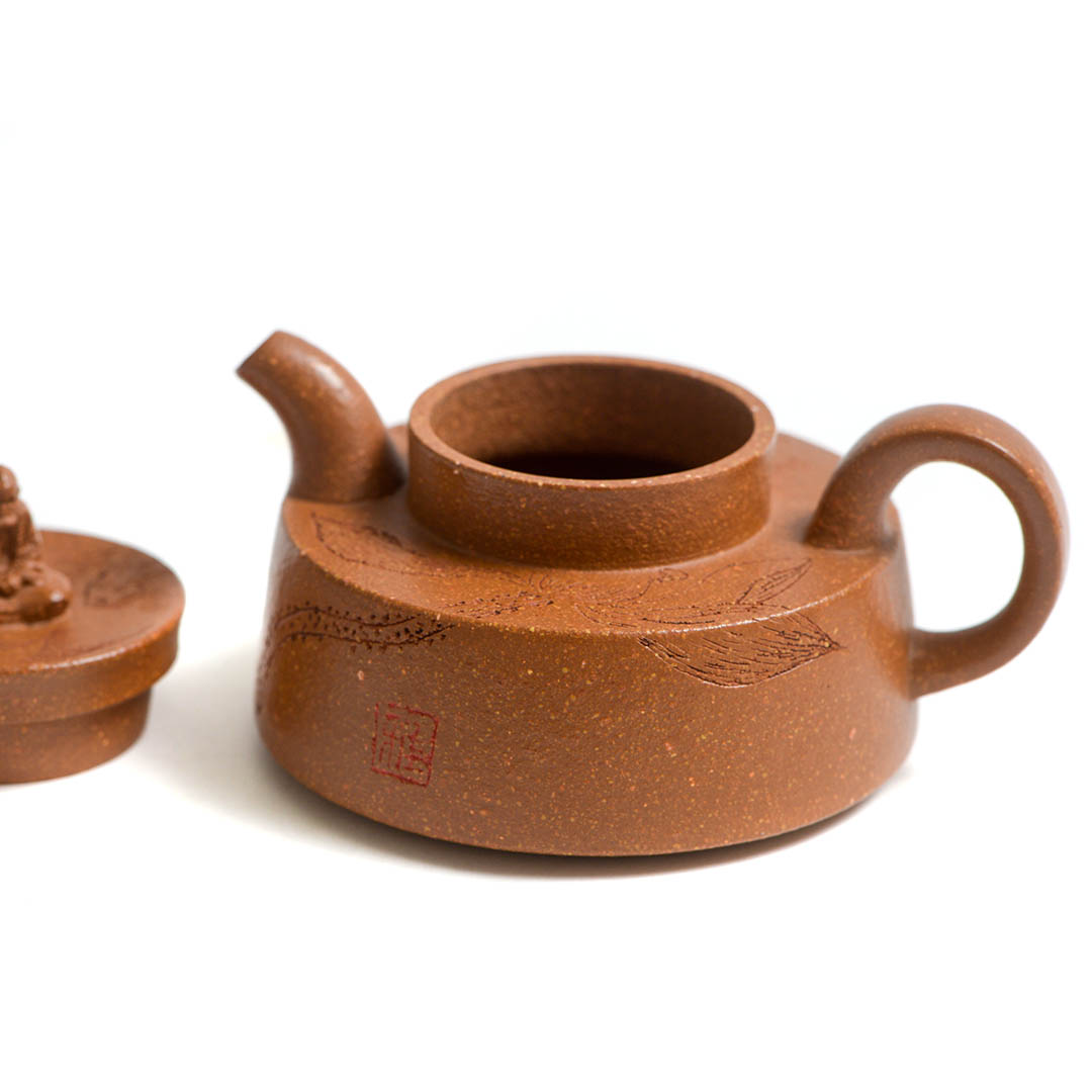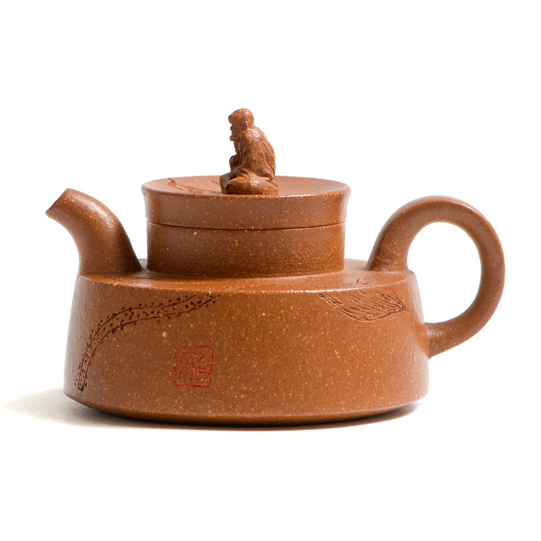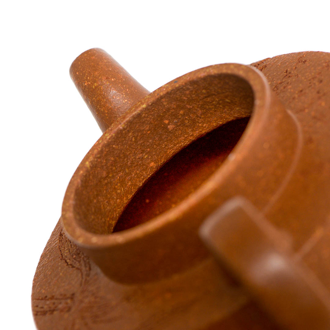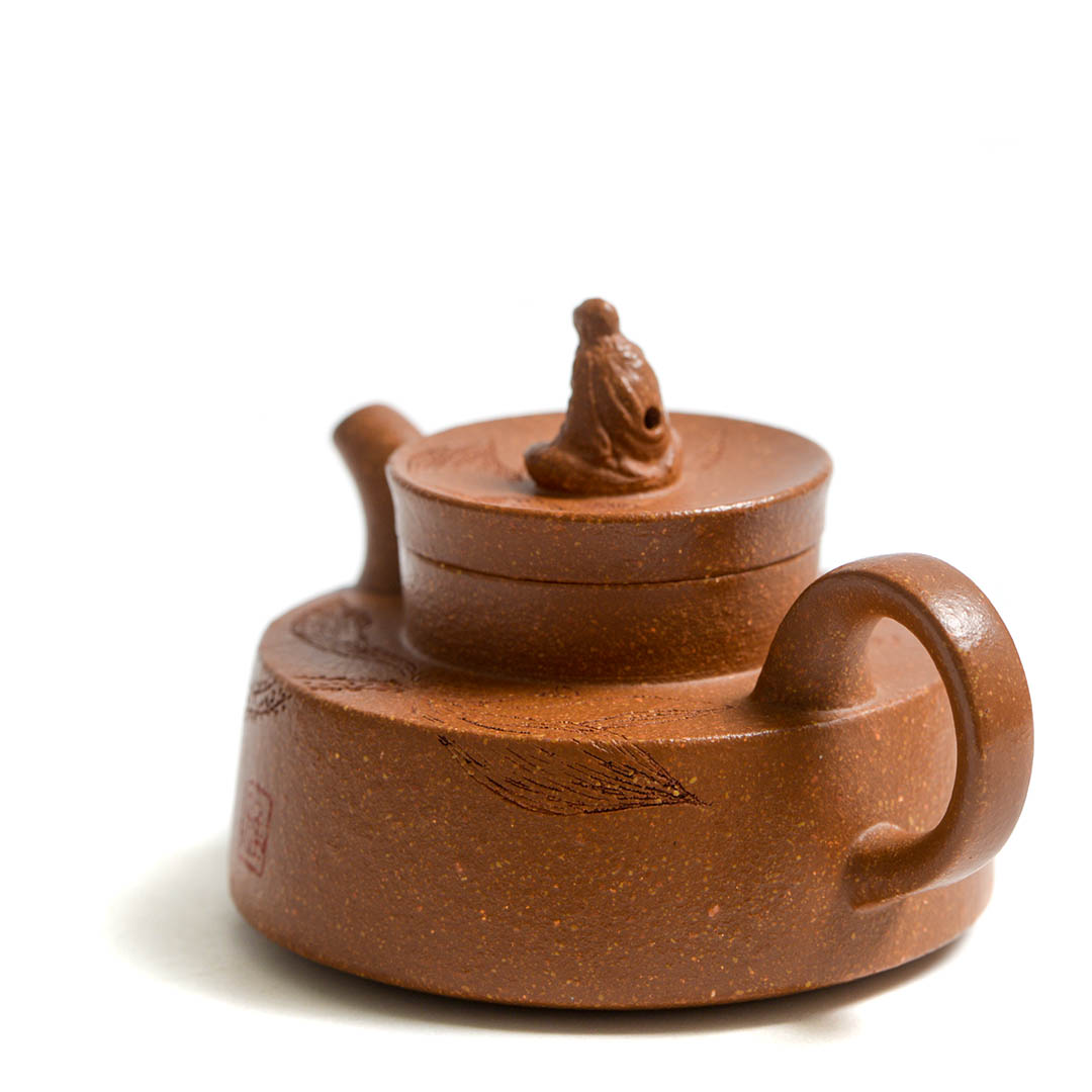 Выполнен из исинской глины Цзянь По Ни (Оранжевая или склоновая глина), как утверждает автор, вследствие неоднородности глины, поры, образующиеся на границе между различными фракциями образуют более легкую и пористую структуру. Это способствует быстрому нагреванию и более долгому сохранению тепла, что полезно, как для поддержания температуры воды, так и для более полного раскрытия вкуса и аромата чая. От себя можем добавить, что чайник действительно намного легче, чем кажется.