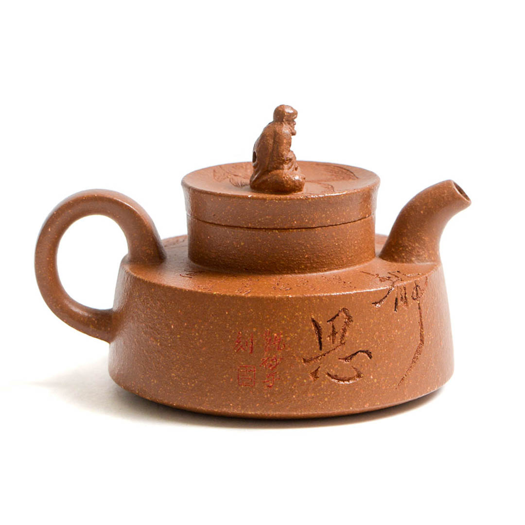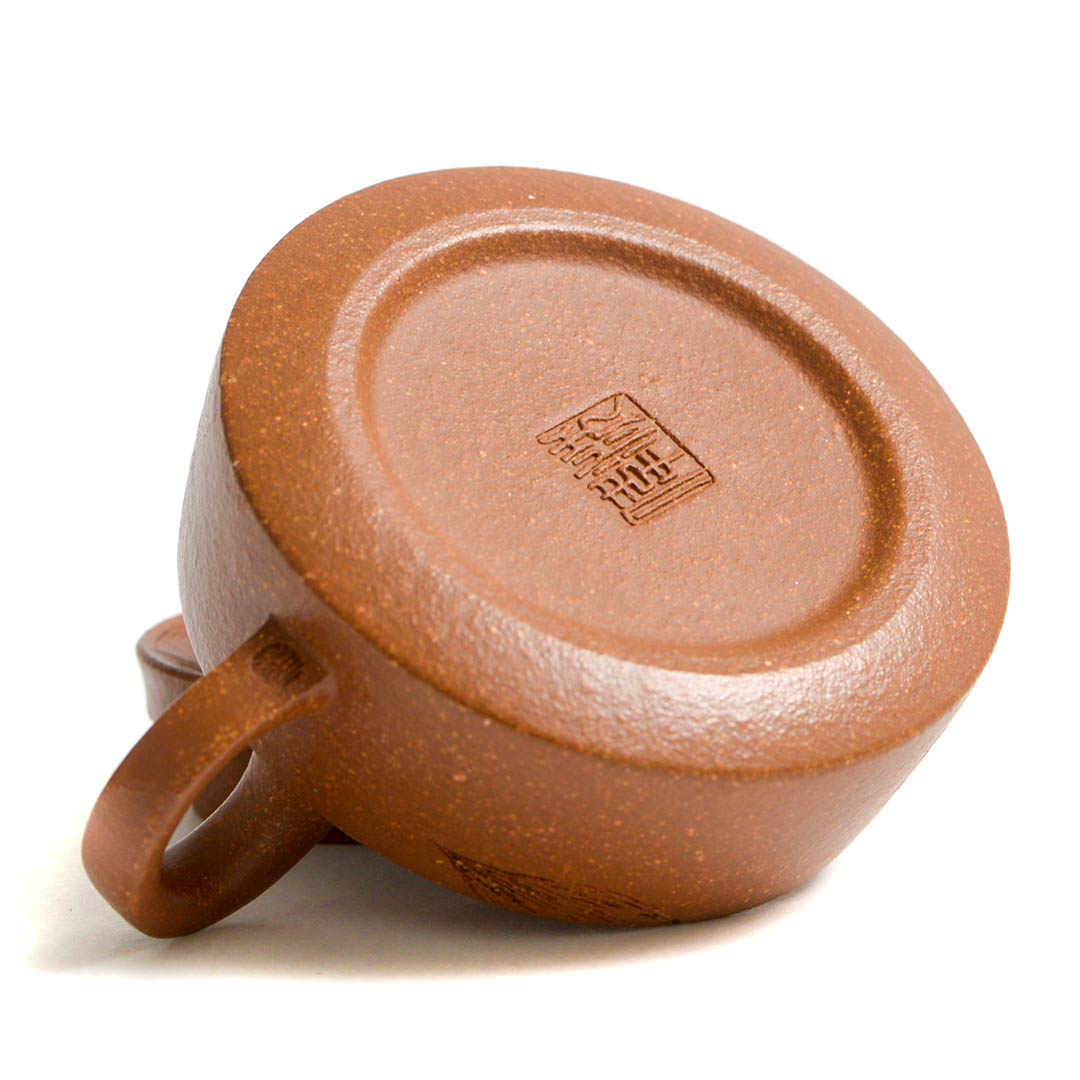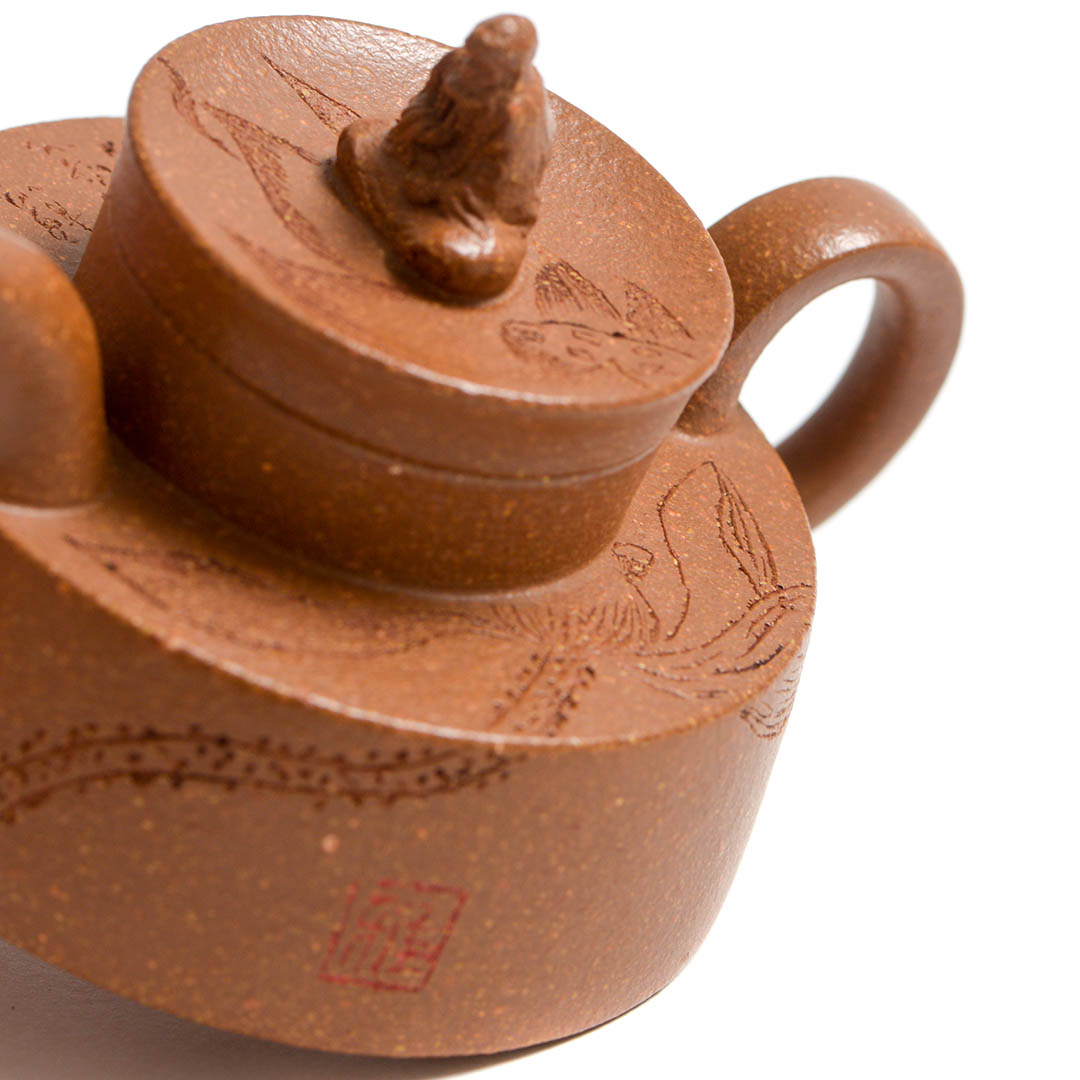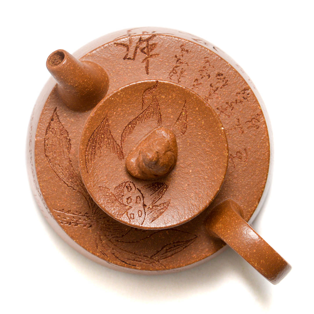 Выполнен из исинской глины Цзянь По Ни (Оранжевая или склоновая глина), как утверждает автор, вследствие неоднородности глины, поры, образующиеся на границе между различными фракциями образуют более легкую и пористую структуру. Это способствует быстрому нагреванию и более долгому сохранению тепла, что полезно, как для поддержания температуры воды, так и для более полного раскрытия вкуса и аромата чая. От себя можем добавить, что чайник действительно намного легче, чем кажется.