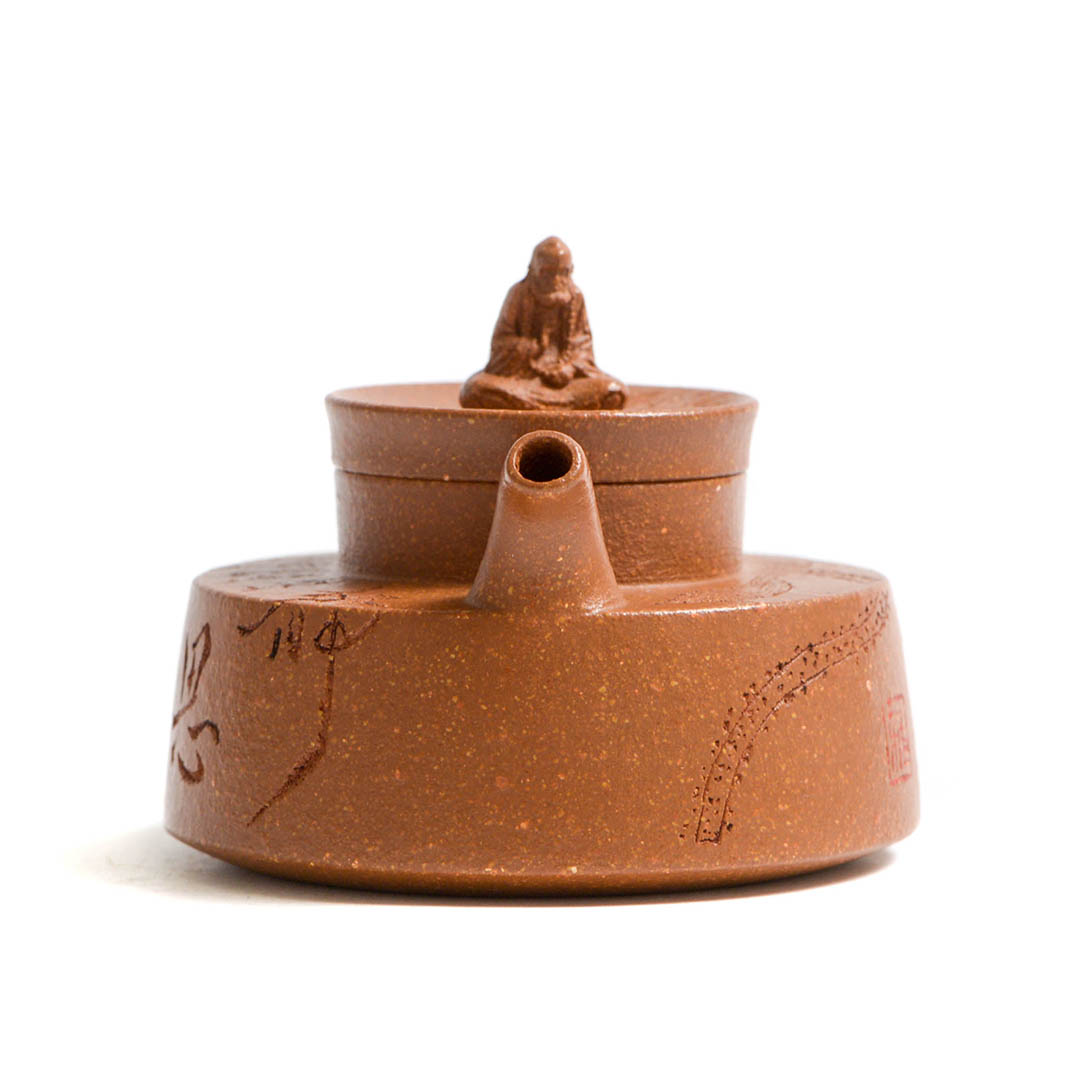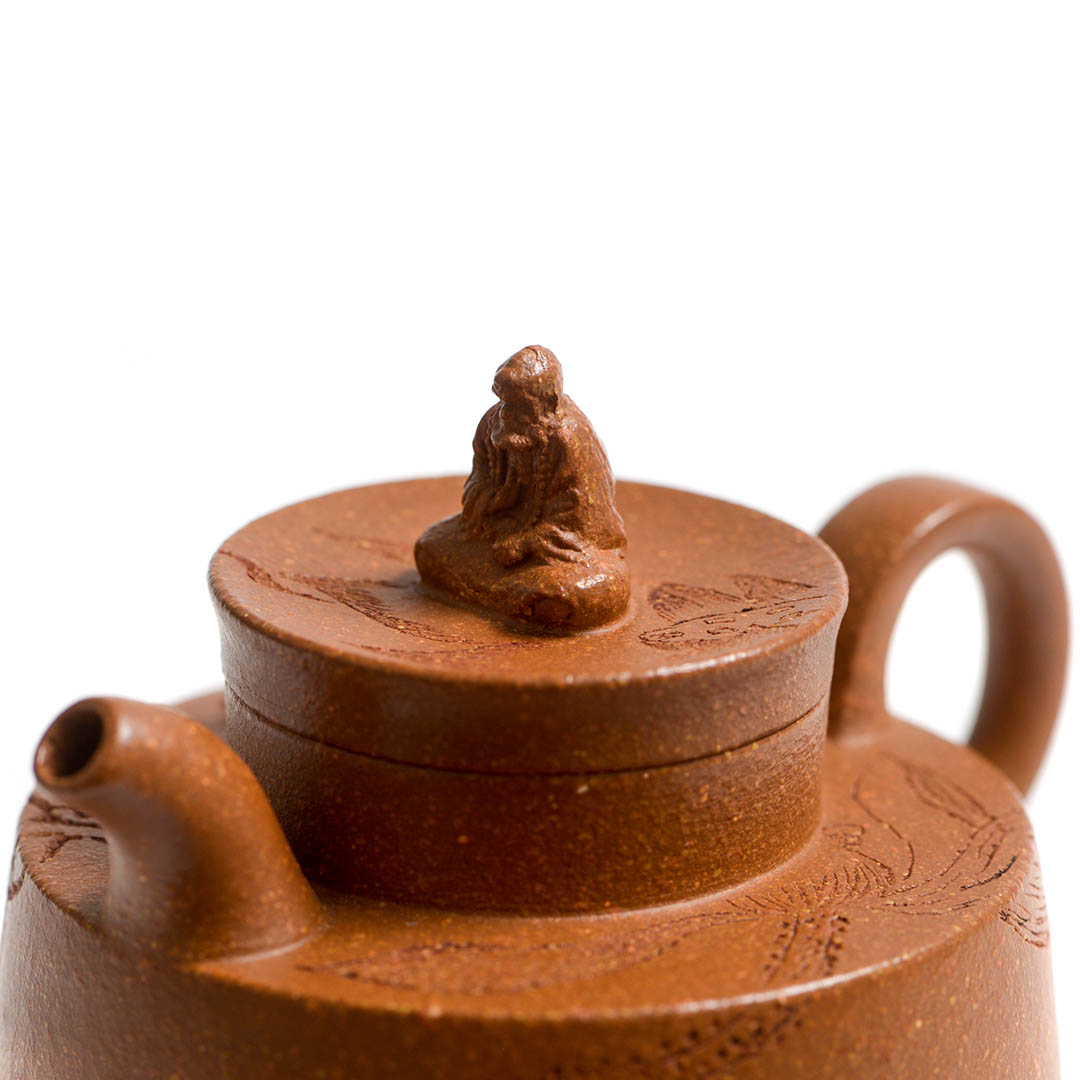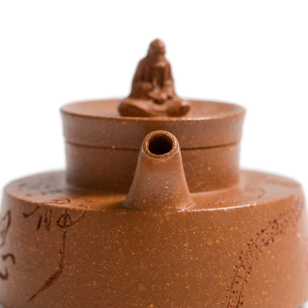 Крышечка чайника выполнена в виде Бодхидхарма или же Дамо с помощью техники Шоу Гун Дуй Хуэй. Это сложная ручная техника «насыпной» или «рельефной» росписи. Мастер слой за слоем наносит густую глину, создавая объемное, почти скульптурное изображение на поверхности чайника. Дамо, сидящий в позе медитации, — это символ непоколебимой воли, глубочайшего сосредоточения и поиска просветления. Его присутствие на чайнике превращает процесс чаепития в акт медитации, напоминая о необходимости отбросить суетные мысли и погрузиться в настоящее мгновение. Сочетание Дамо (непоколебимый дух) и Лотоса (чистота и просветление) создает мощный визуальный манифест чань-буддизма.