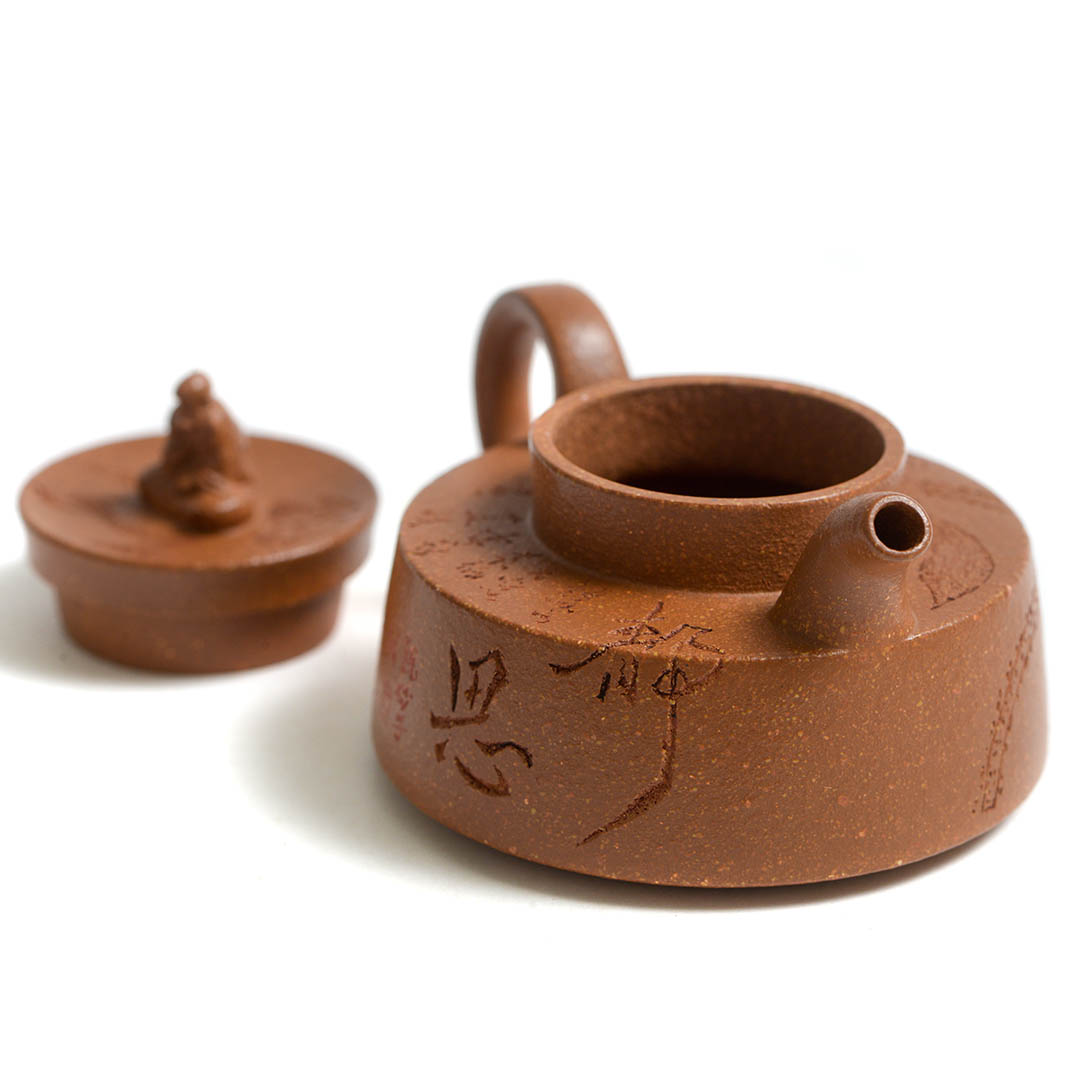 Иероглифы на чайнике переводятся как «Созерцание в Тишине» — классическая конфуцианская мудрость из «Записок о поучении детям» Чжугэ Ляна. Это центральная тема всего чайника. «Созерцание в Тишине». Это призыв остановиться, утихомирить внутренний диалог и наблюдать за своими мыслями.